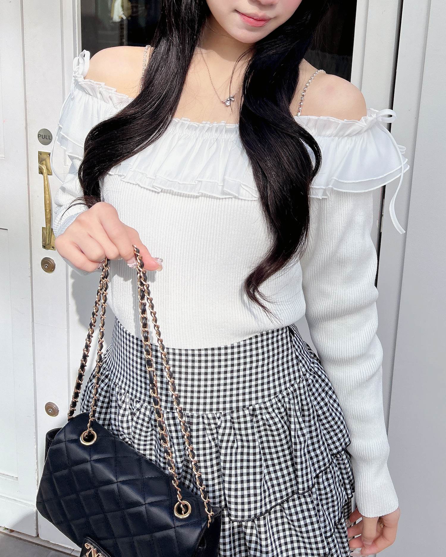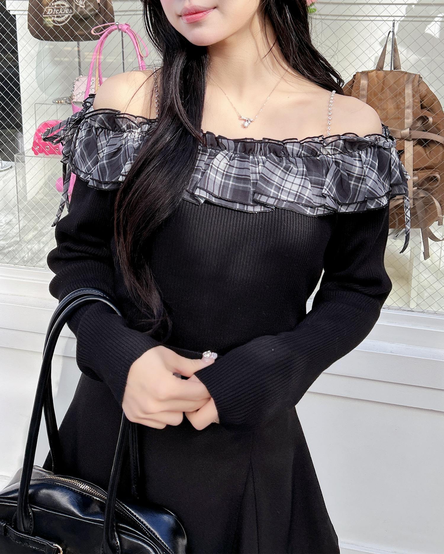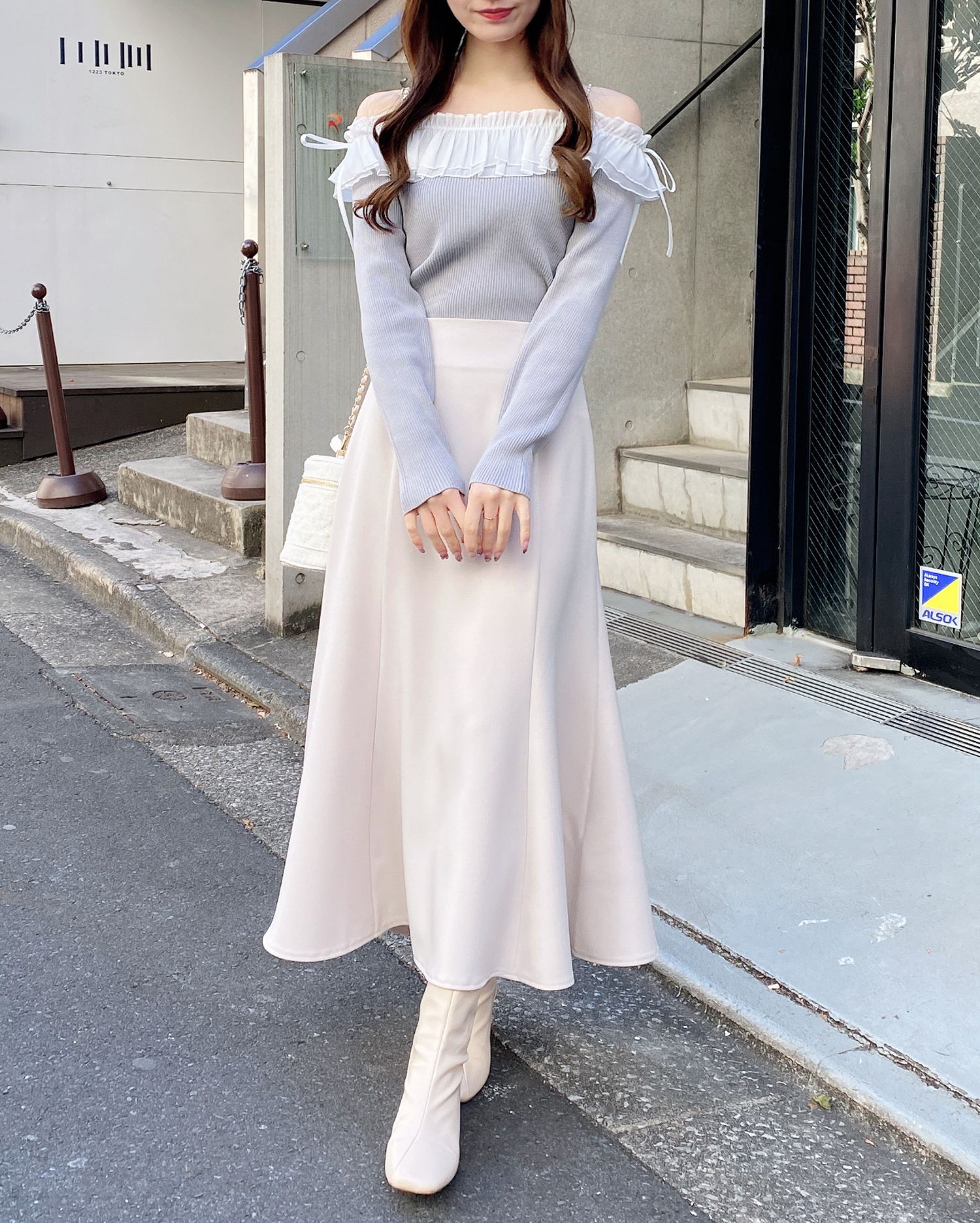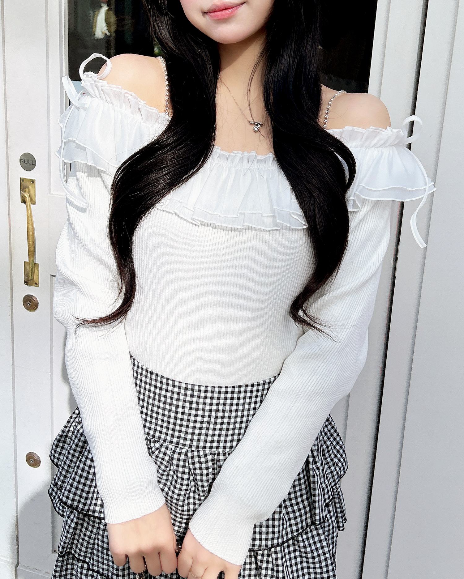デコルテ部分にたっぷりとあしらったフリルが存在感抜群のオフショルニット。