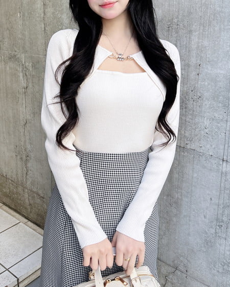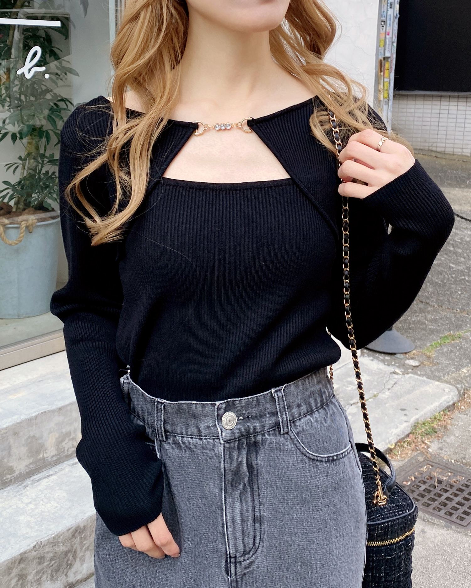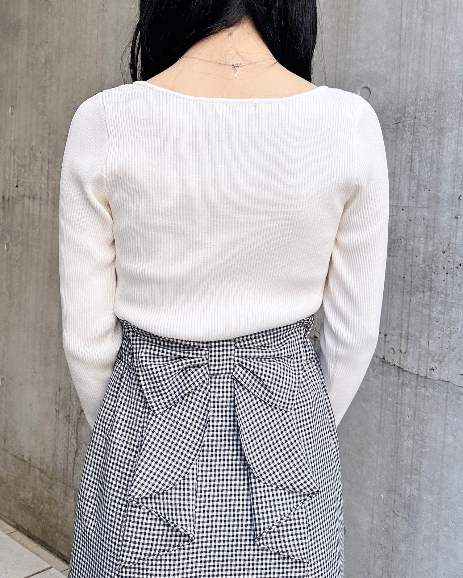 【デコルテ部分のビットが上品な印象を与えてくれるニットトップス】