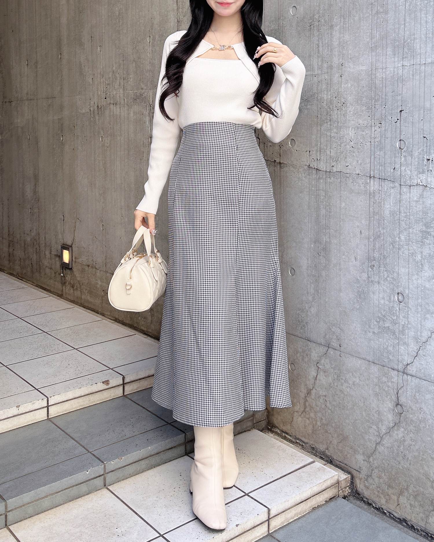 足元はブーツやパンプスを合わせれば大人っぽい印象に。