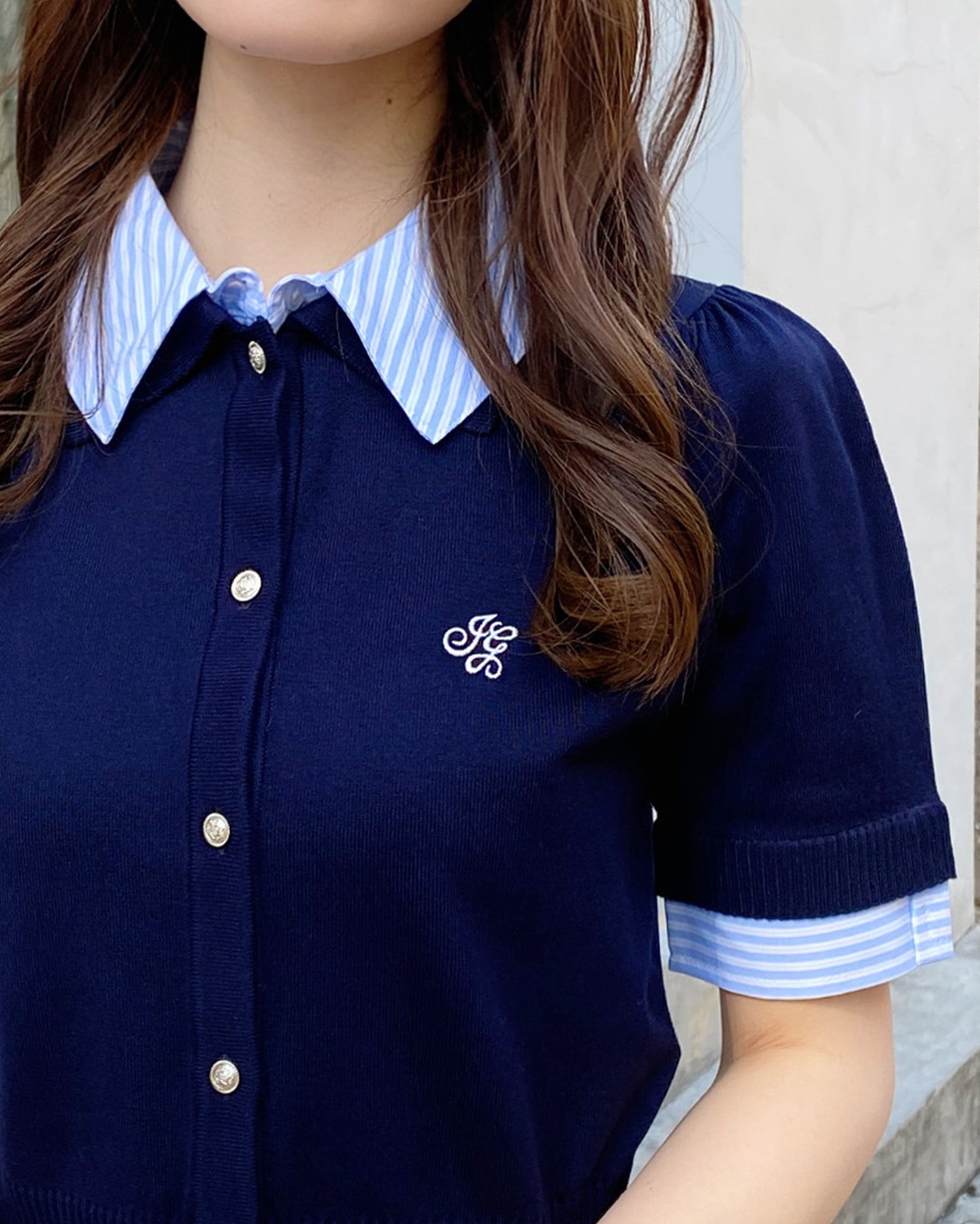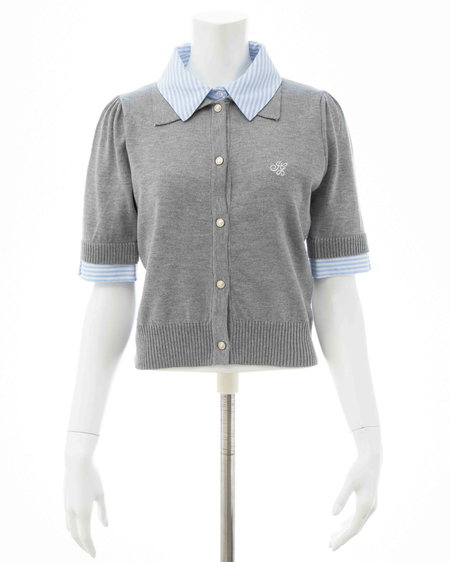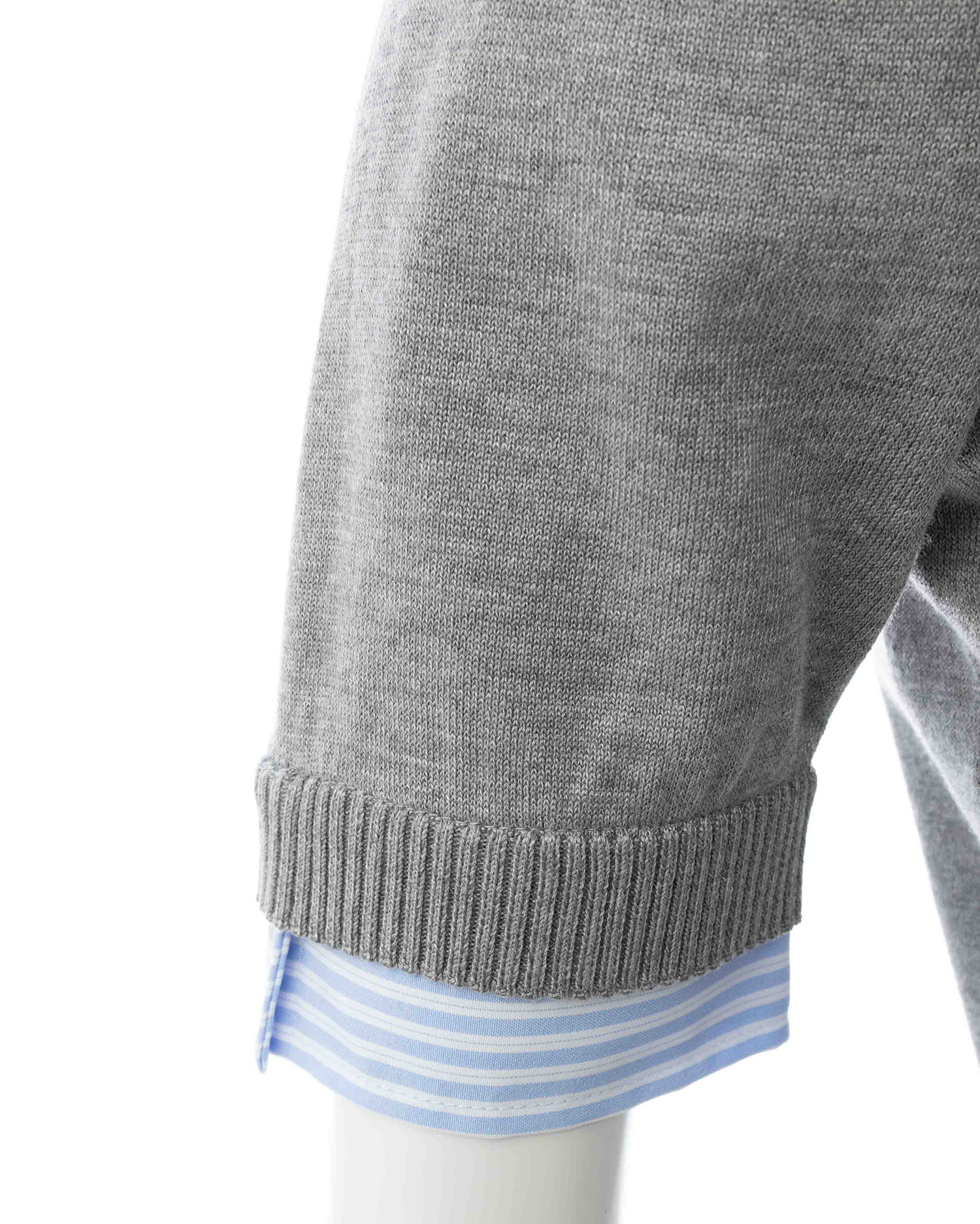 シャツにカーディガンを合わせたようなドッキングデザインで、