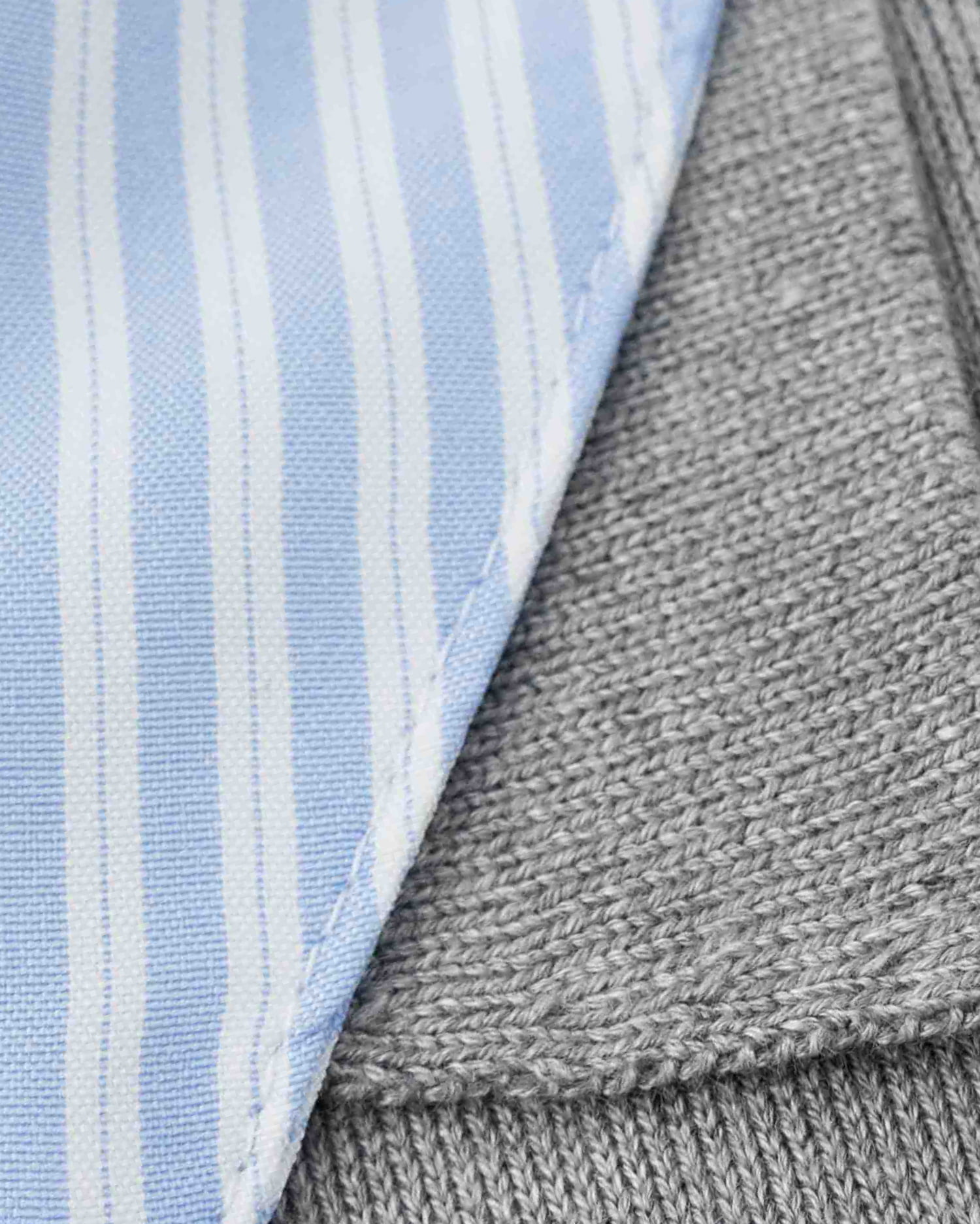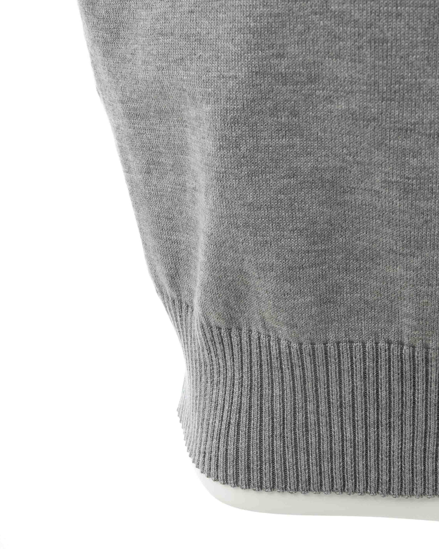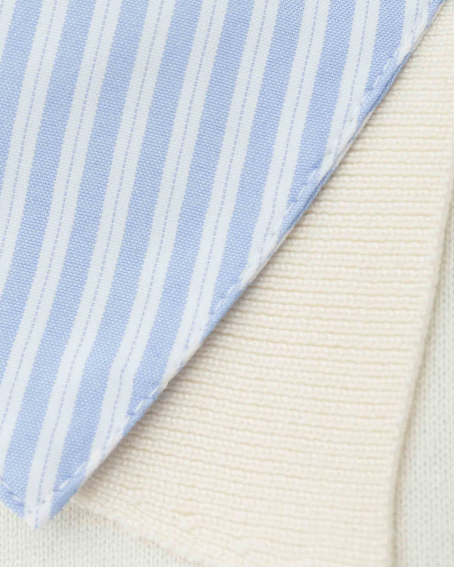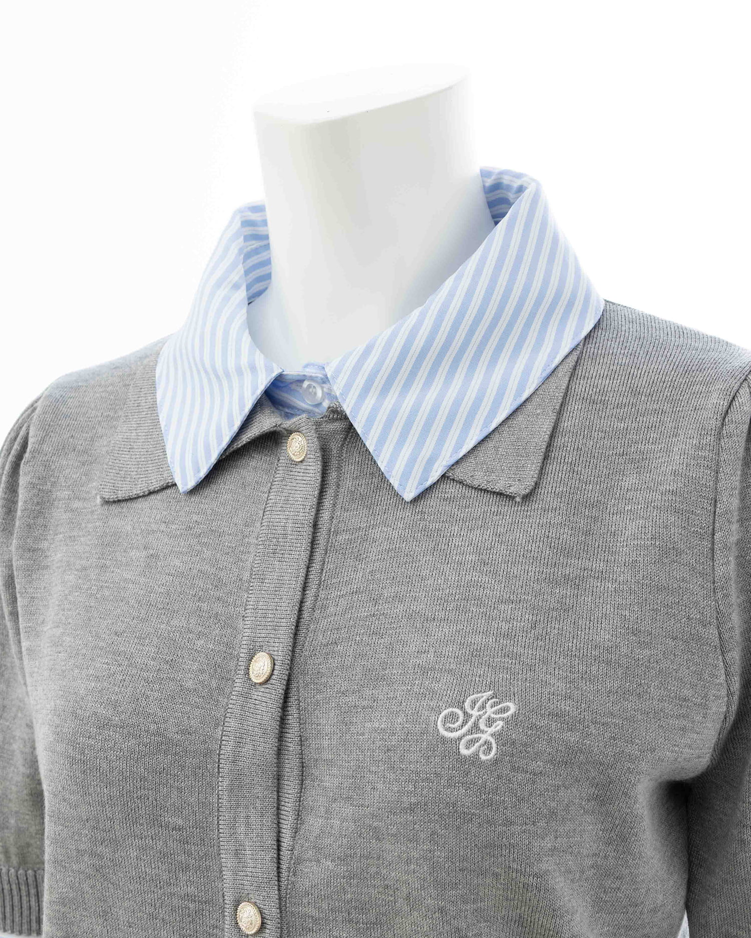 シャツにカーディガンを合わせたようなドッキングデザインで、