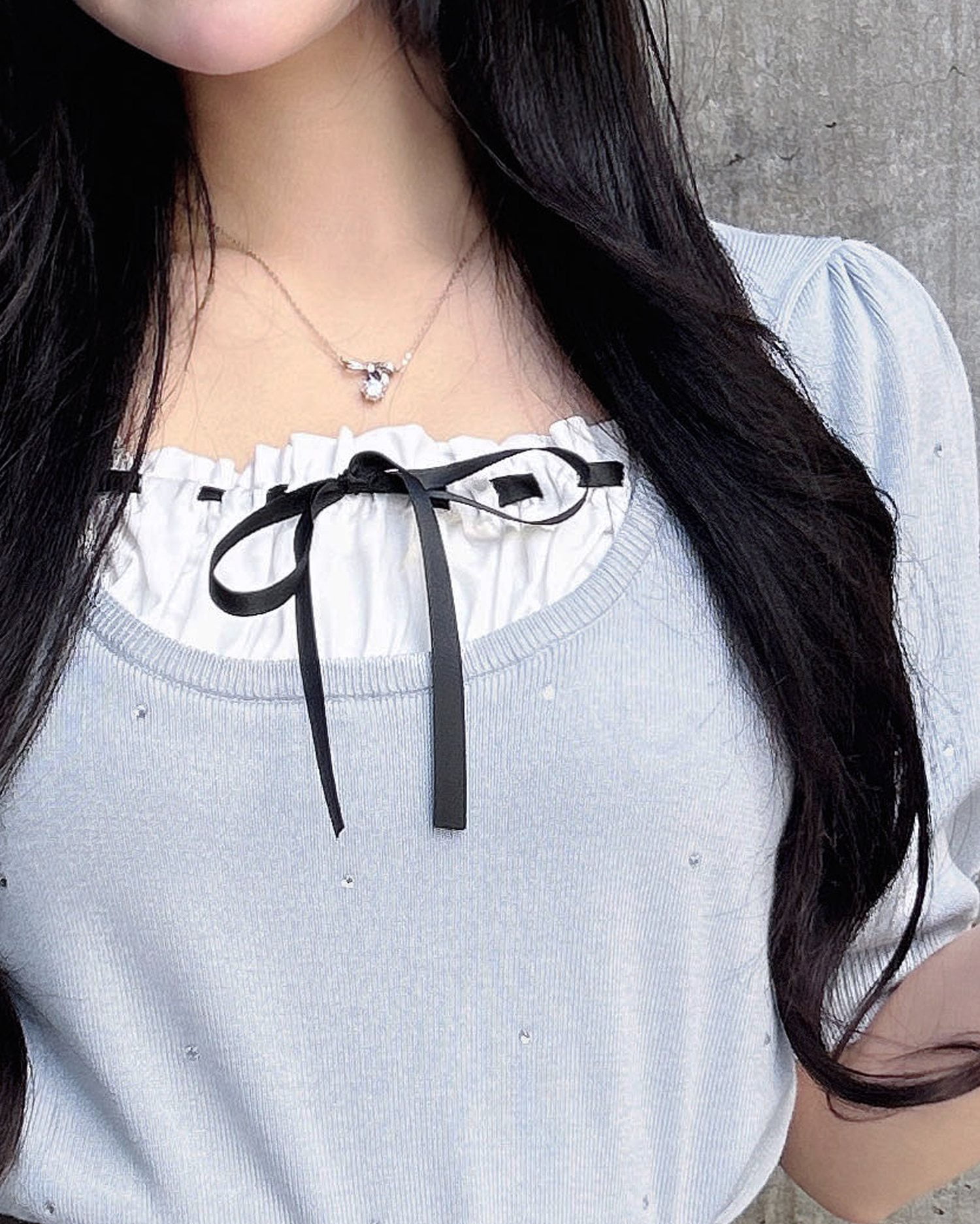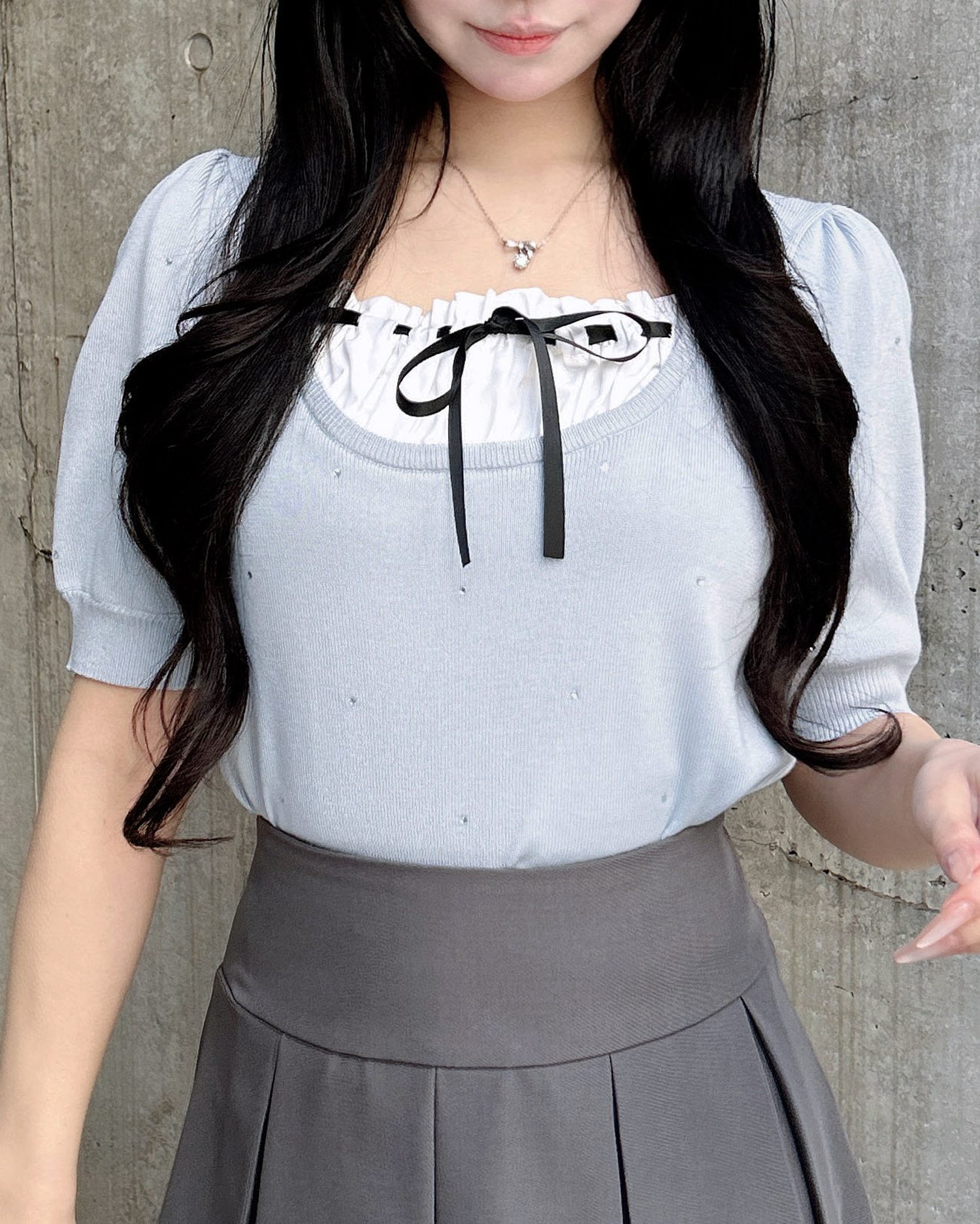 甘い印象の胸元フリルと、存在感ある少し長めのリボンが
