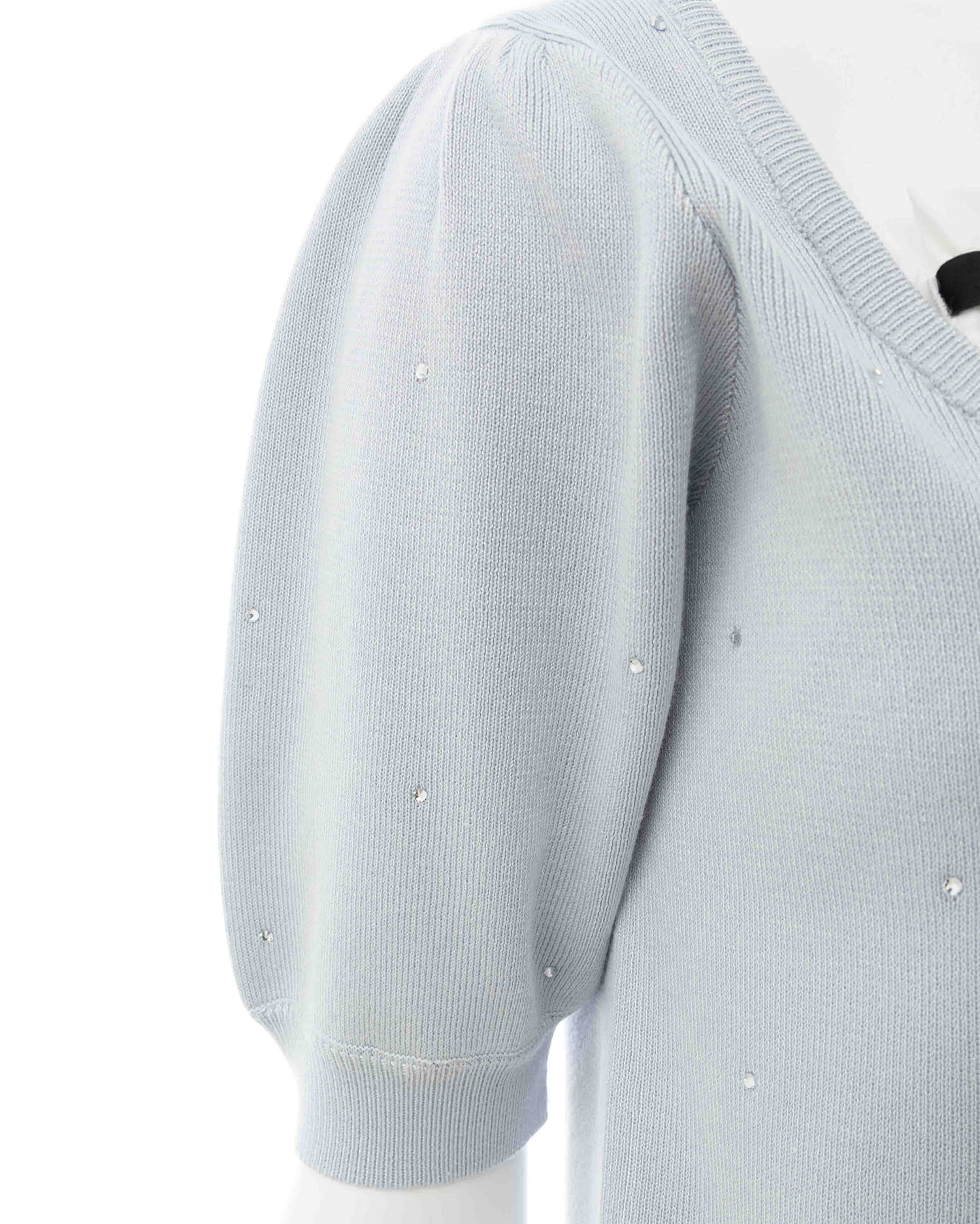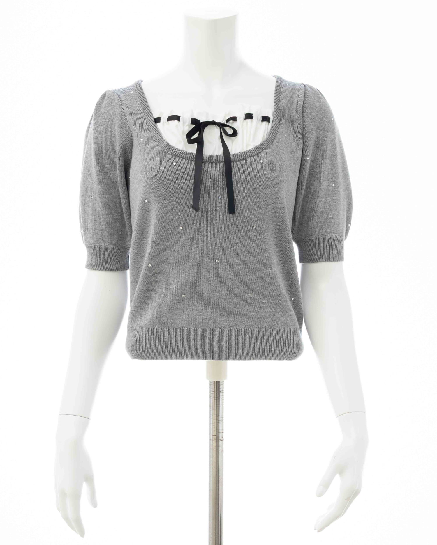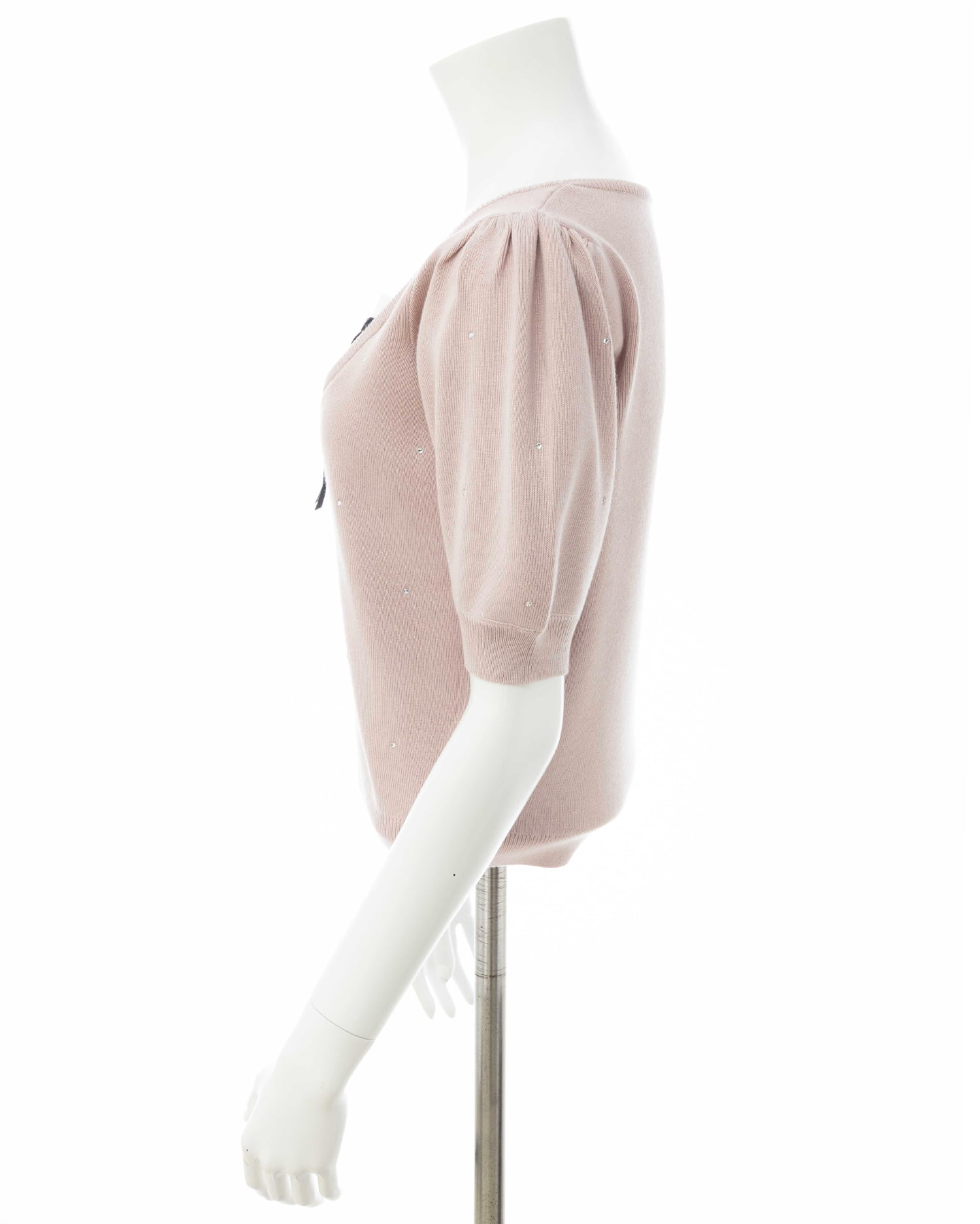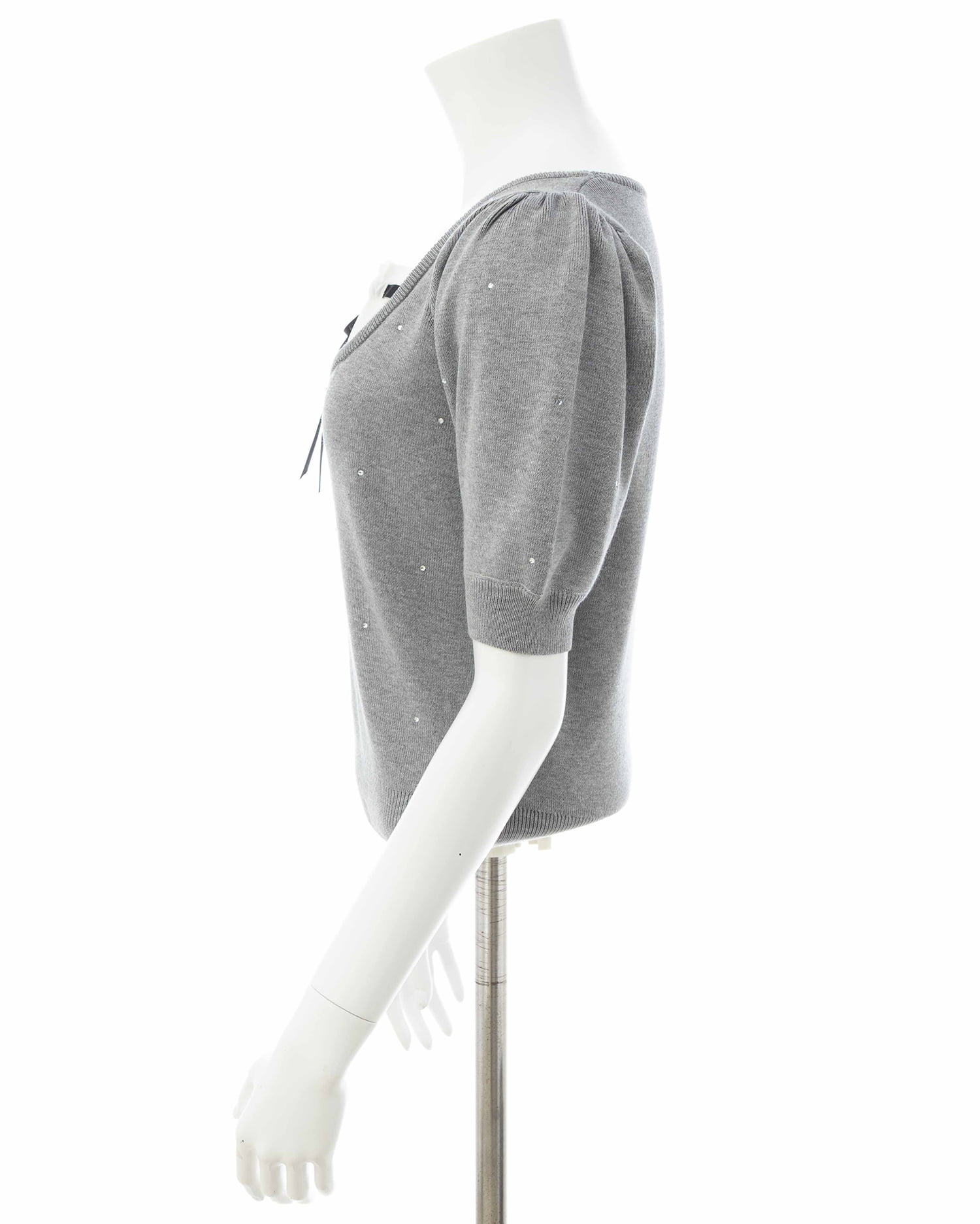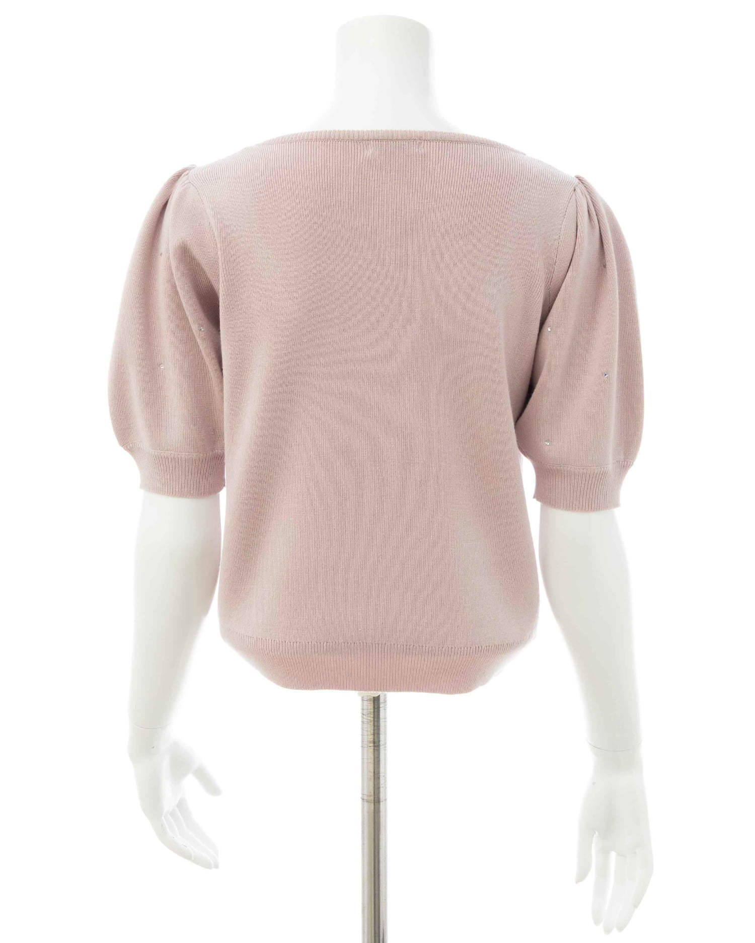 キラッと光るビジューが華やかな印象の半袖ニットトップス。