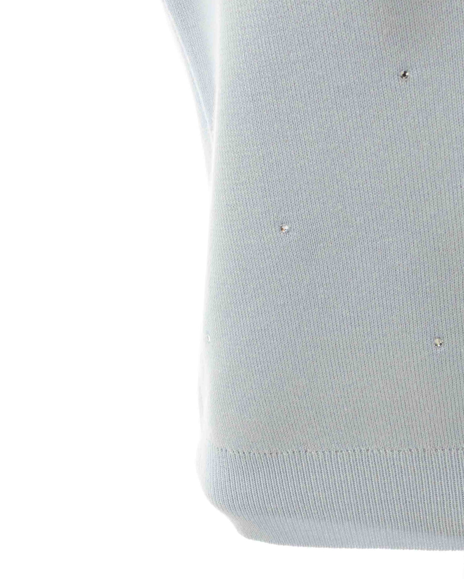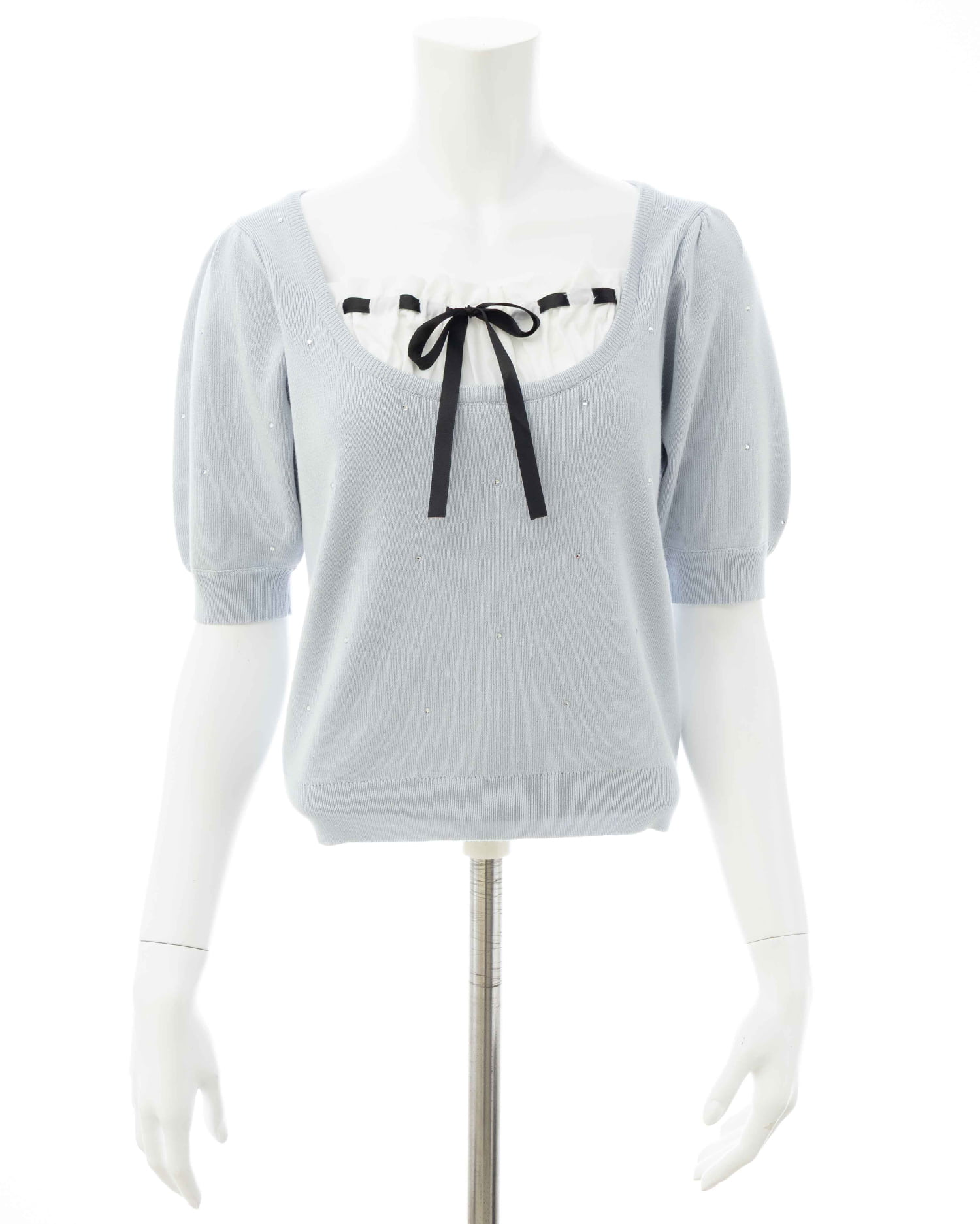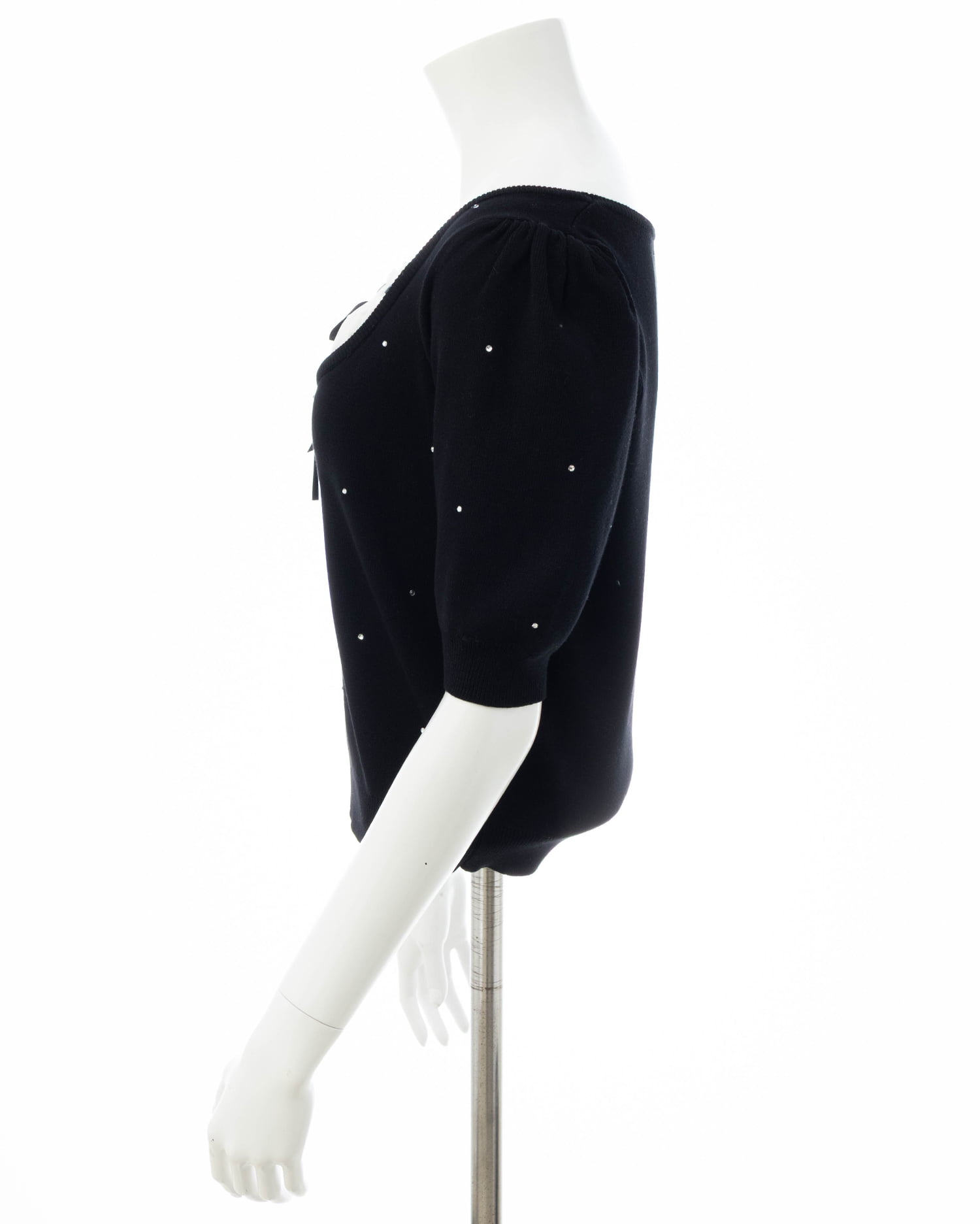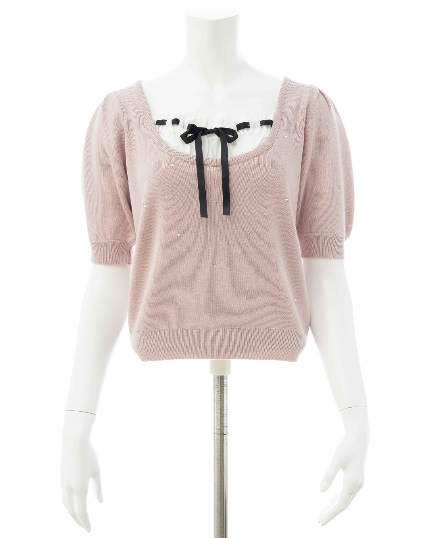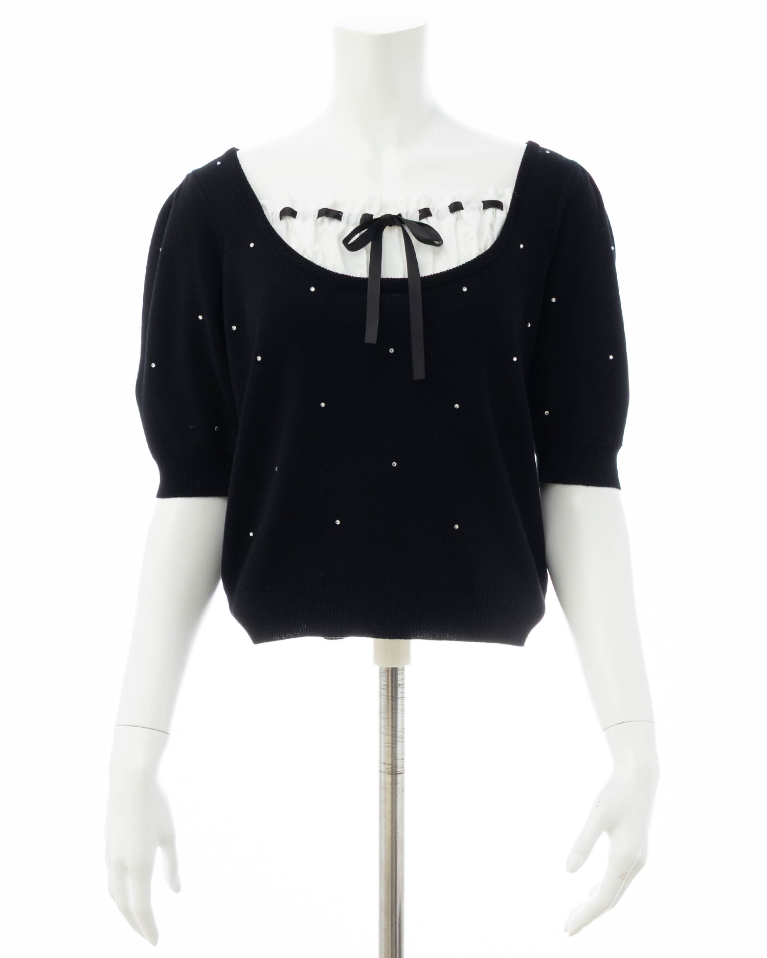 キラッと光るビジューが華やかな印象の半袖ニットトップス。