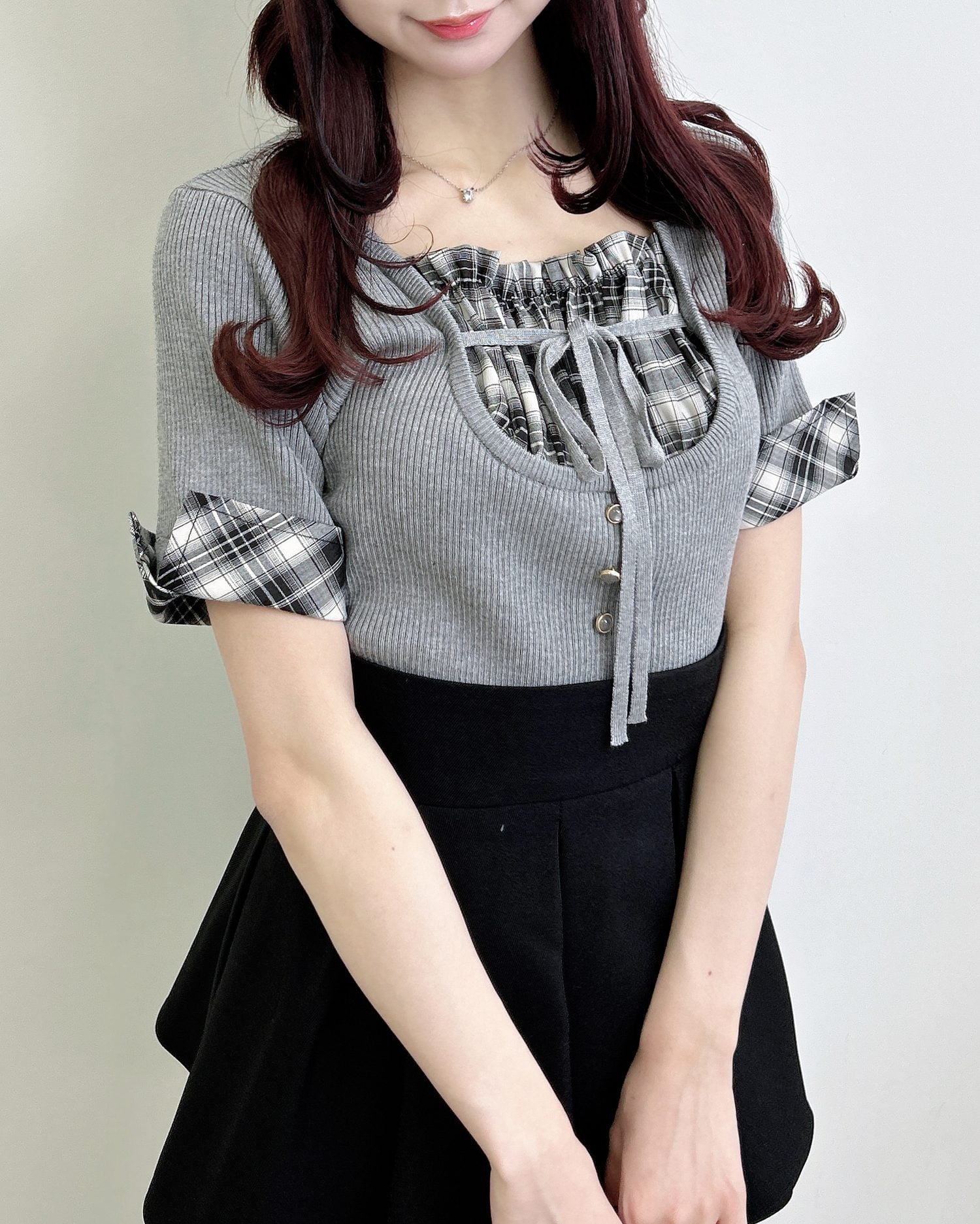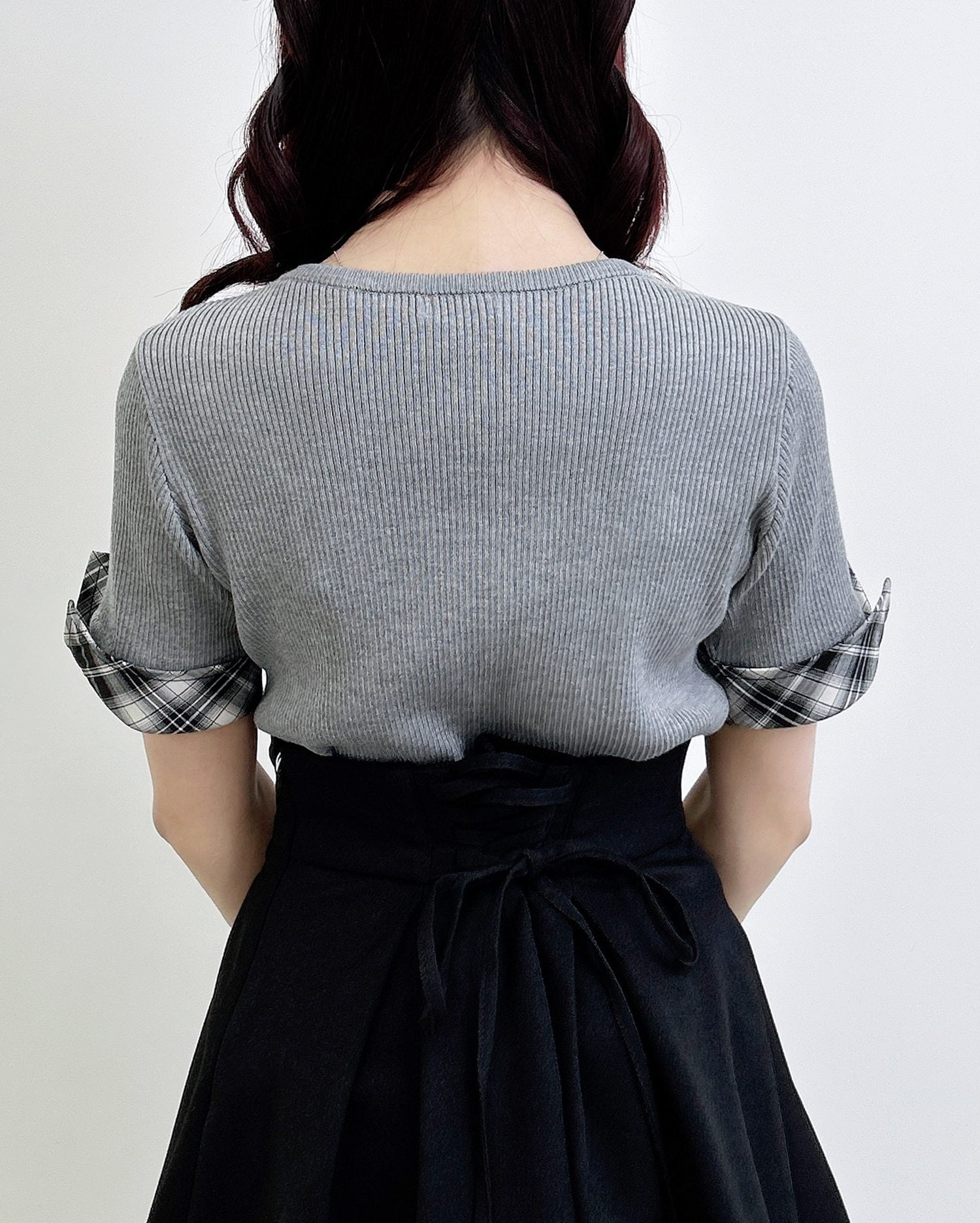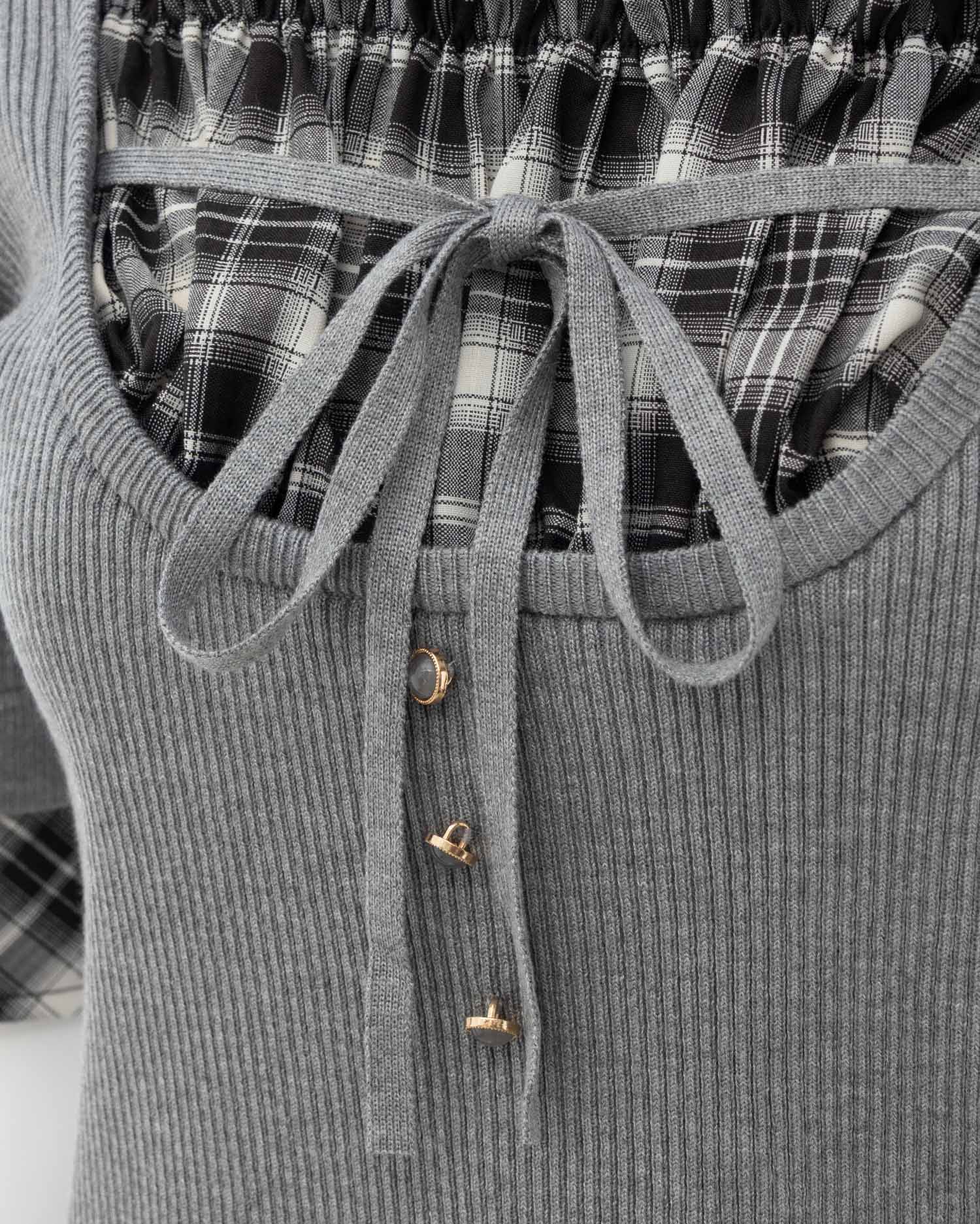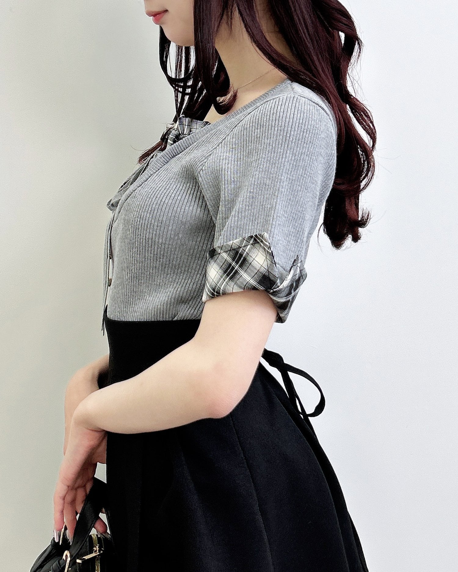 ニット部分は薄手の細リブで仕上げ、ボディラインにフィットして華奢見えを叶えます。