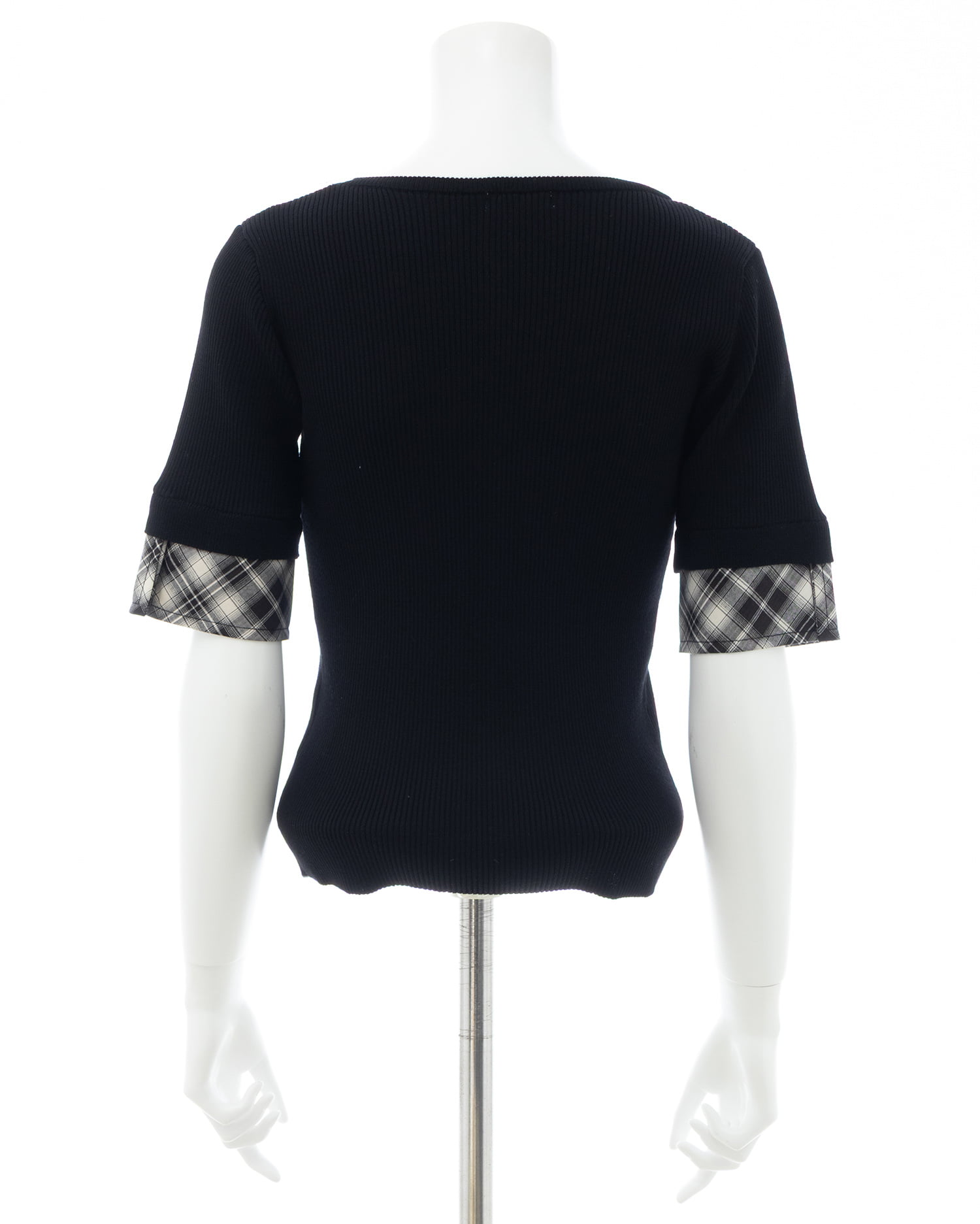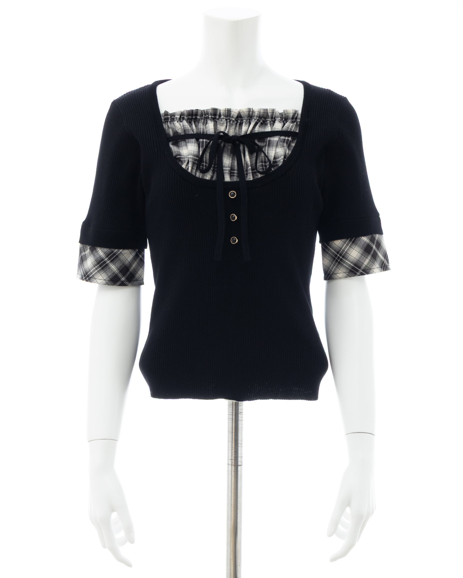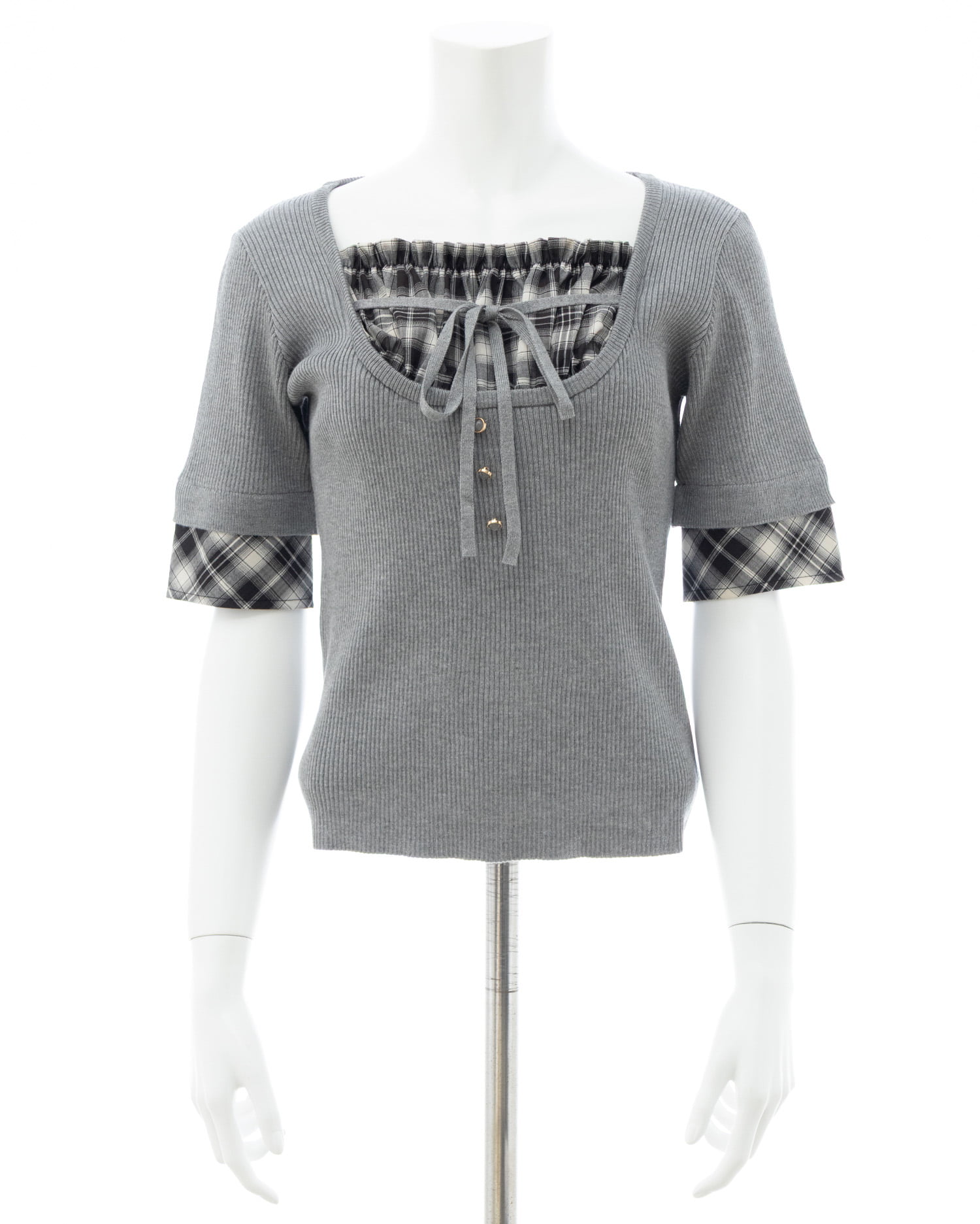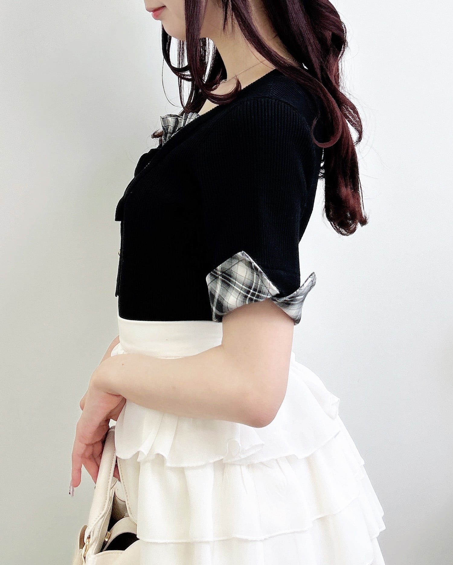 ニット部分は薄手の細リブで仕上げ、ボディラインにフィットして華奢見えを叶えます。