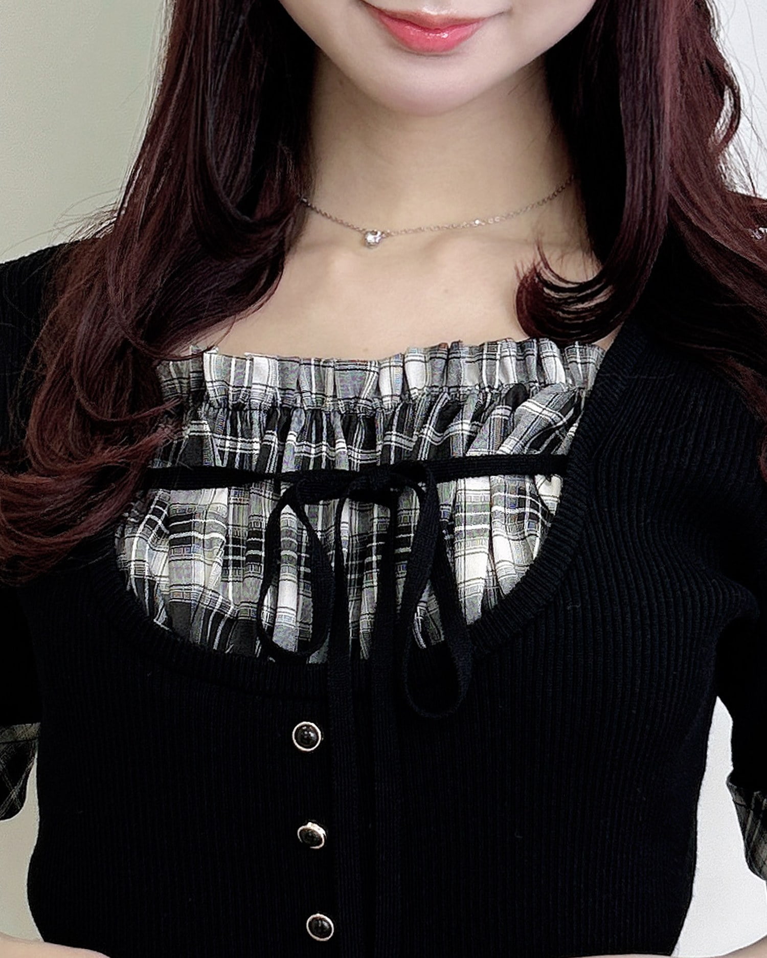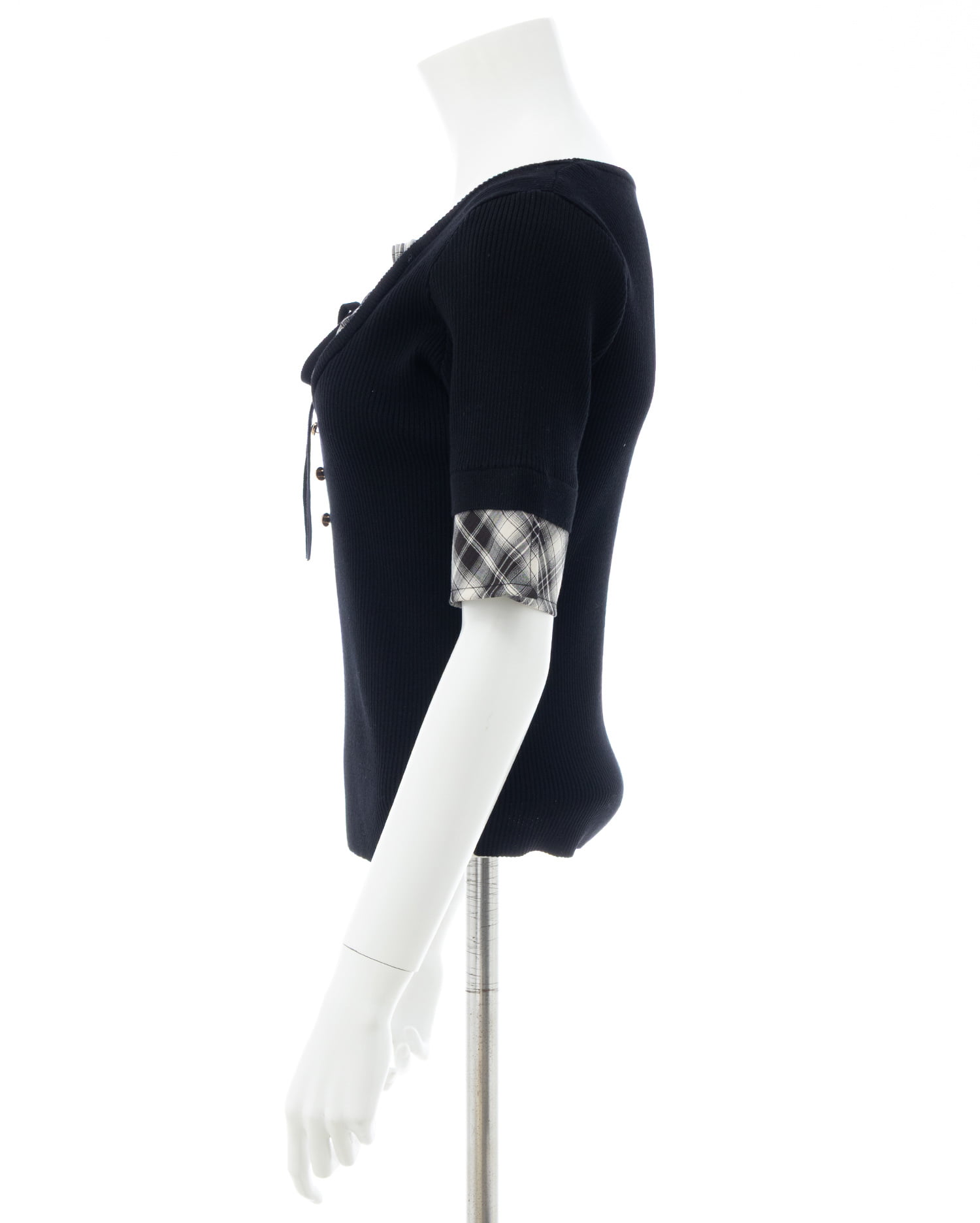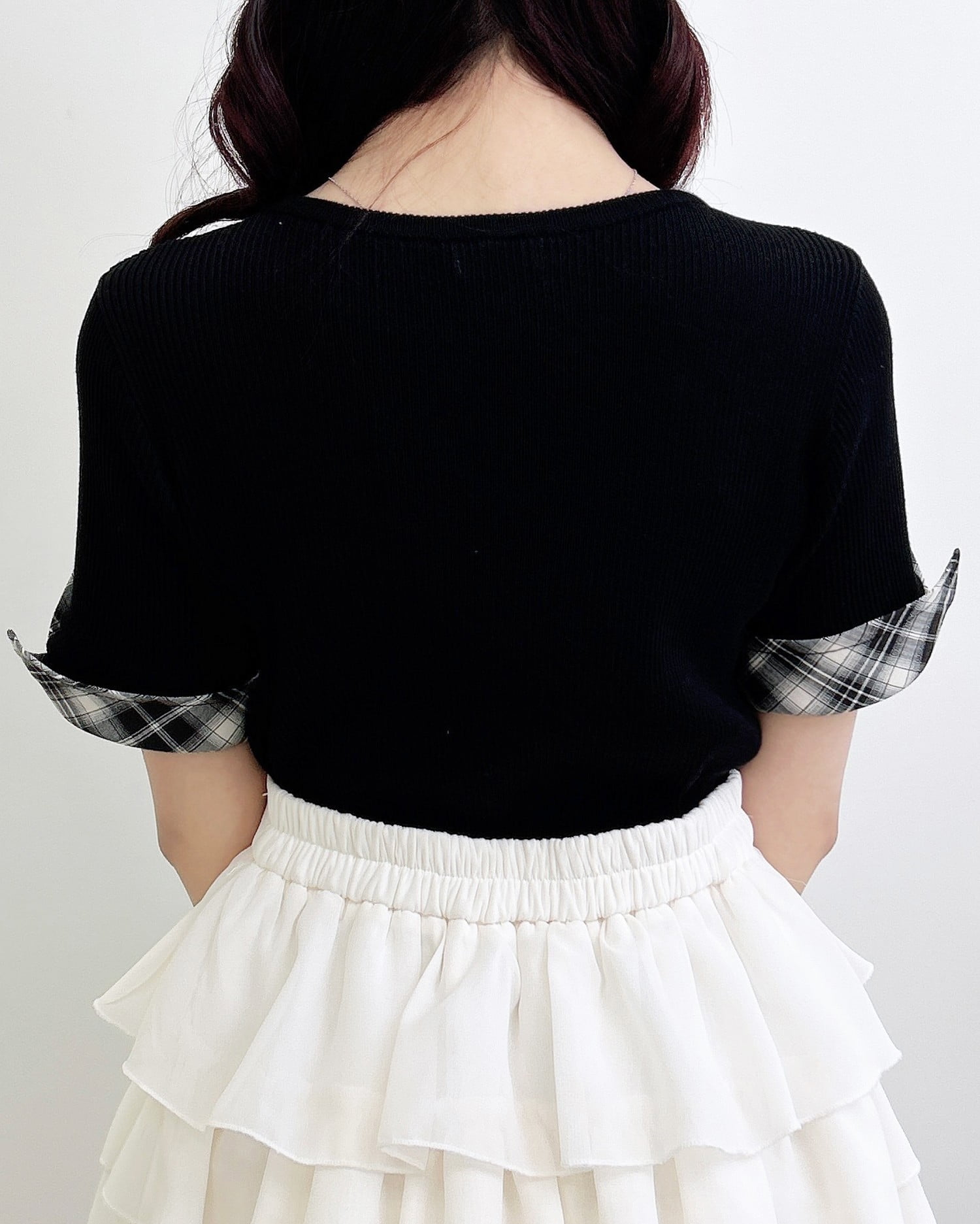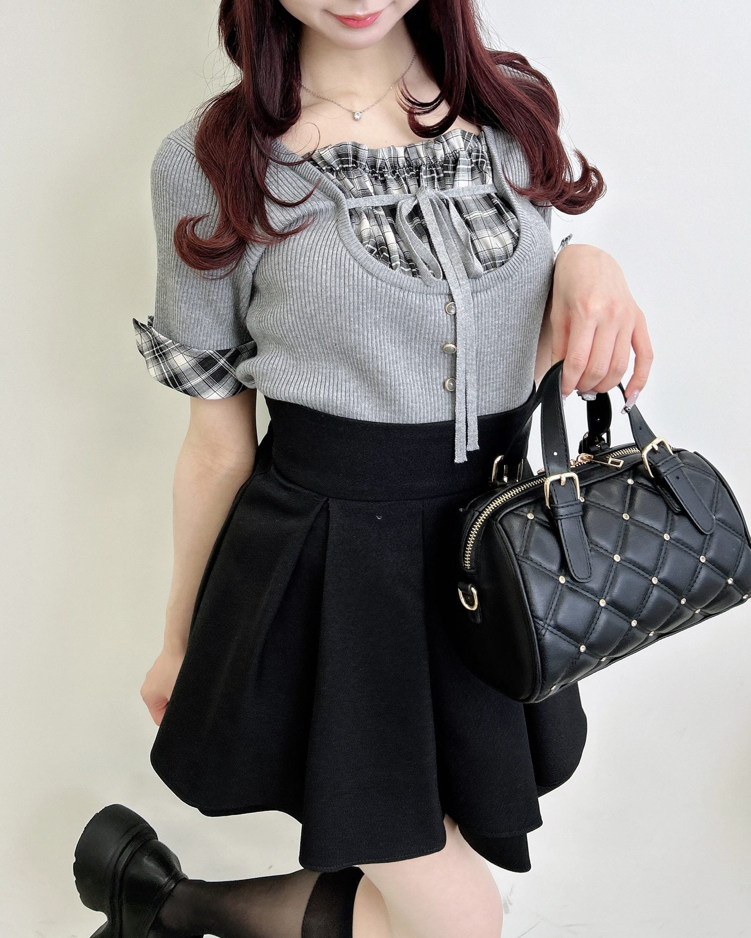 ニット部分は薄手の細リブで仕上げ、ボディラインにフィットして華奢見えを叶えます。