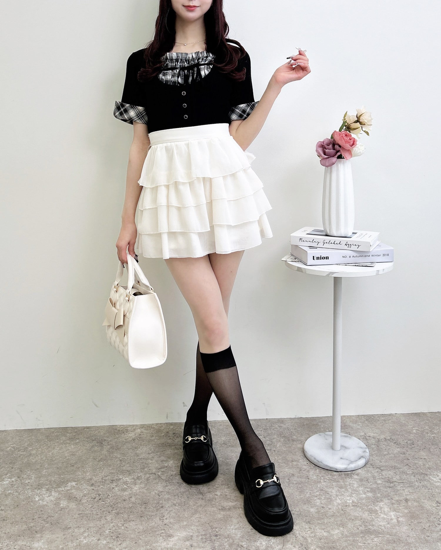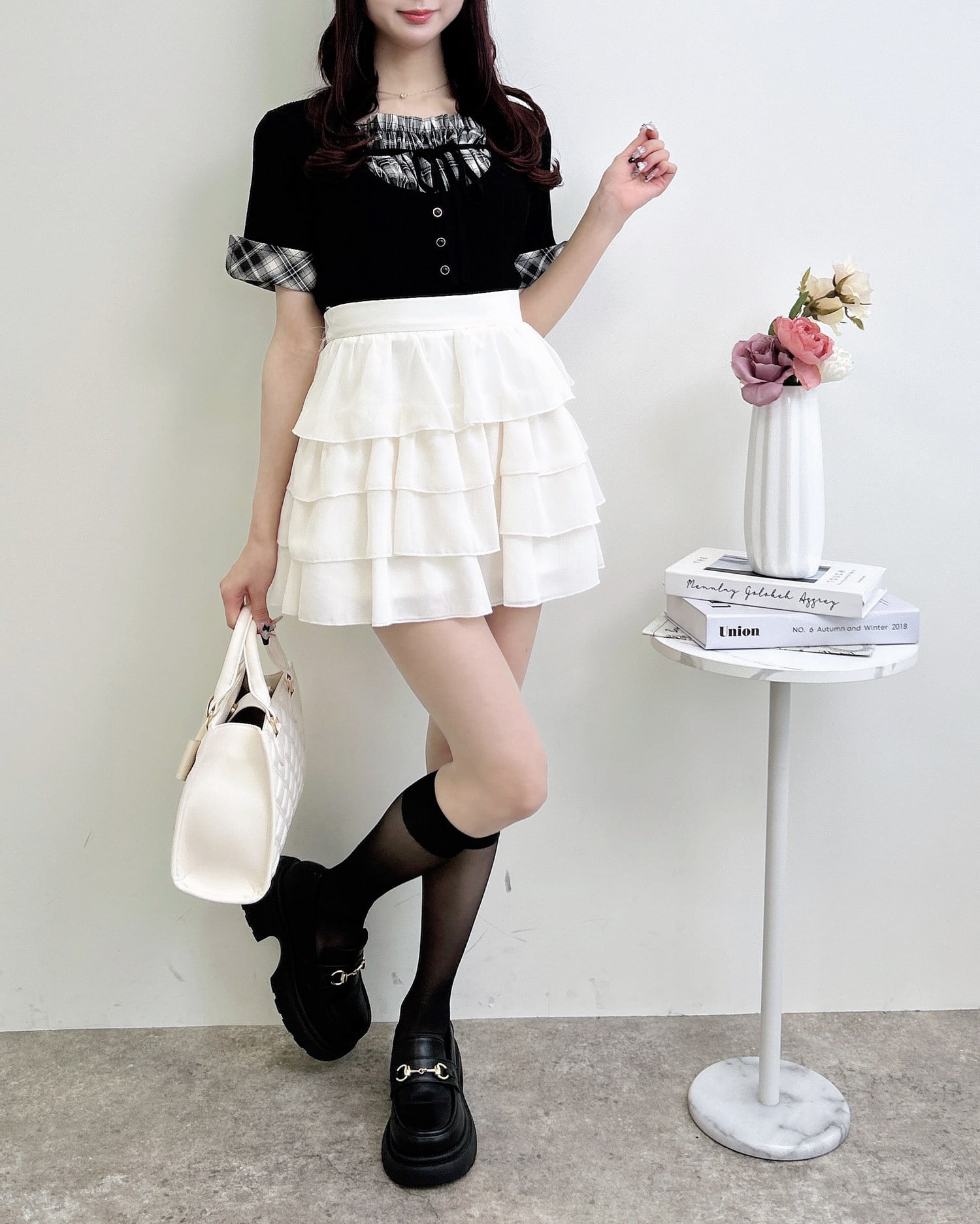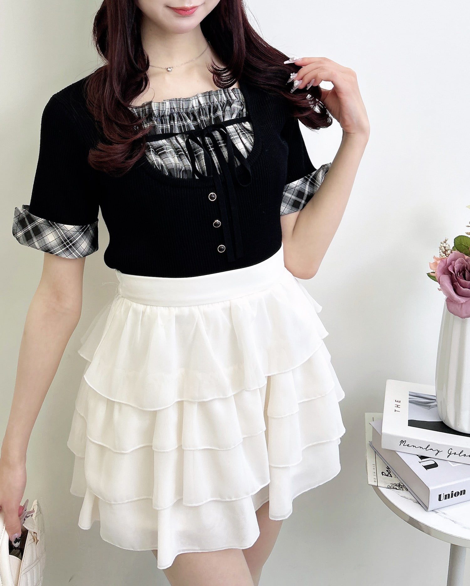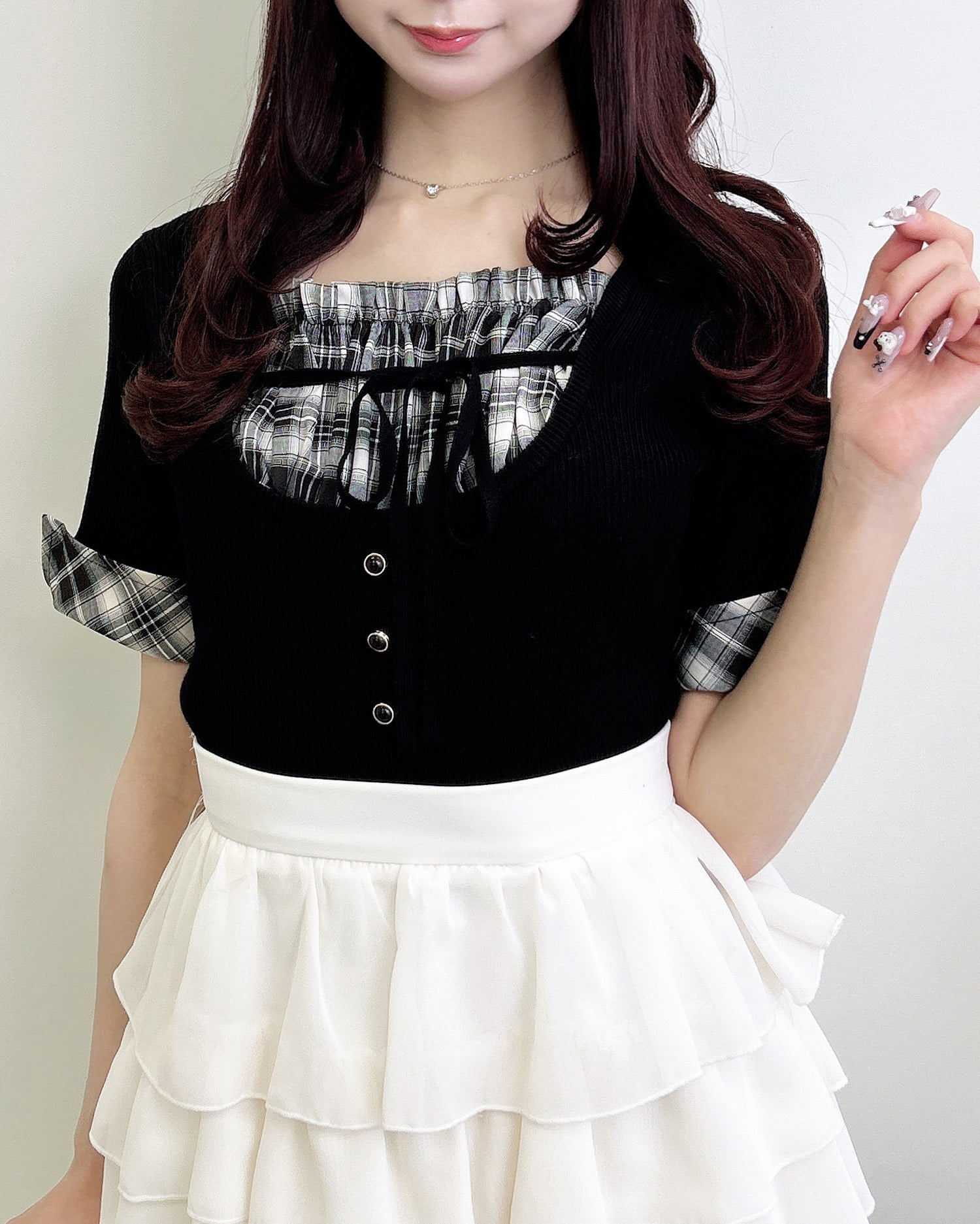 ニット部分は薄手の細リブで仕上げ、ボディラインにフィットして華奢見えを叶えます。
