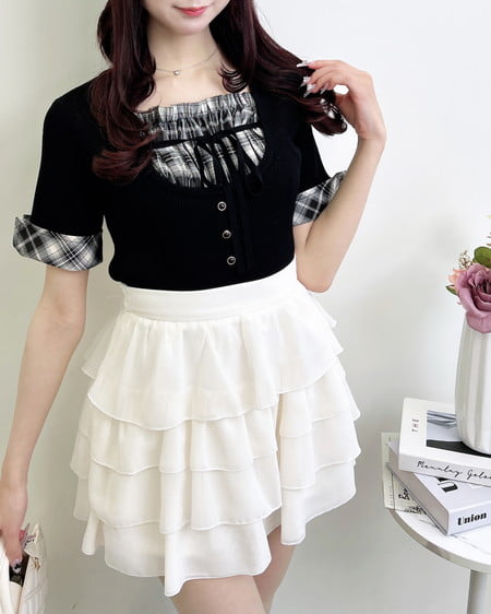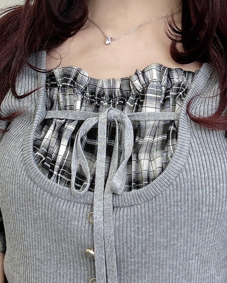 胸元にあしらったチェックの別布上部にはゴム入り。