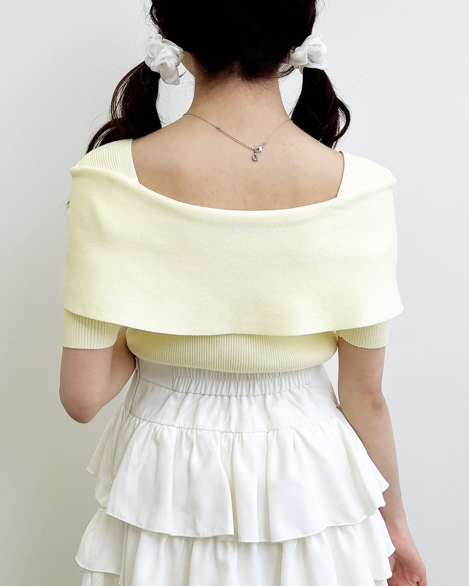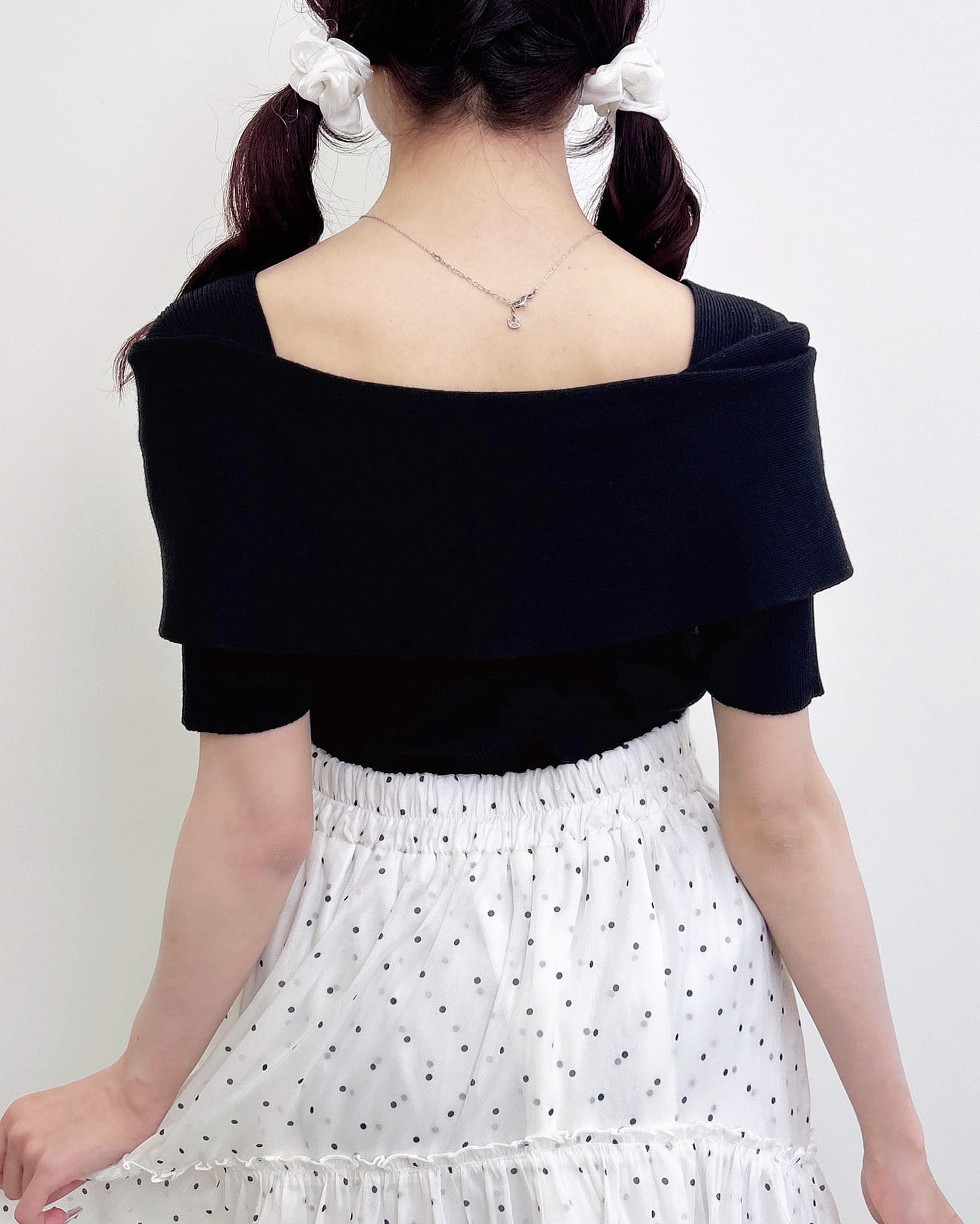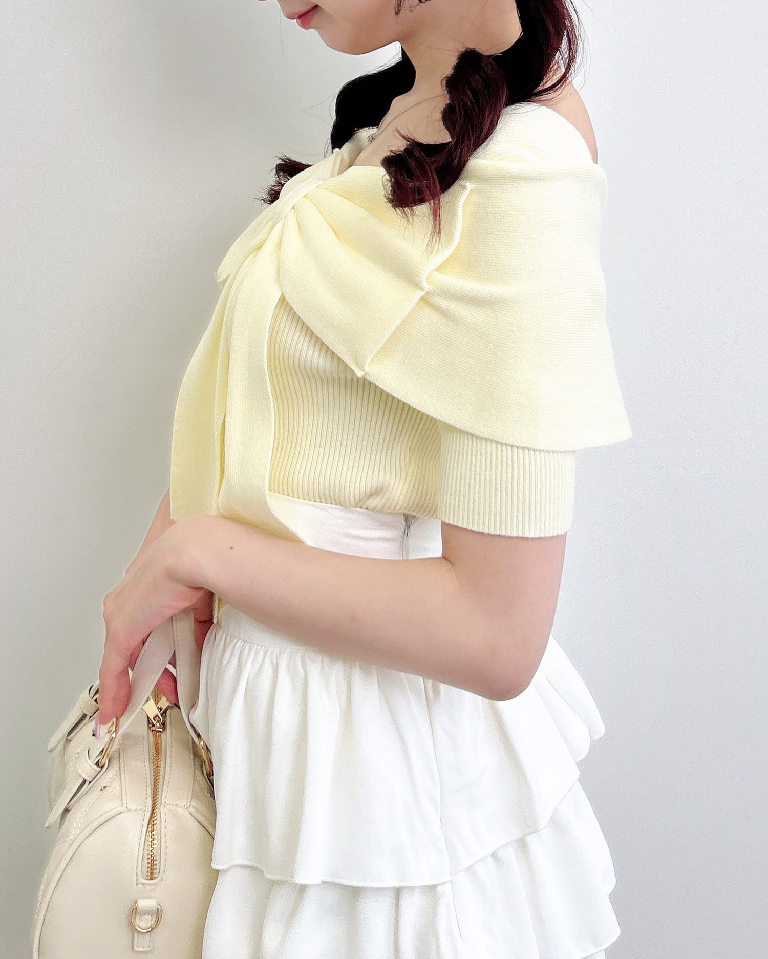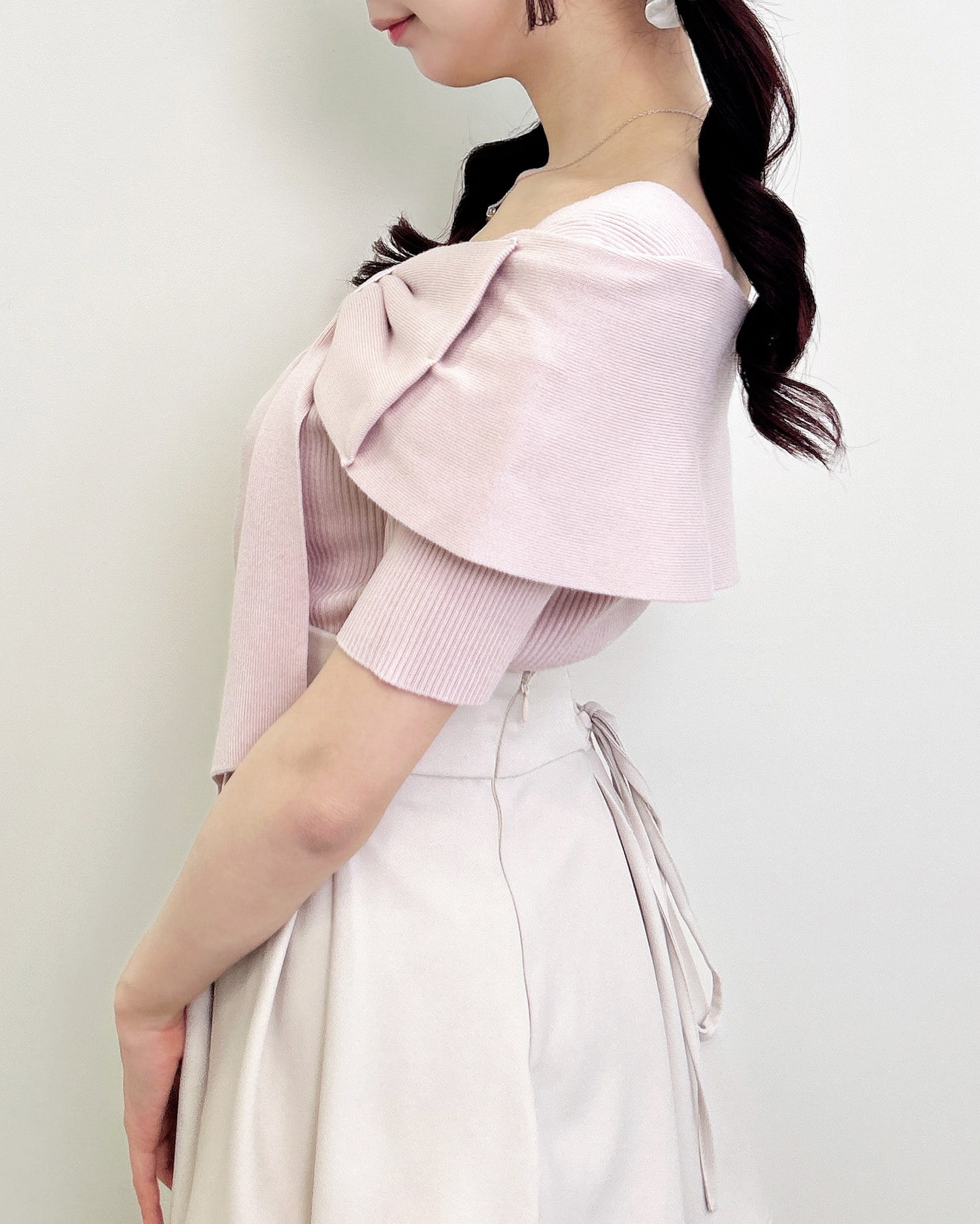 オフショルのリボンの下がり紐部分は取り外し可能。