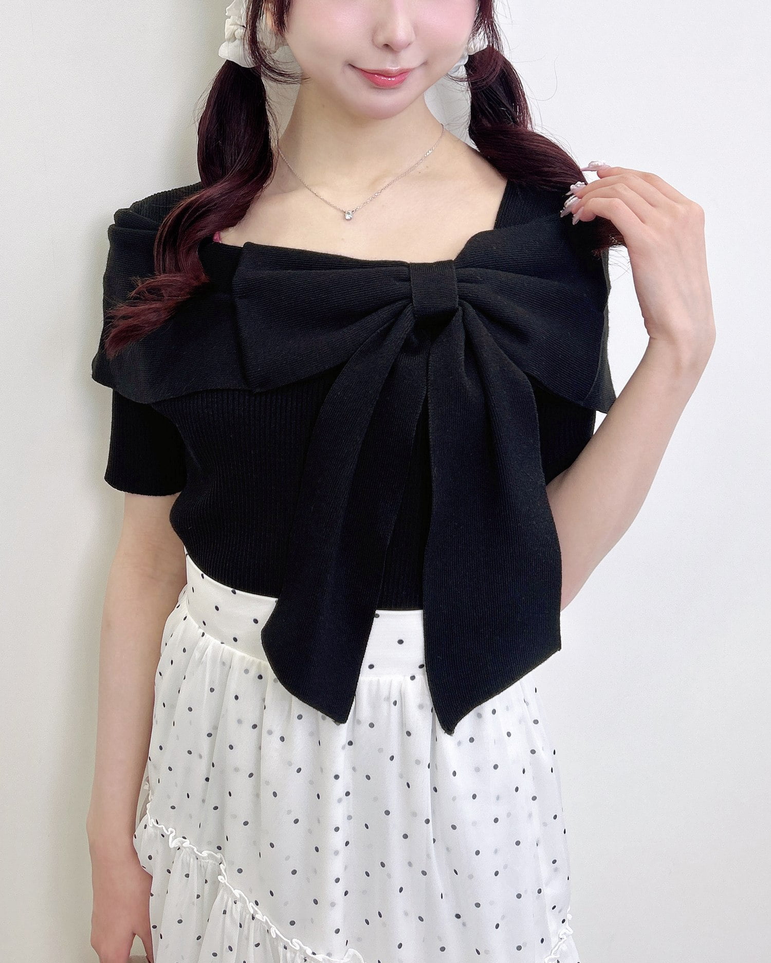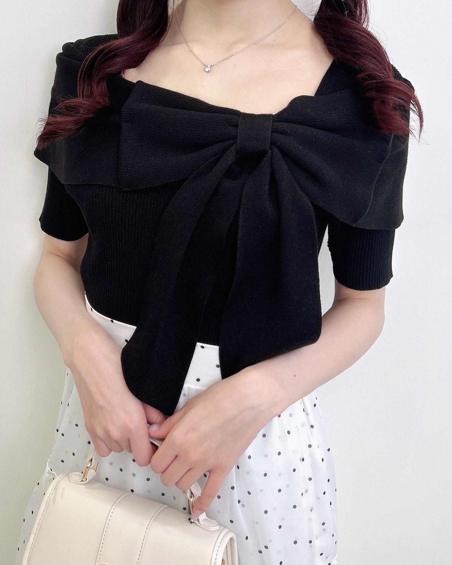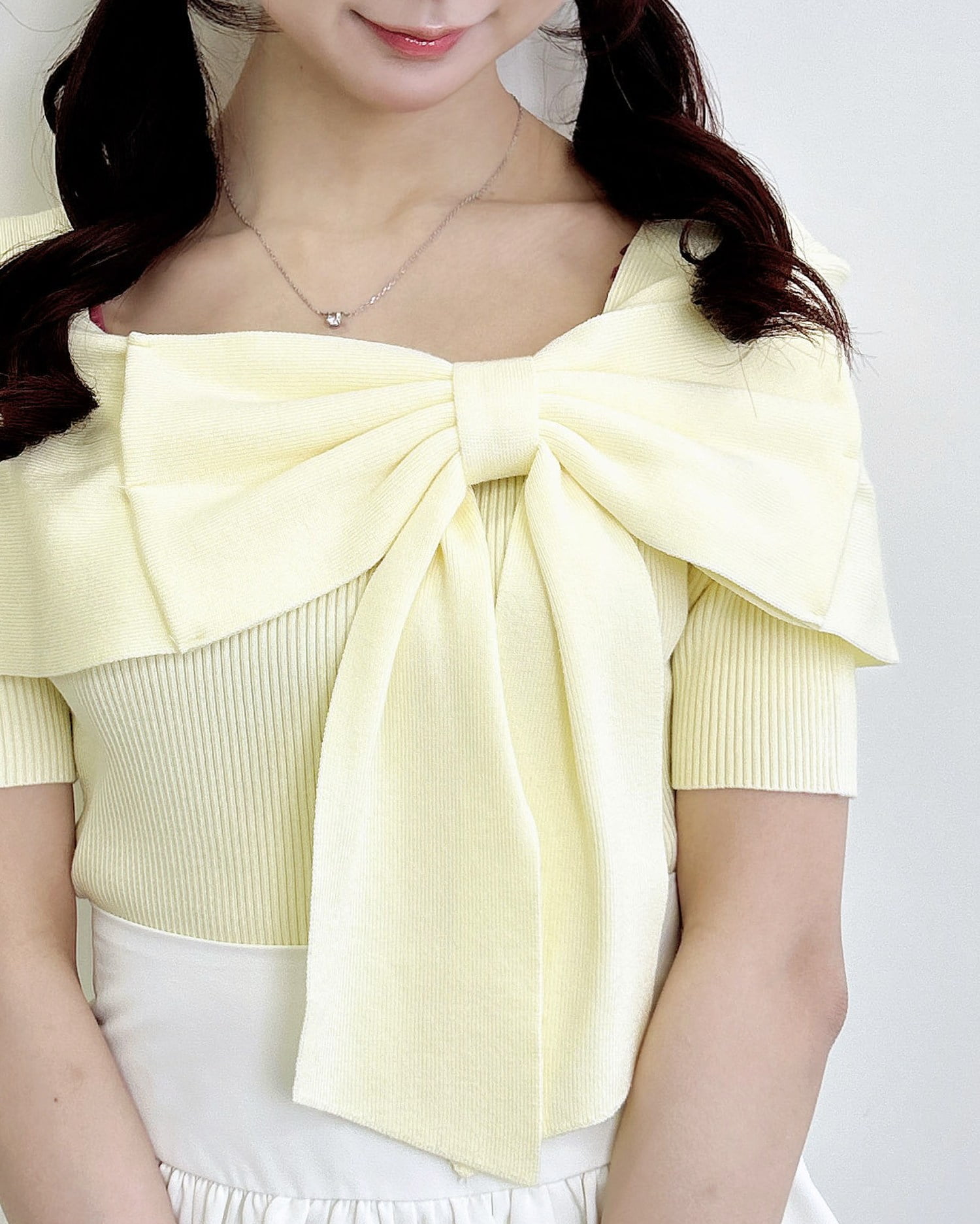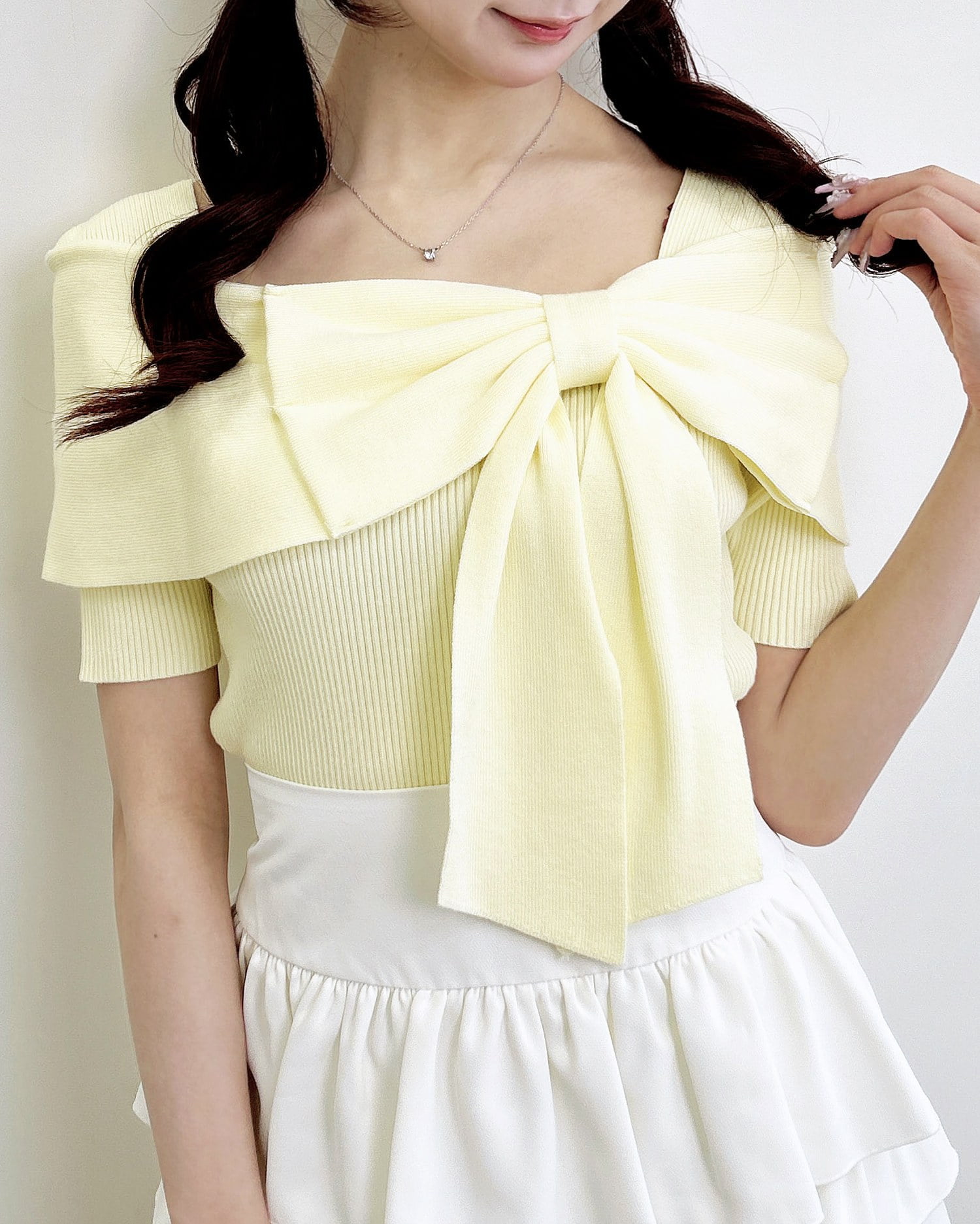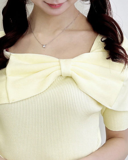ほどよく身体に馴染むニット生地×リボンデザインがバスト部分を立体的にメイク。