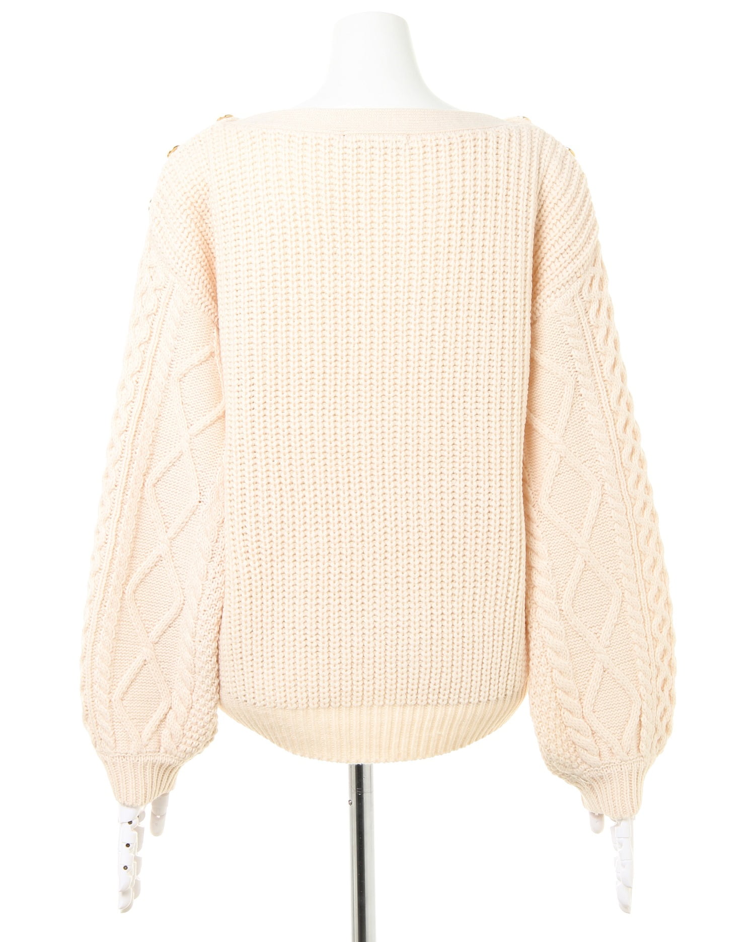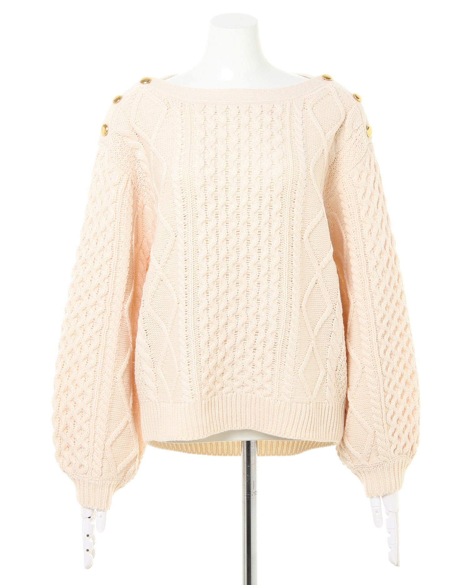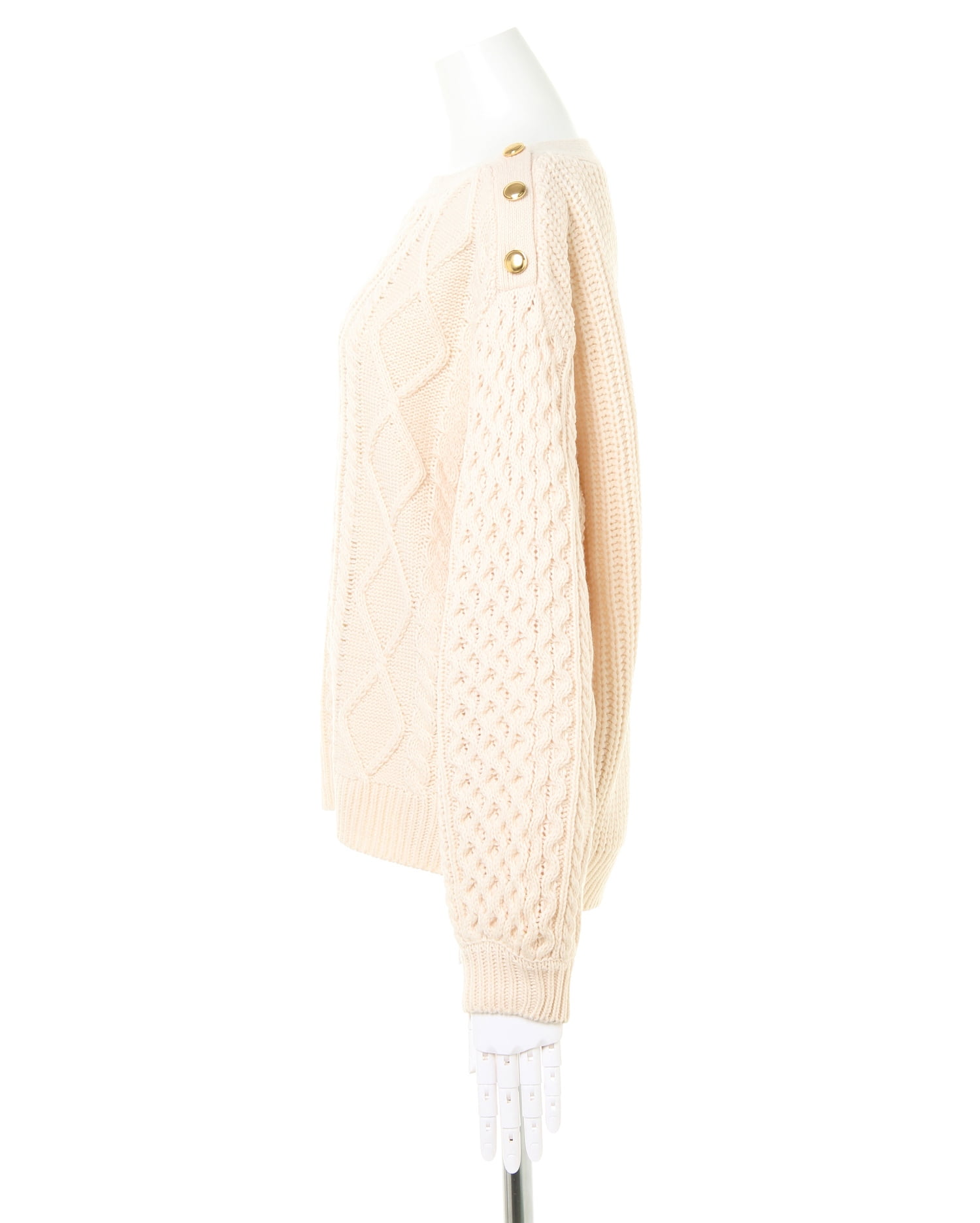 鎖骨をきれいに演出するボートネックが新鮮デザインのニットトップスです。編み方に変化を付けたケーブル編みとの組み合わせで存在感のあるアイテム。ショルダー部分の金ボタンがリュクスなアクセントになっています。程よい抜け感で大人のカジュアルスタイルにオススメ。ボディラインを包み込むゆったりとした身頃でシャツやタートルとのレイヤードもスムーズです。