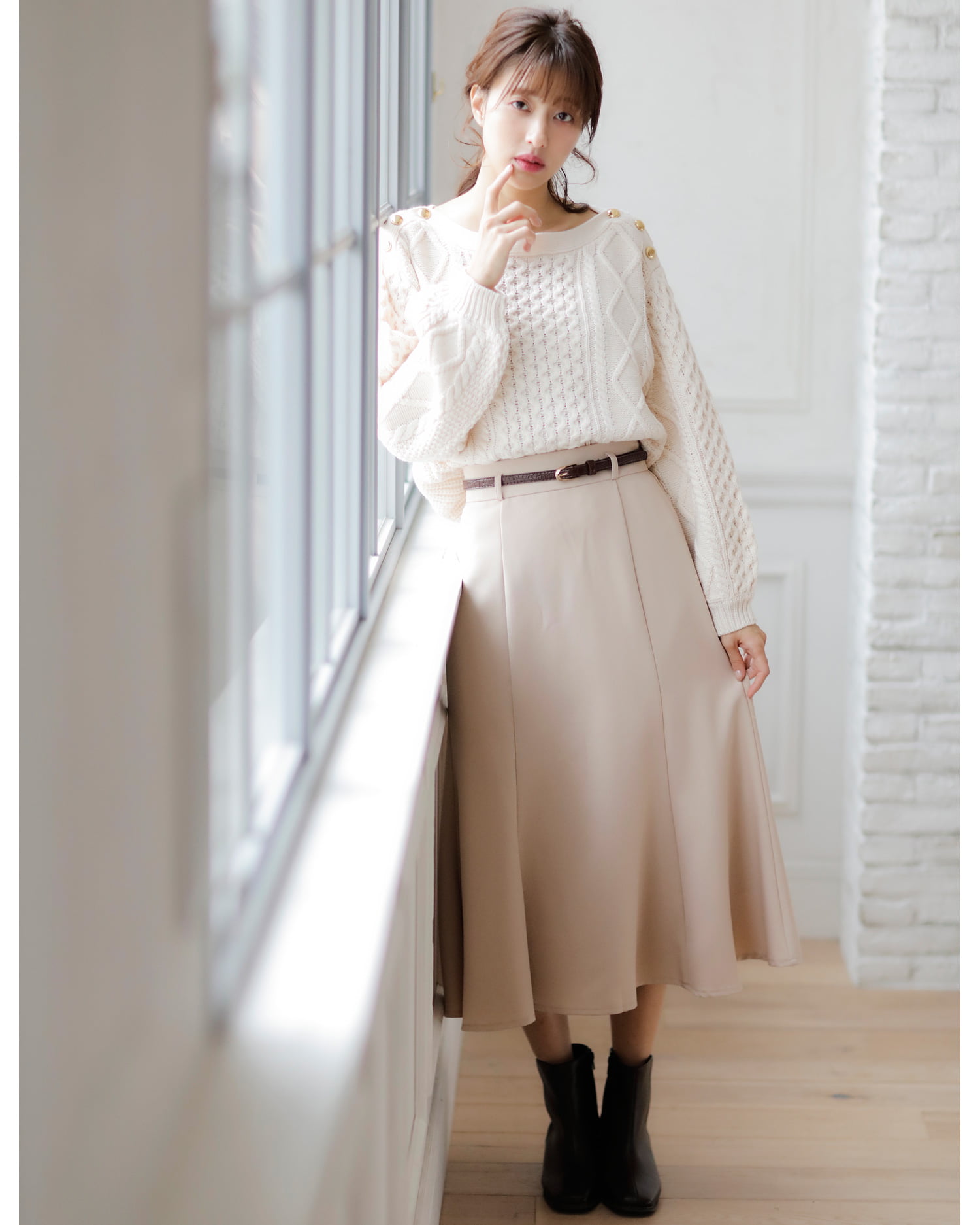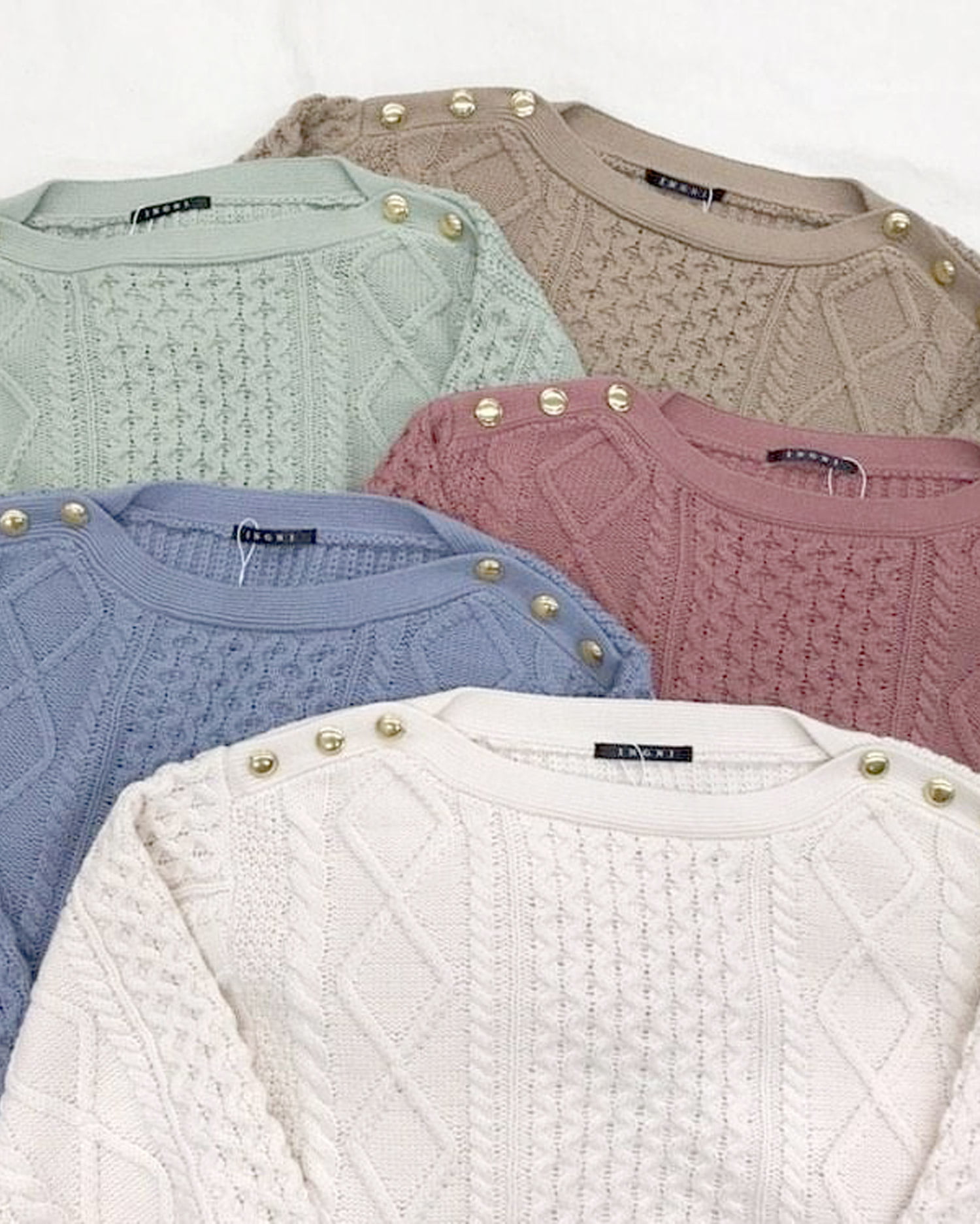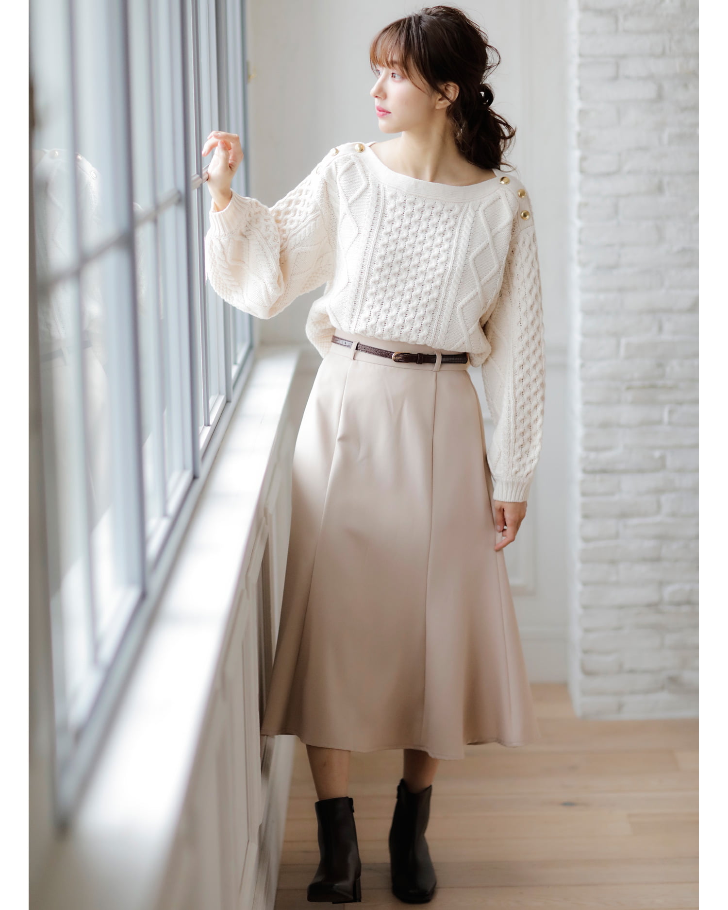 鎖骨をきれいに演出するボートネックが新鮮デザインのニットトップスです。編み方に変化を付けたケーブル編みとの組み合わせで存在感のあるアイテム。ショルダー部分の金ボタンがリュクスなアクセントになっています。程よい抜け感で大人のカジュアルスタイルにオススメ。ボディラインを包み込むゆったりとした身頃でシャツやタートルとのレイヤードもスムーズです。