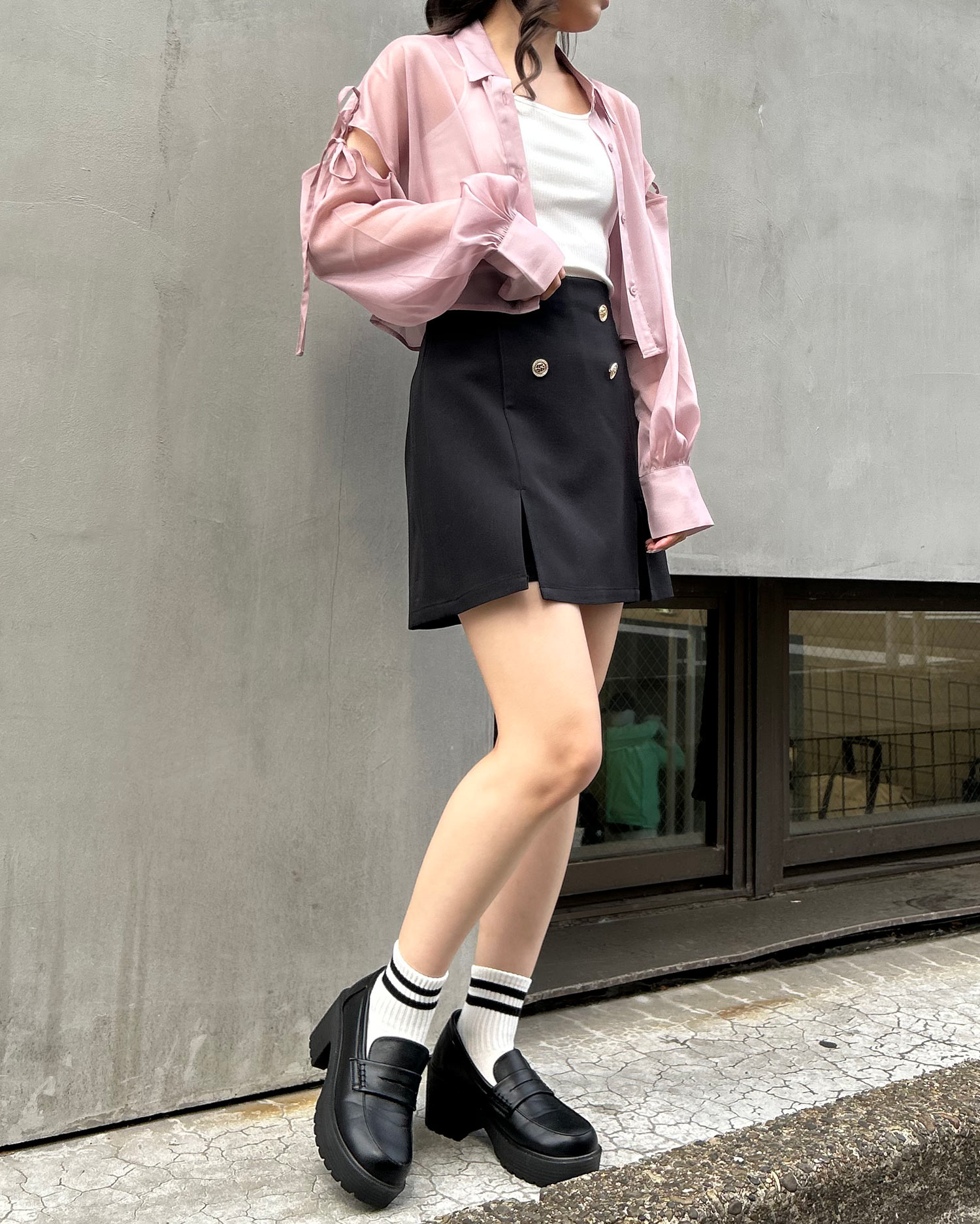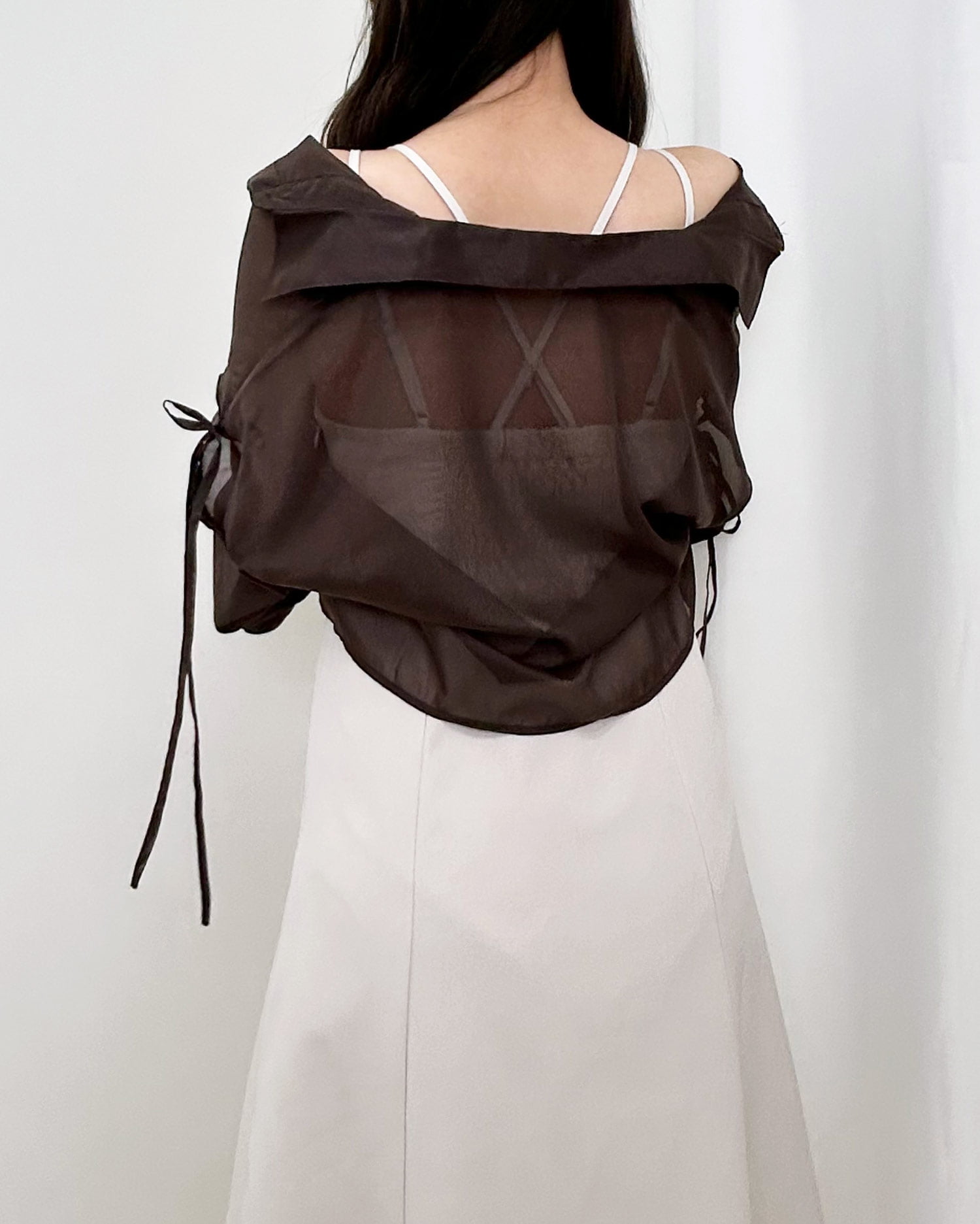 透明感のあるシアーシャツに肩スリットでトレンドをプラスしたアイテム。