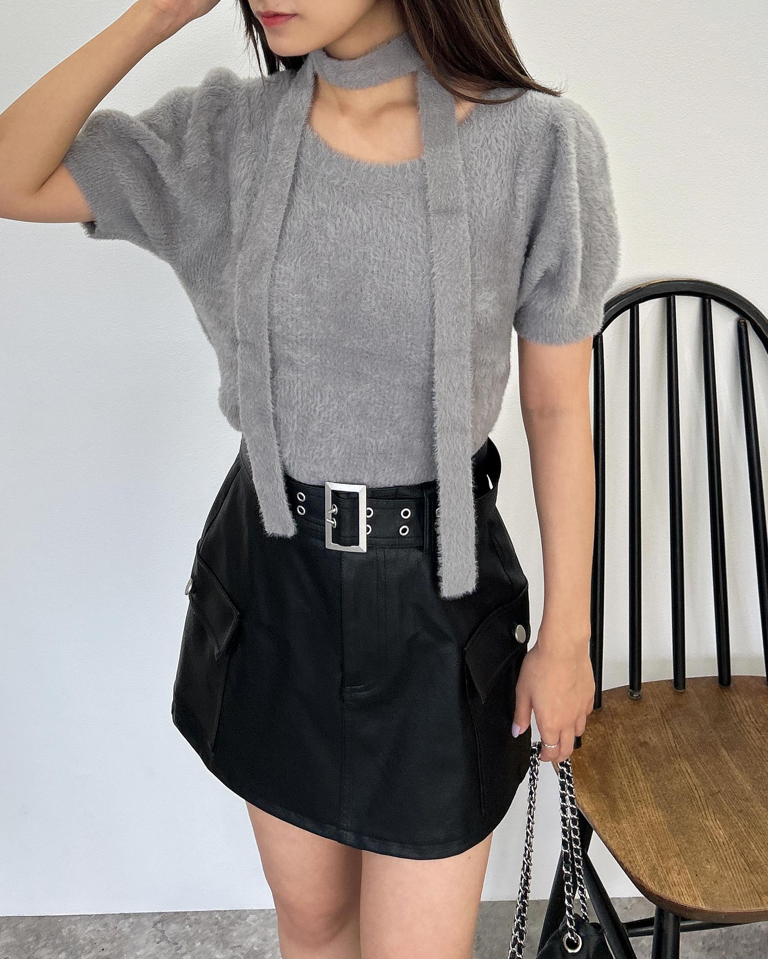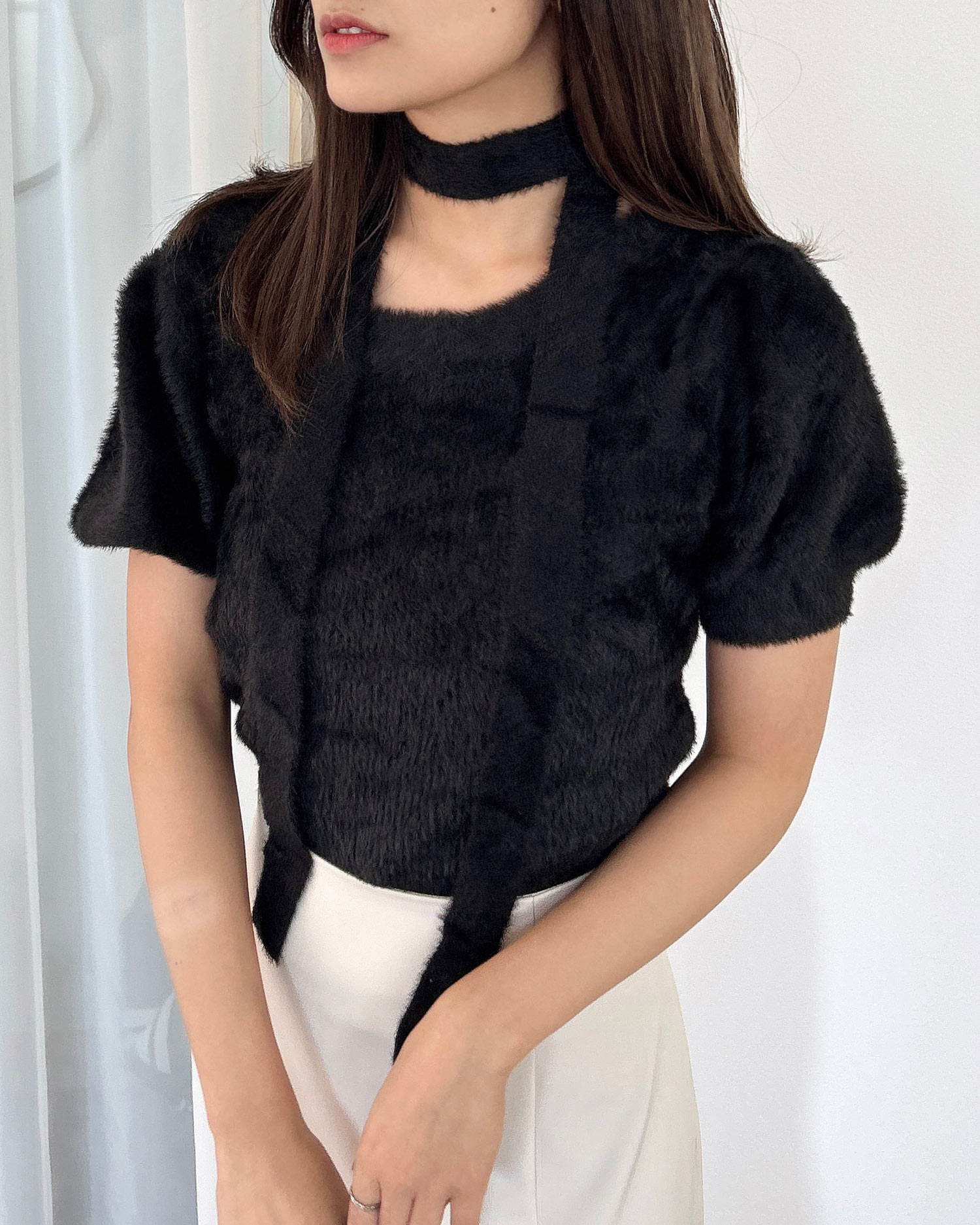 クルーネックにパフスリーブで、シンプルでコンパクトなシルエット。