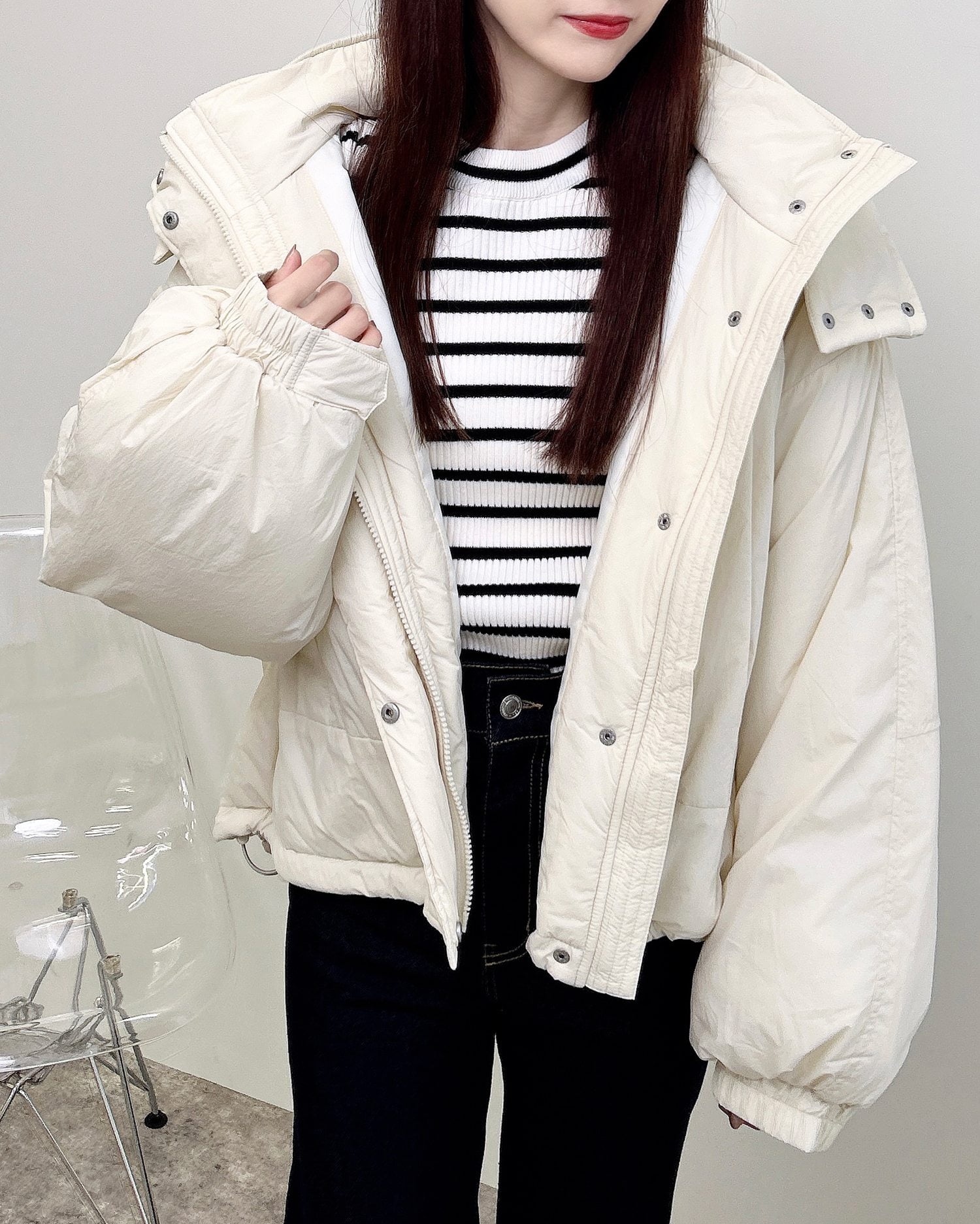 フード部分のスナップボタンを留めれば首元まで覆うスタンド風ネックに。