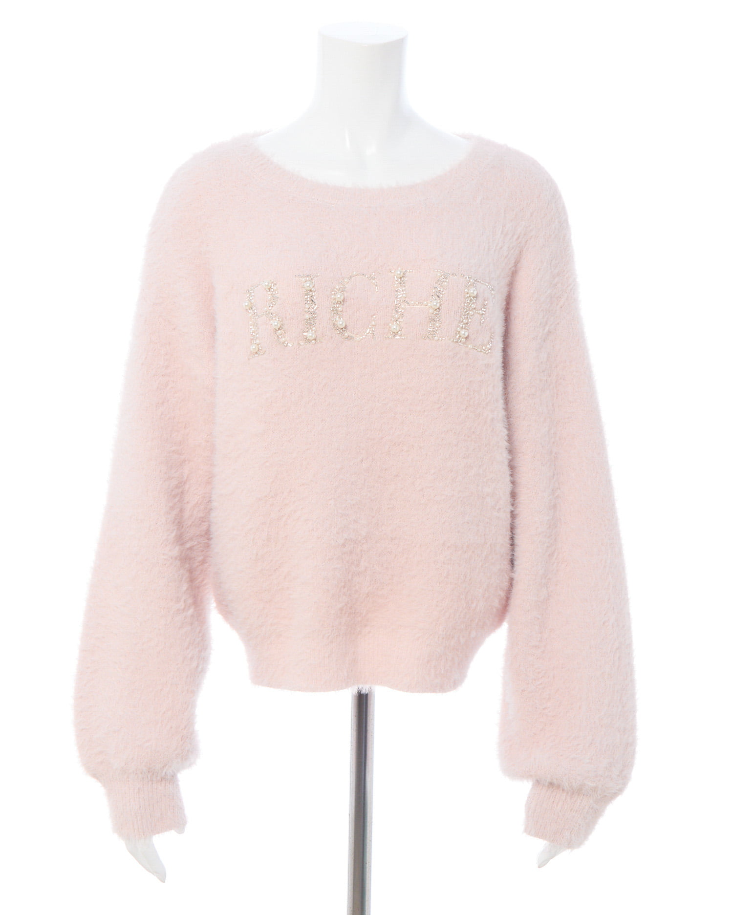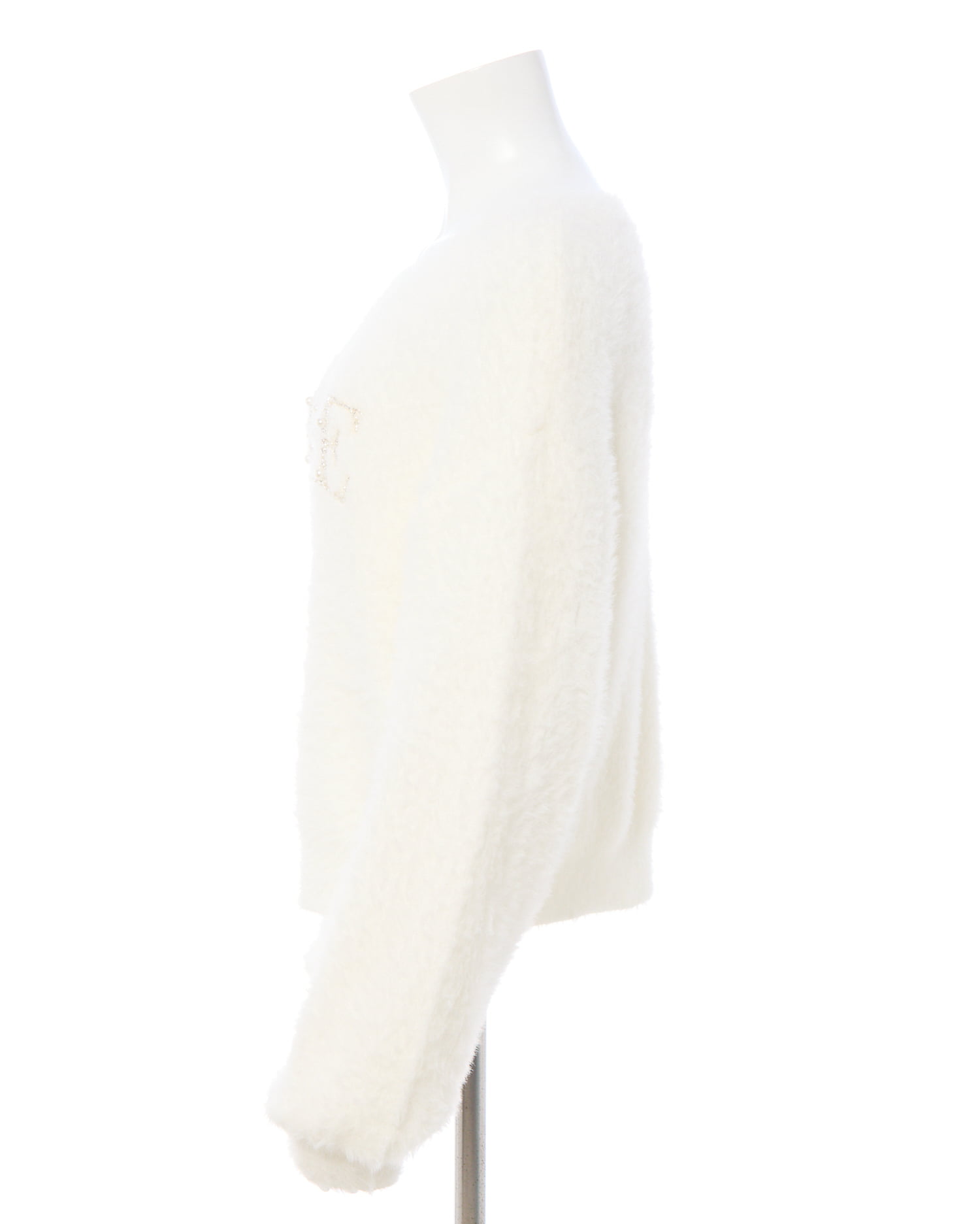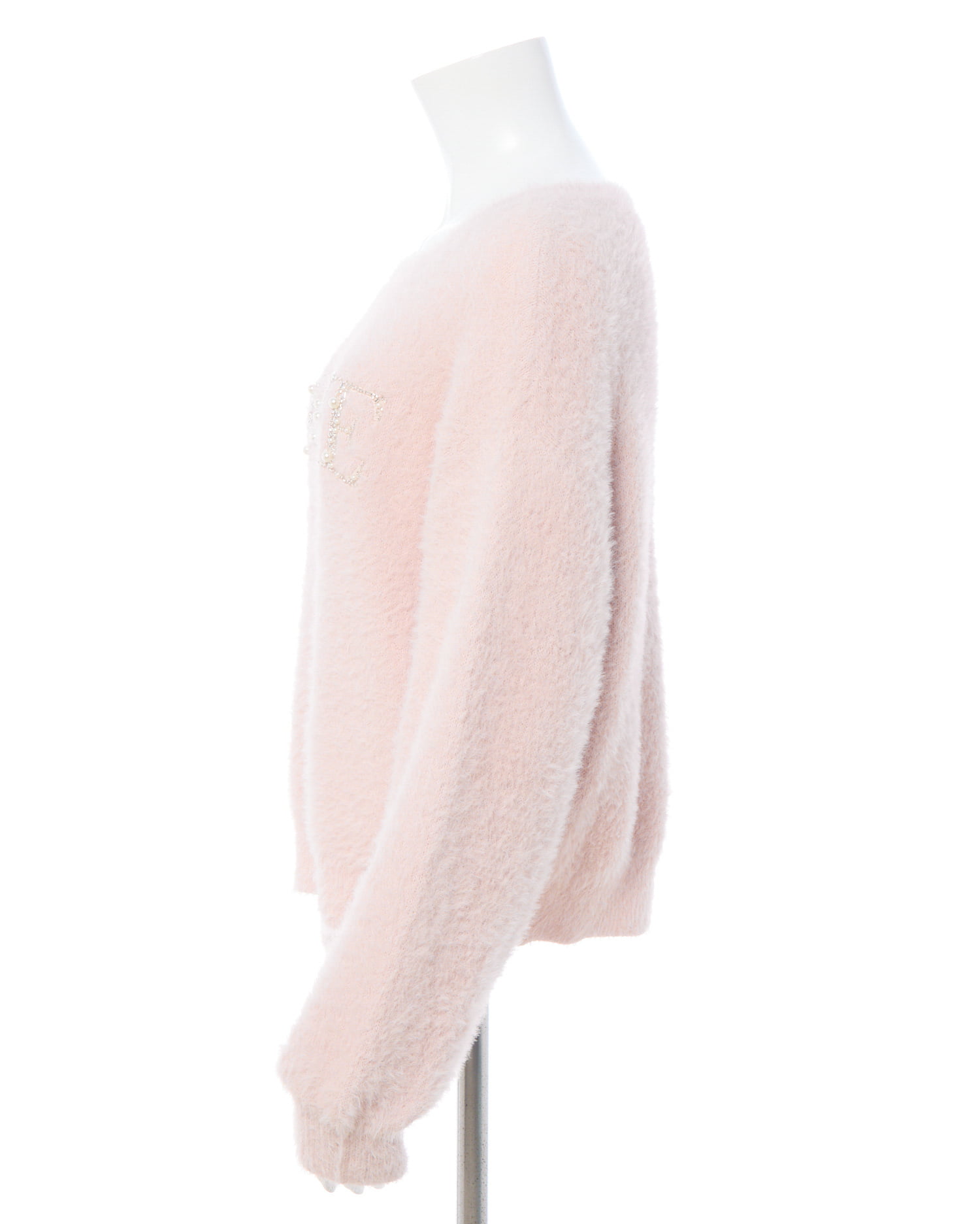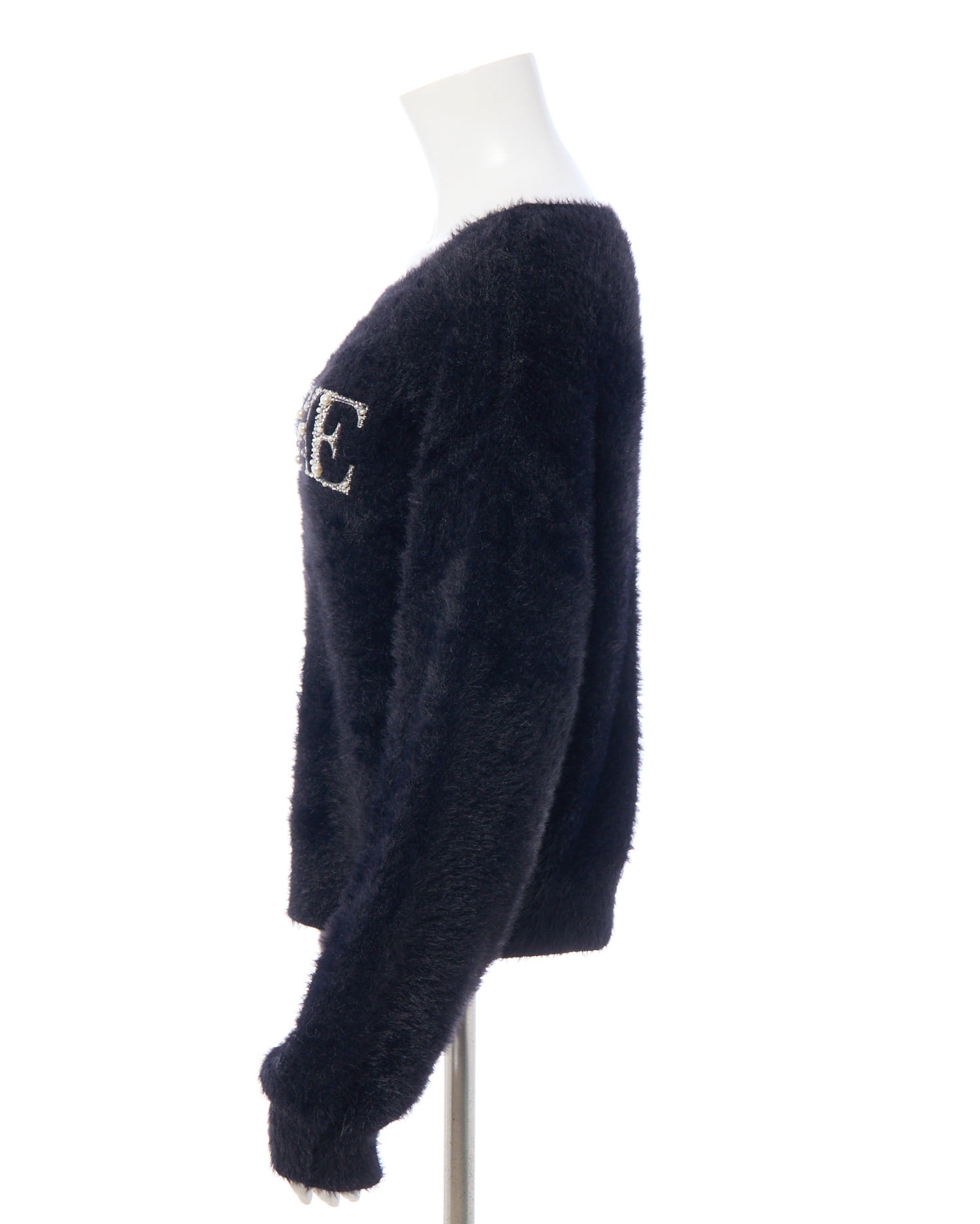 冬の定番フェザーニットにパールビジューロゴで華やかさをプラス。
