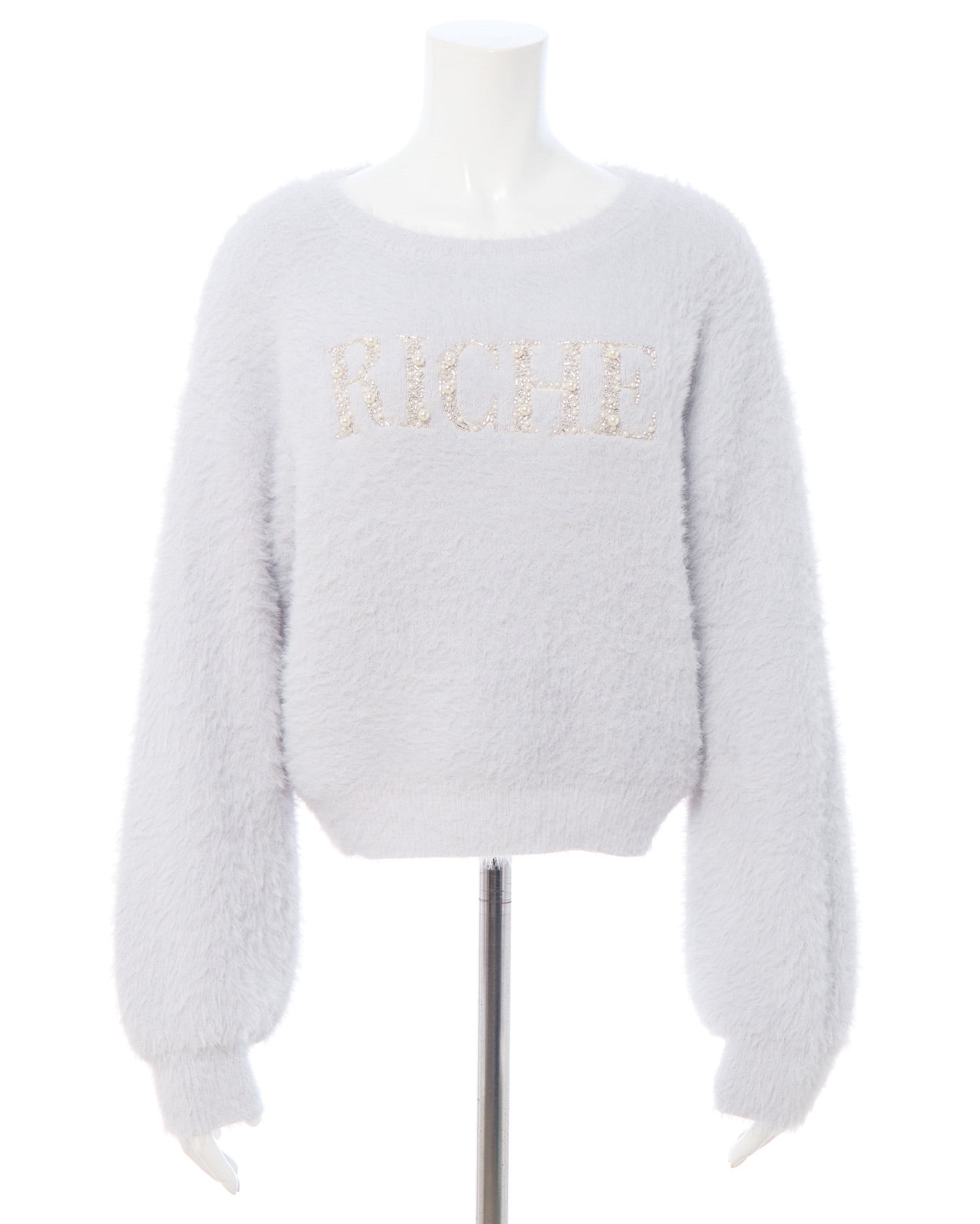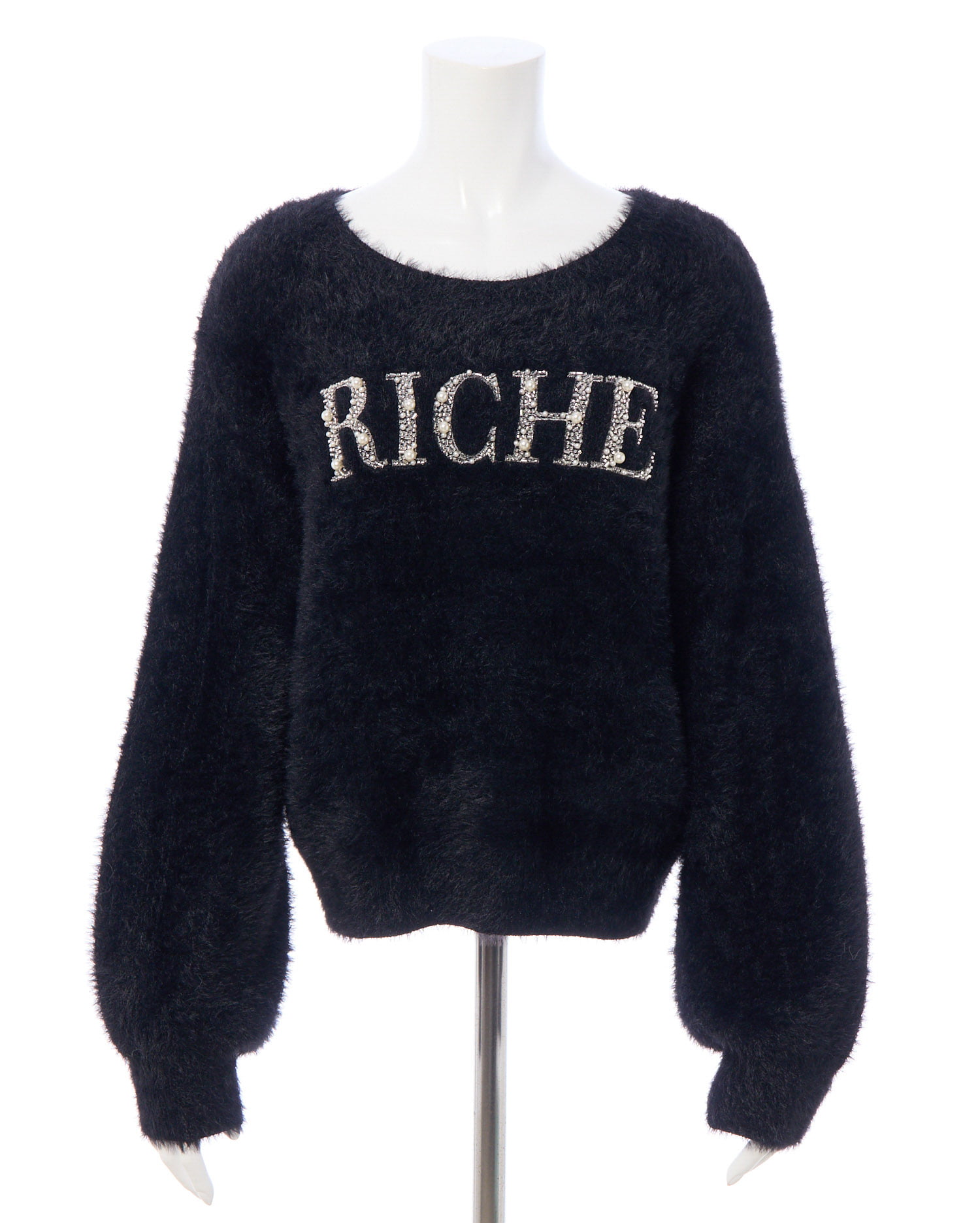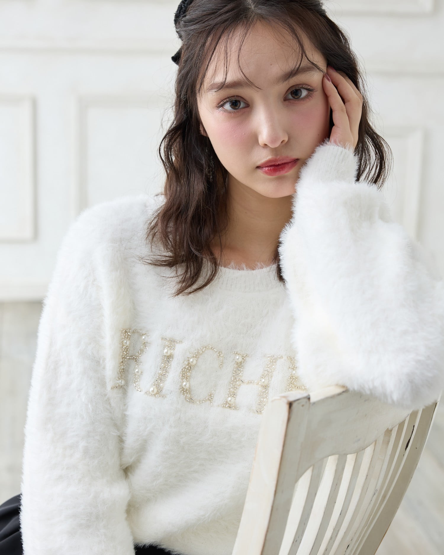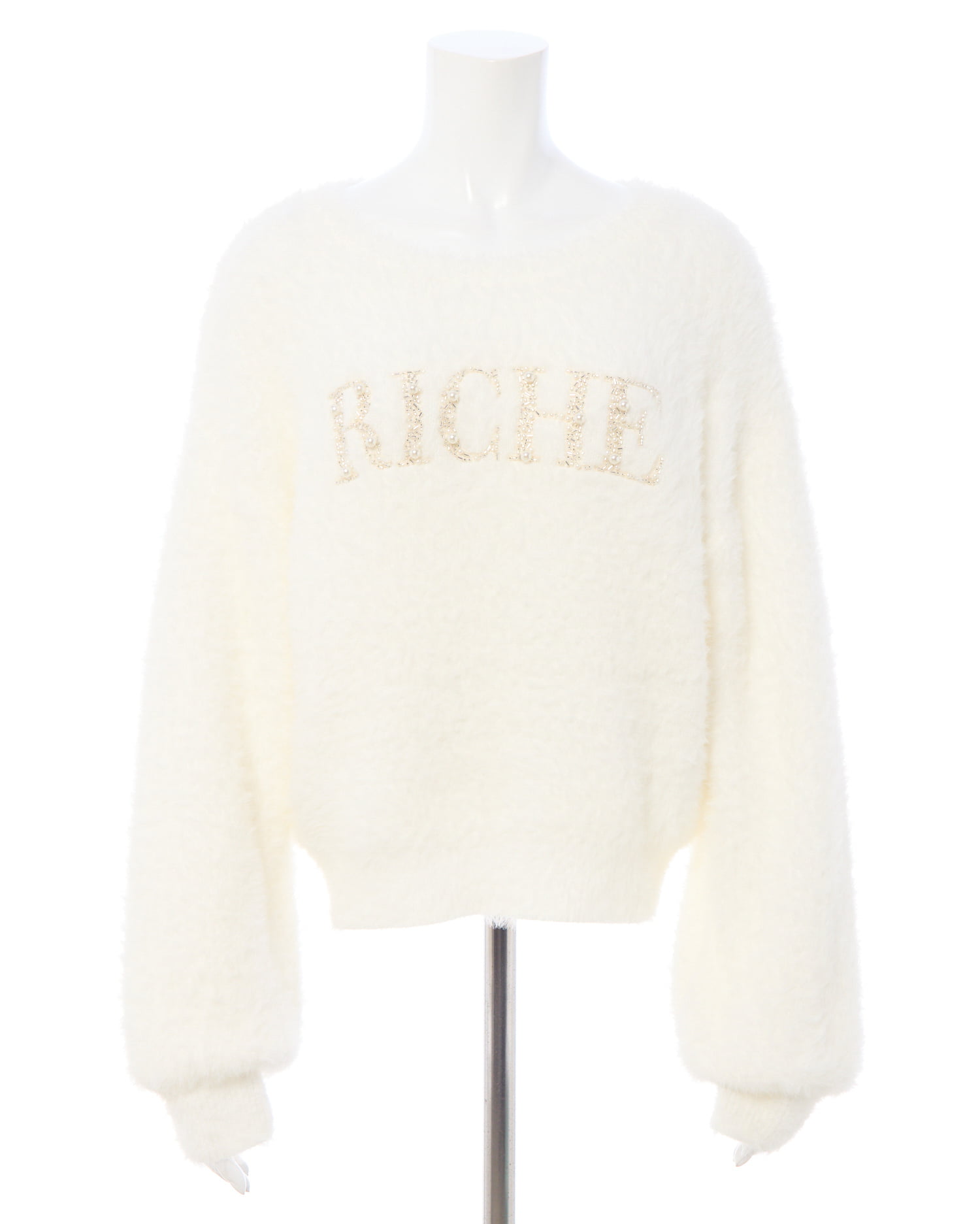 冬の定番フェザーニットにパールビジューロゴで華やかさをプラス。