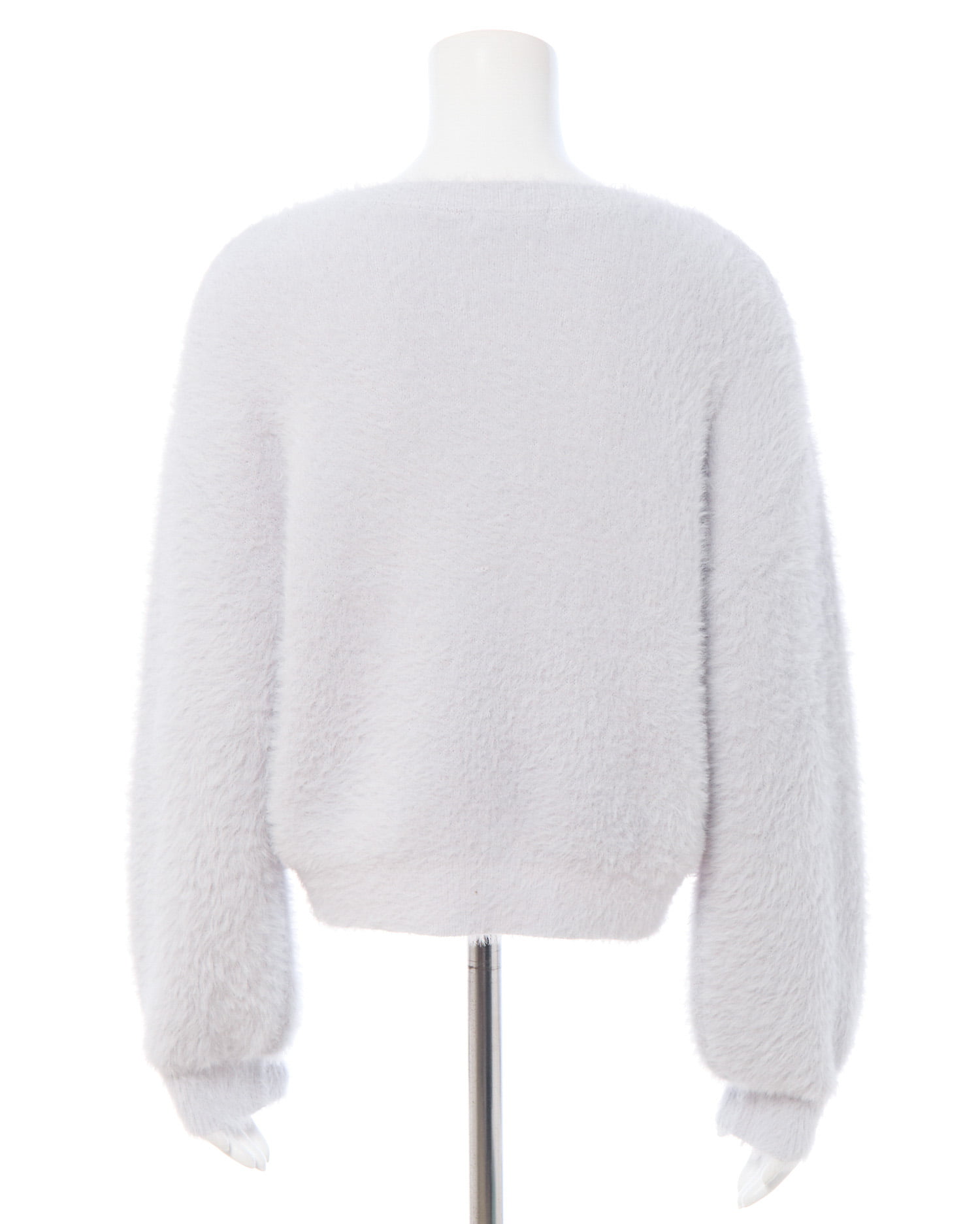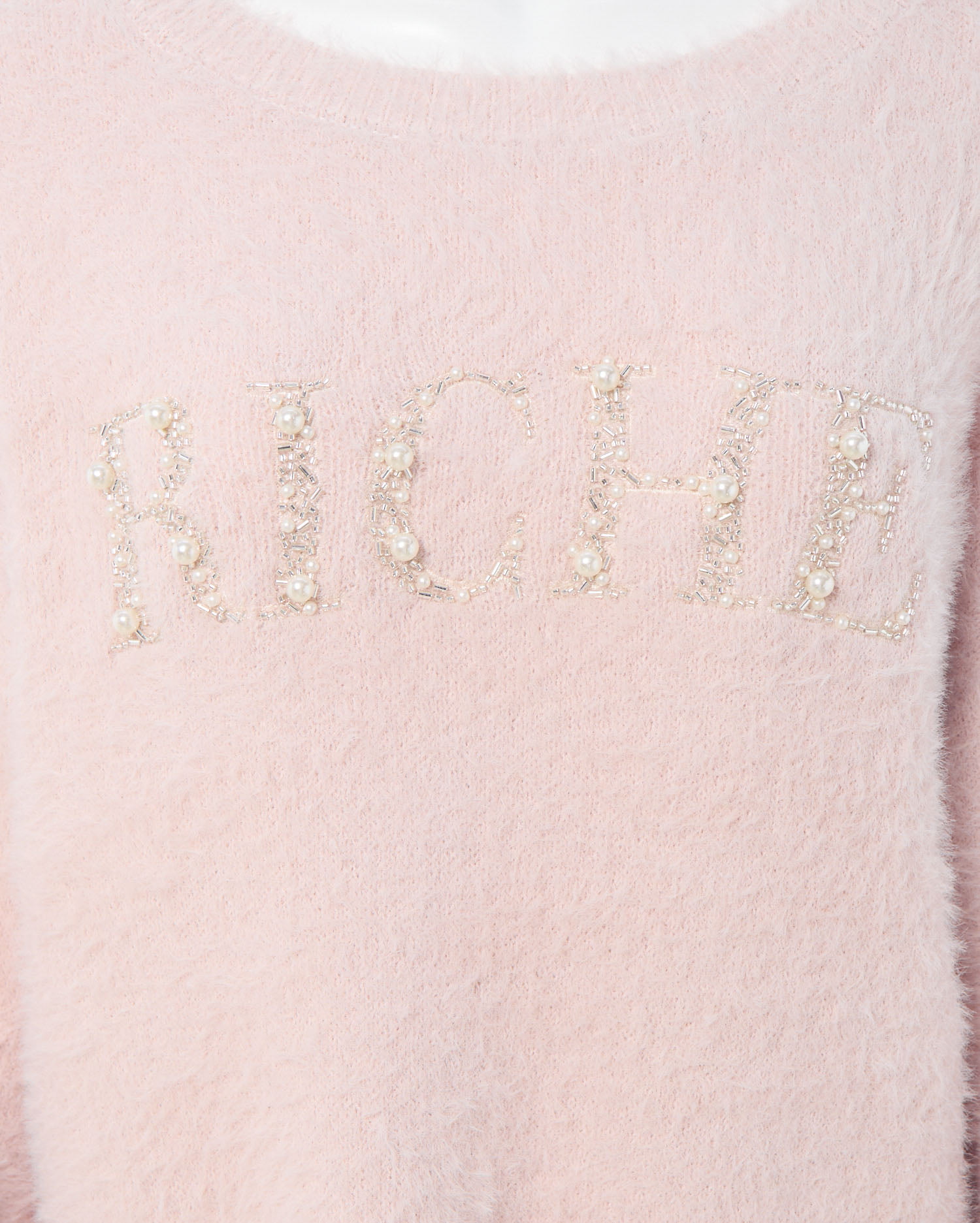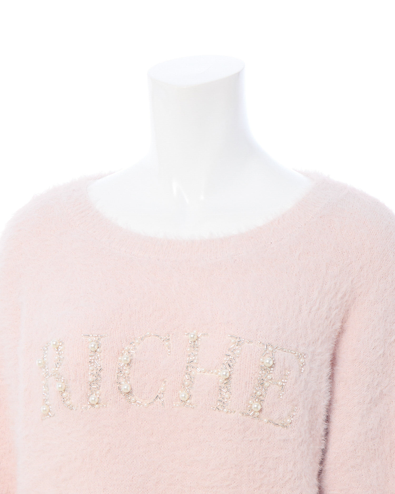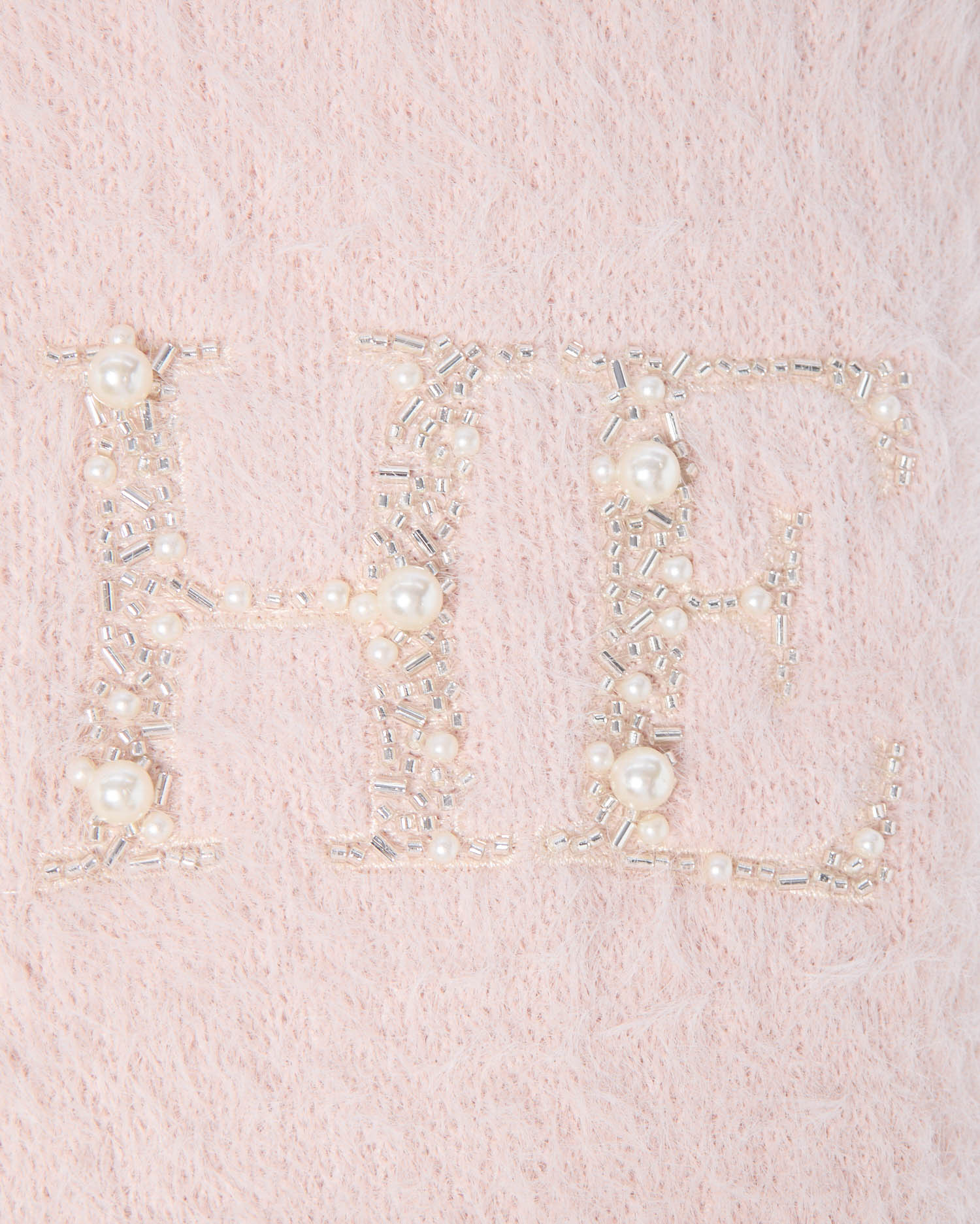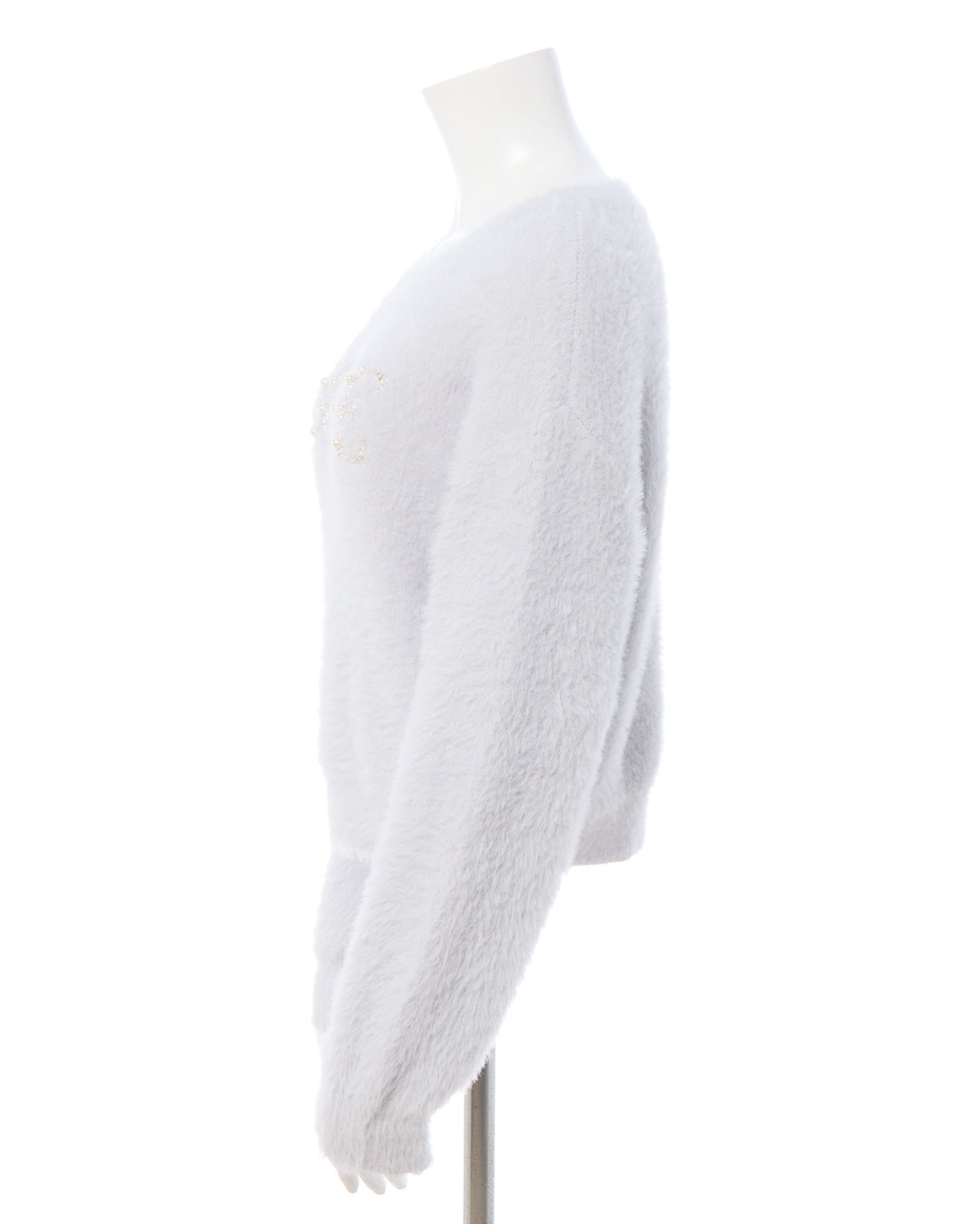 冬の定番フェザーニットにパールビジューロゴで華やかさをプラス。