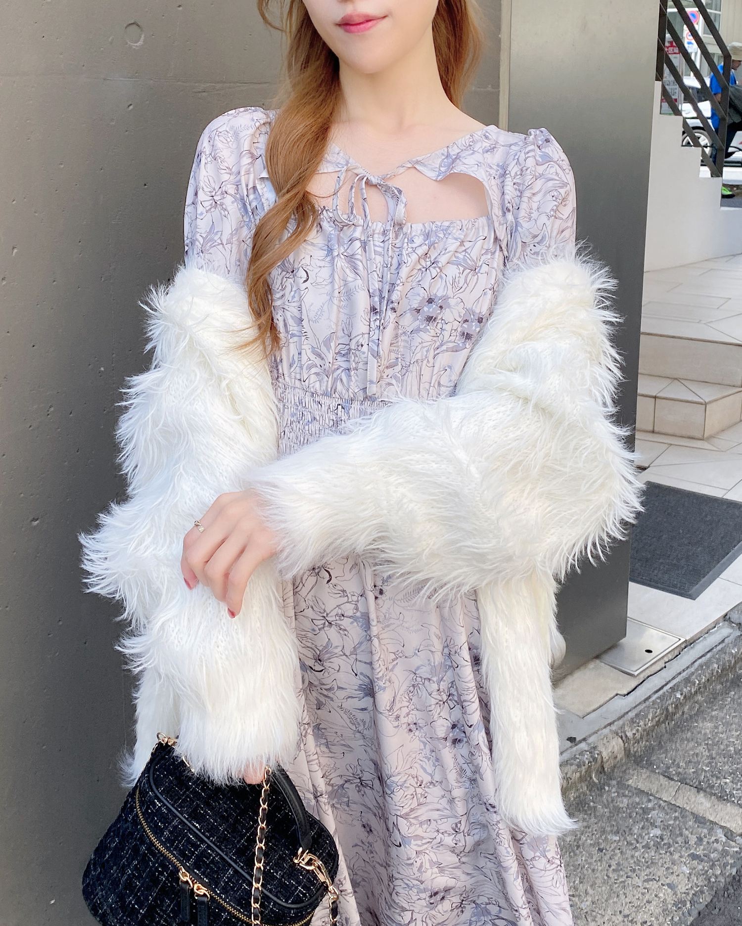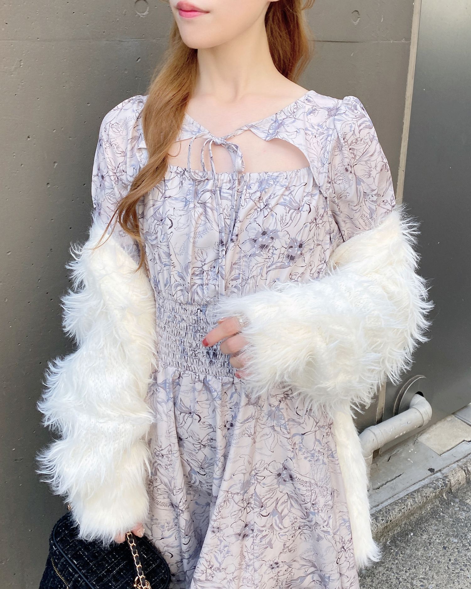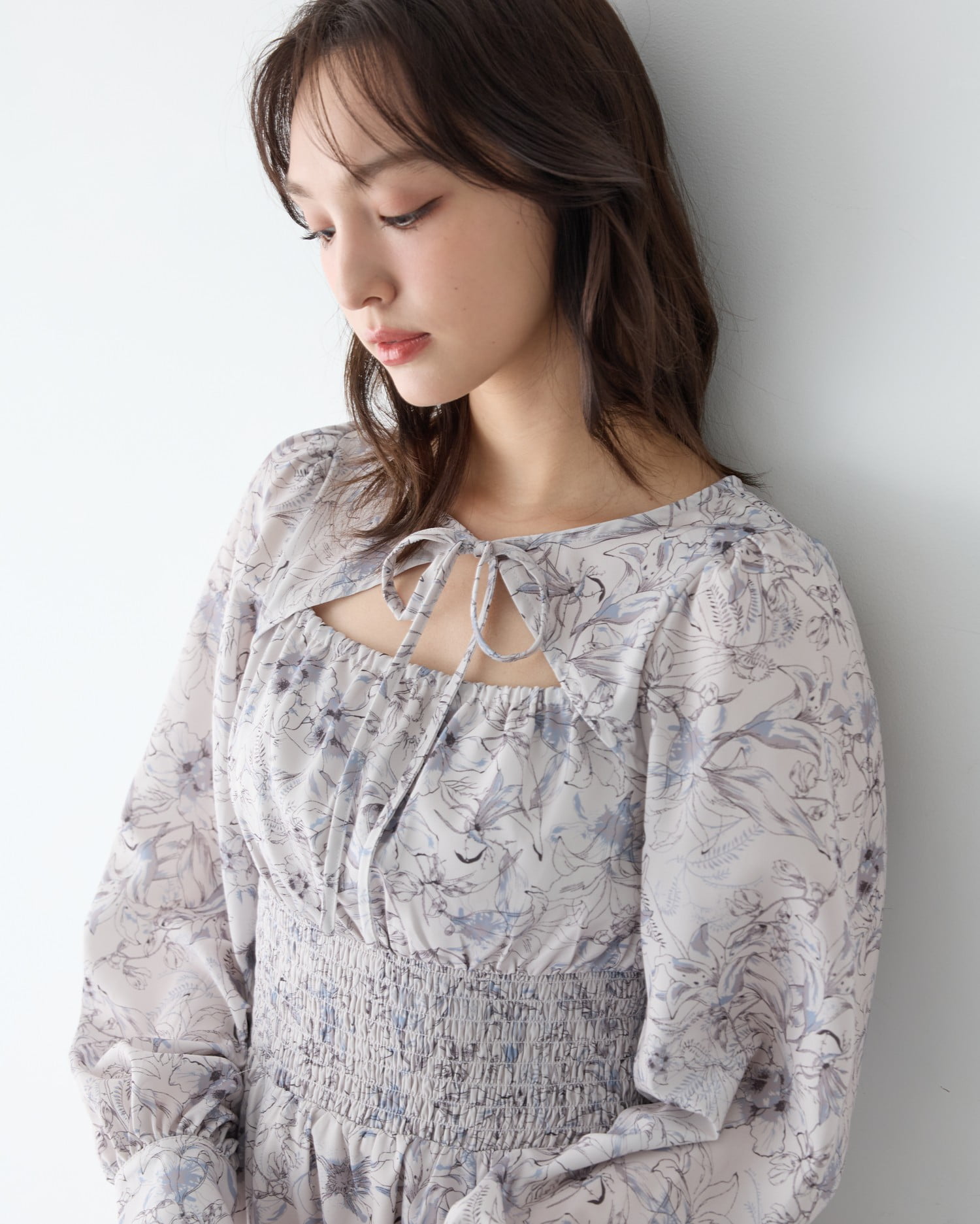 人気のデコルテオープンデザイン×フェミニンな花柄が大人かわいい雰囲気を演出。