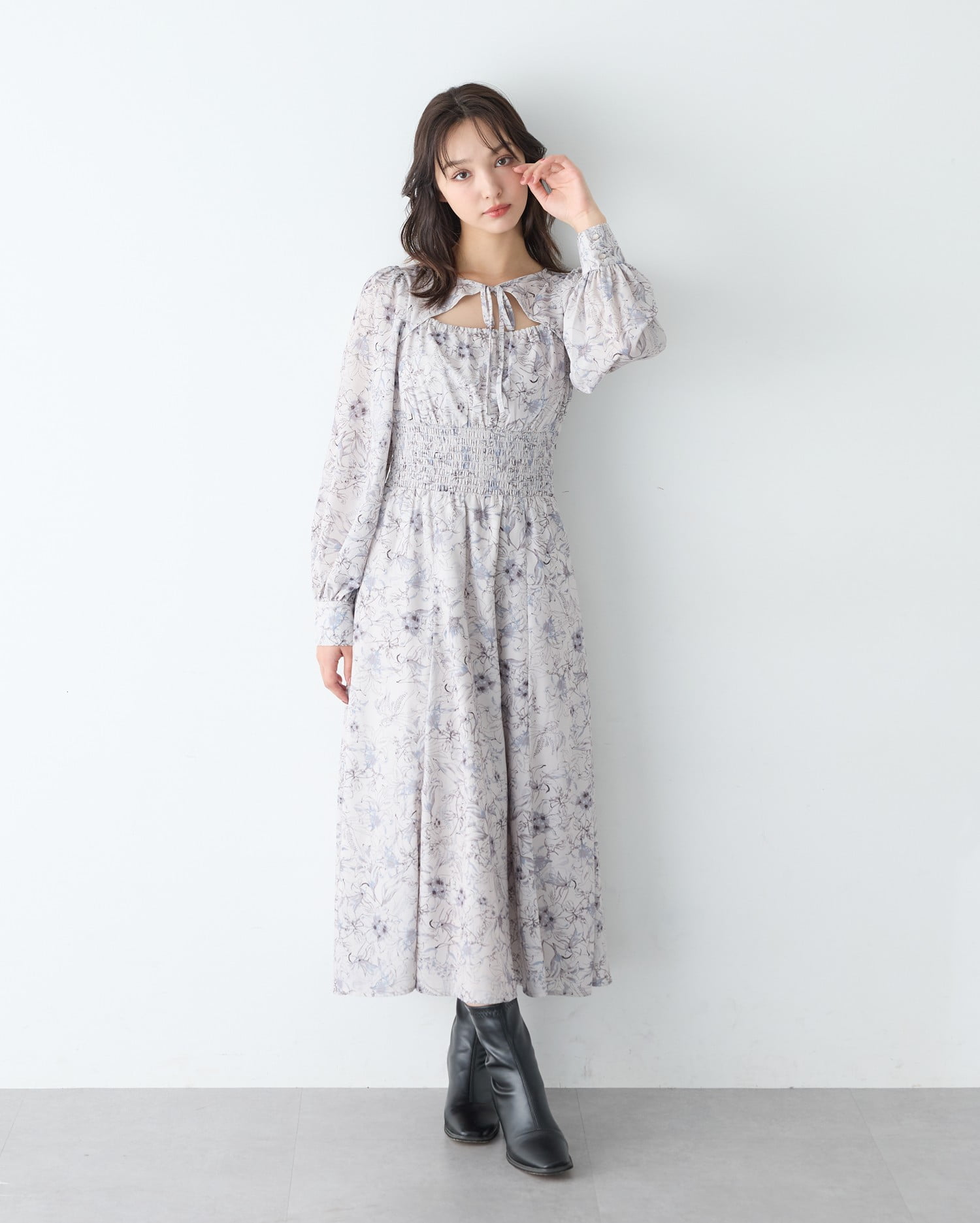 • INGNI(イング) 【11/11までの限定価格】【WEB限定】デコルテオープン花柄ワンピース グレー