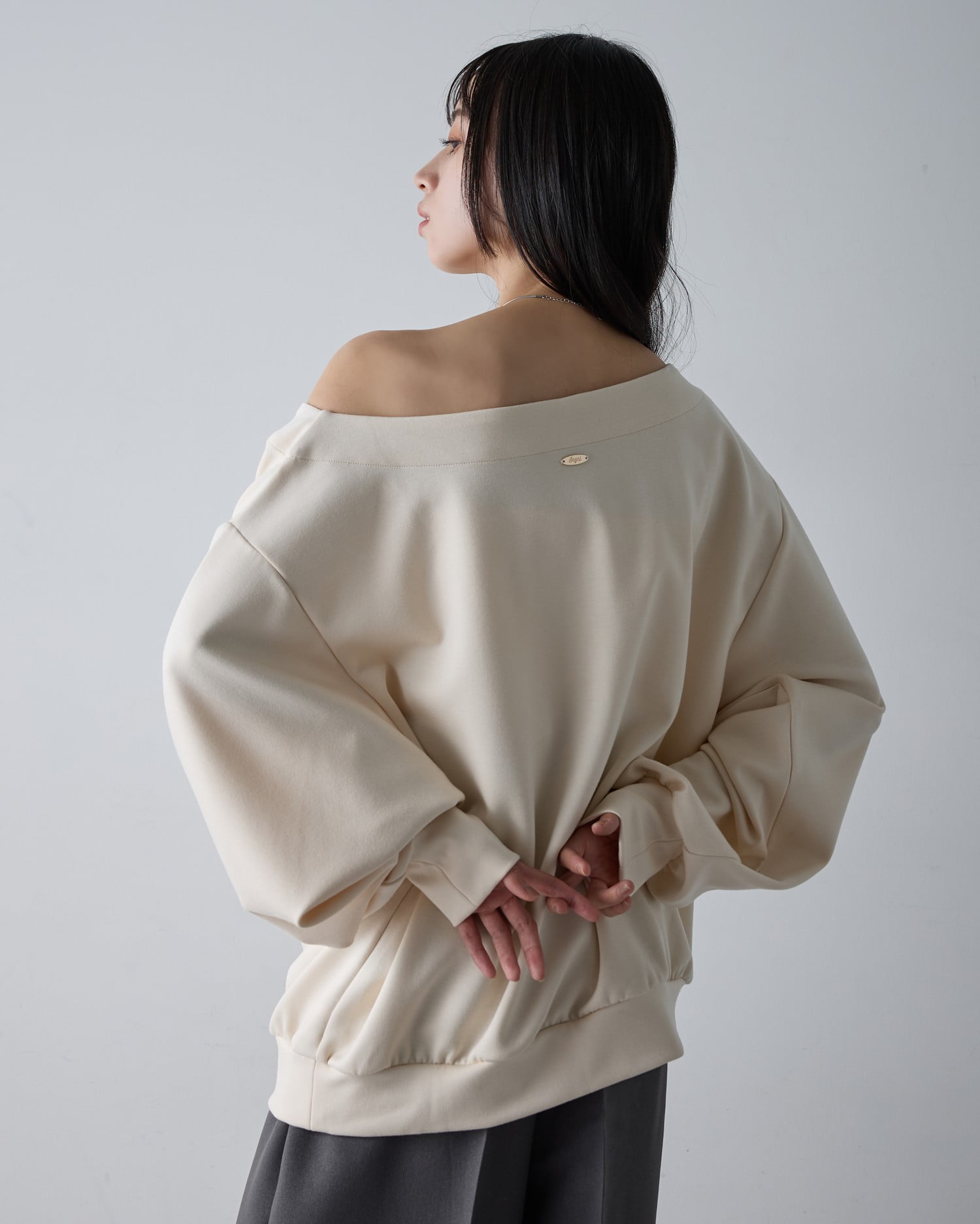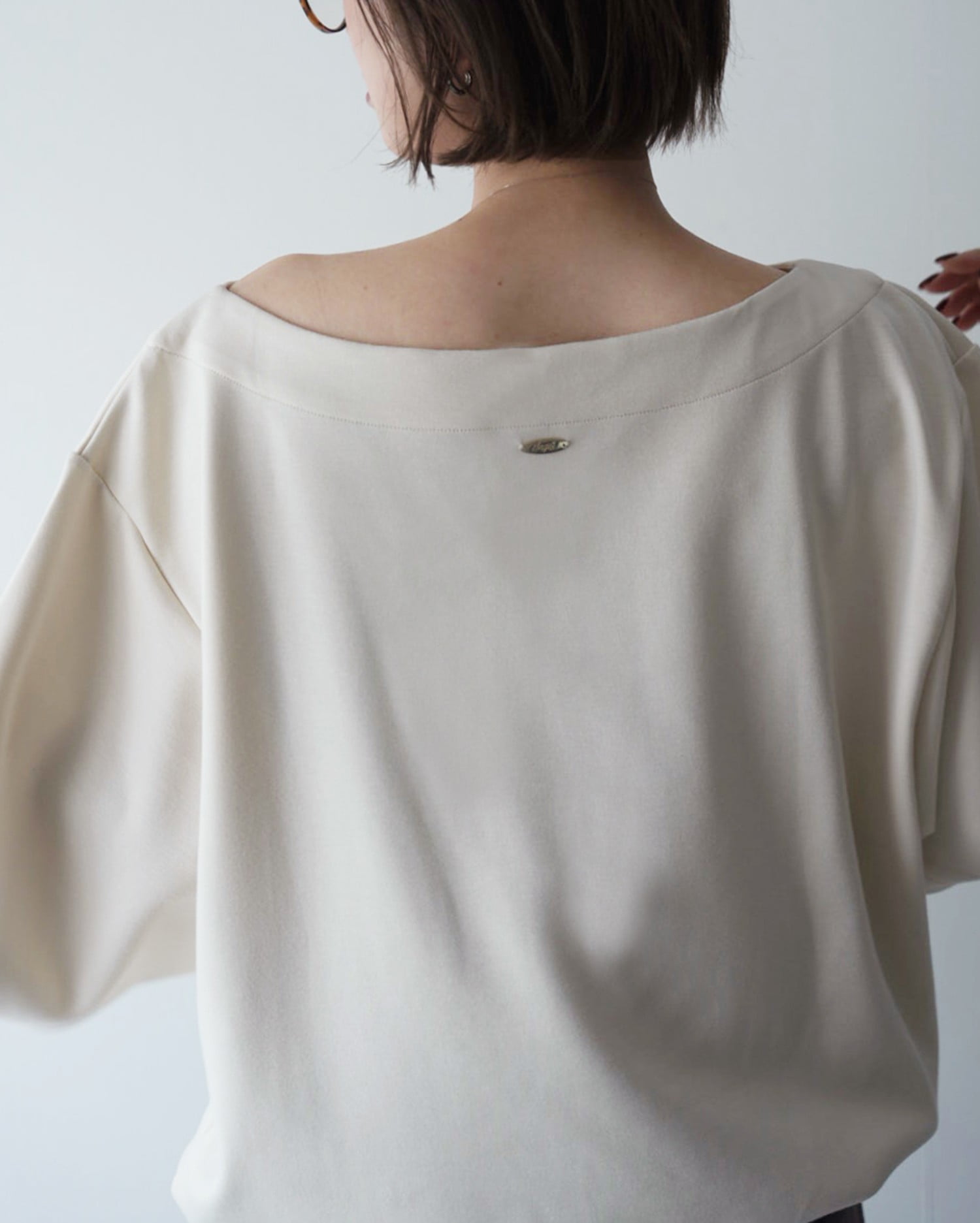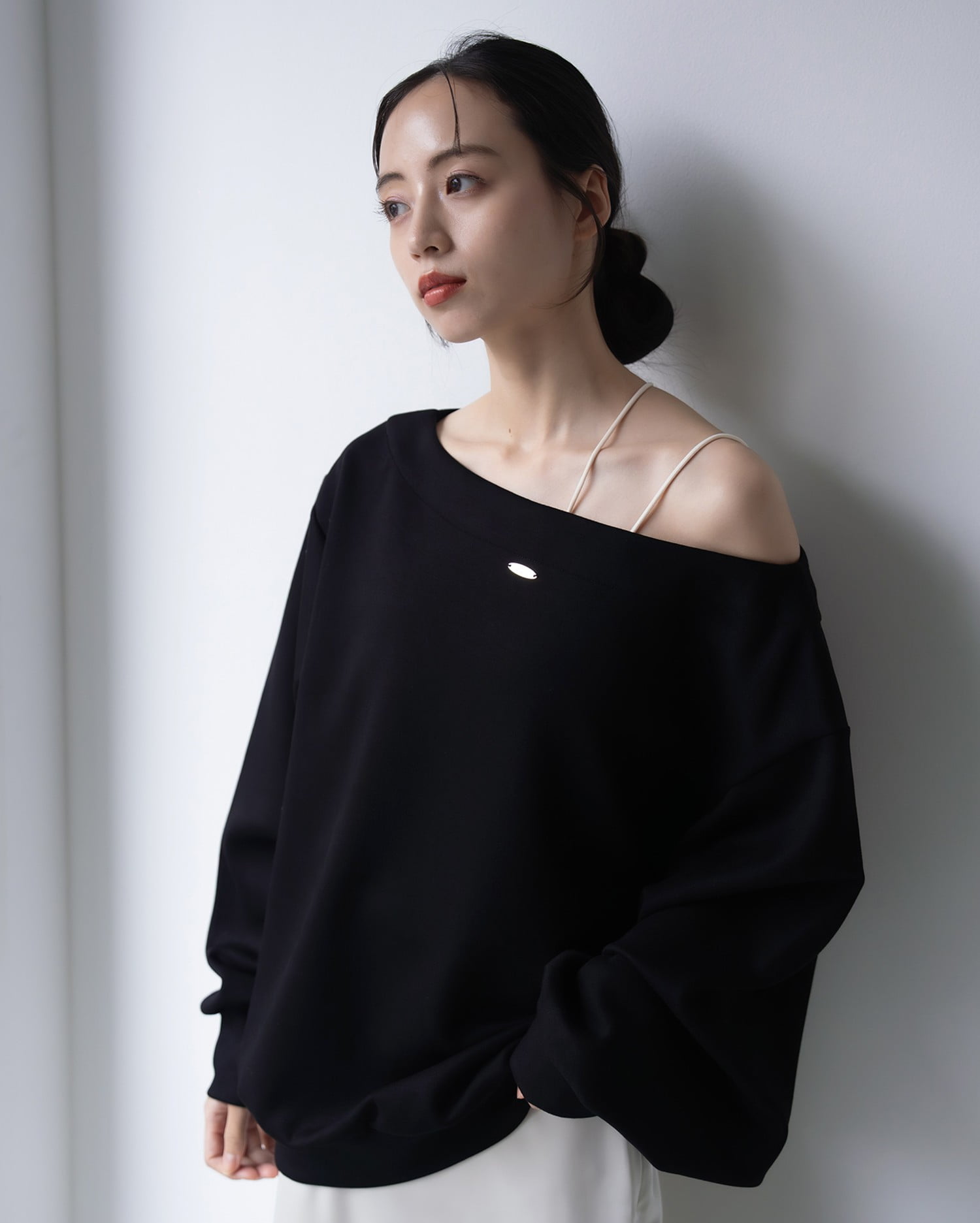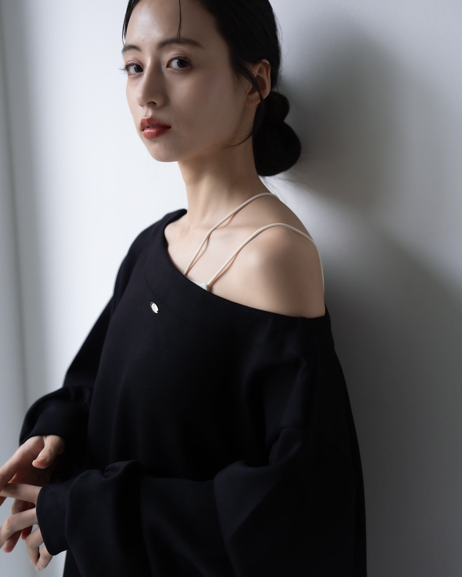 前後を逆にしたり、ワンショルダーやオフショルダーとしても様々な着こなしが可能。