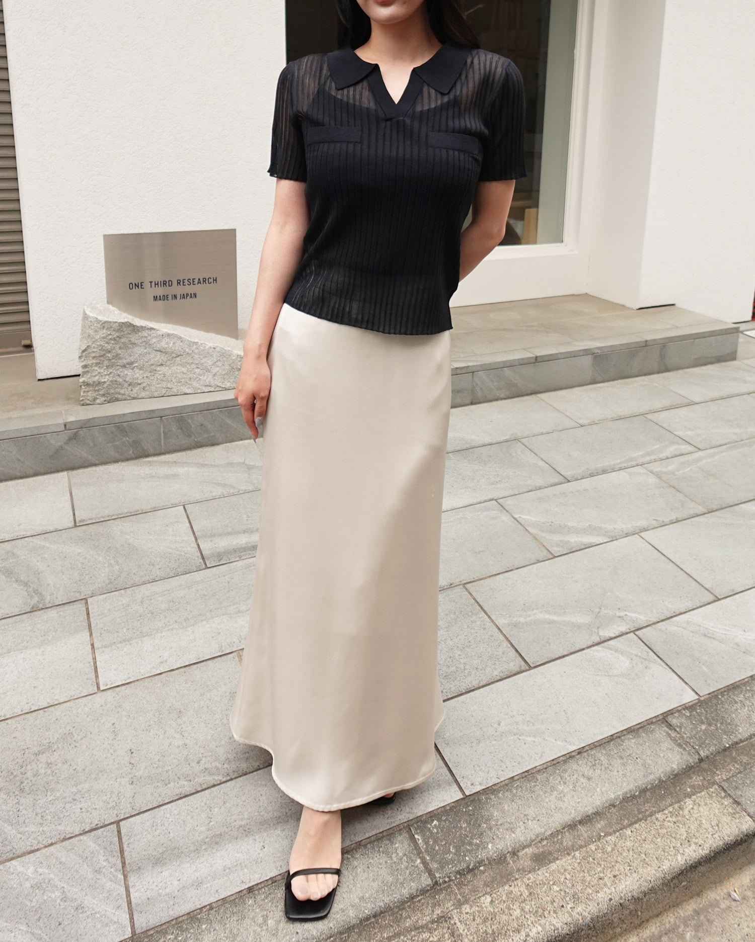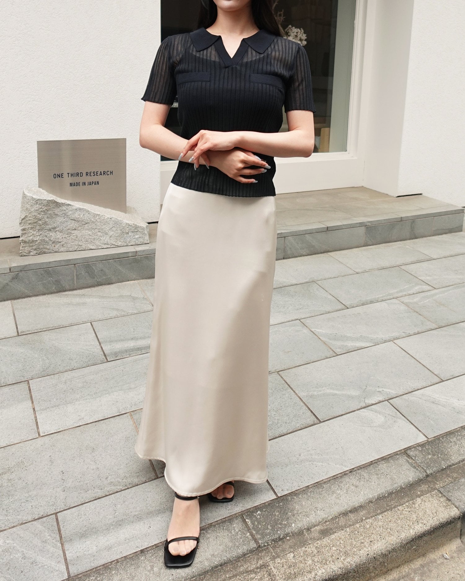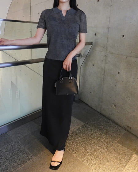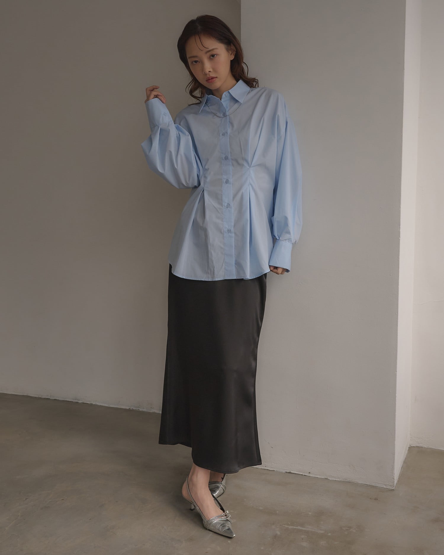 光沢のあるサテン生地で仕立てたマーメイドシルエットのロングスカート。