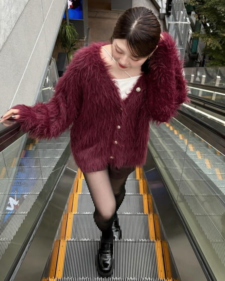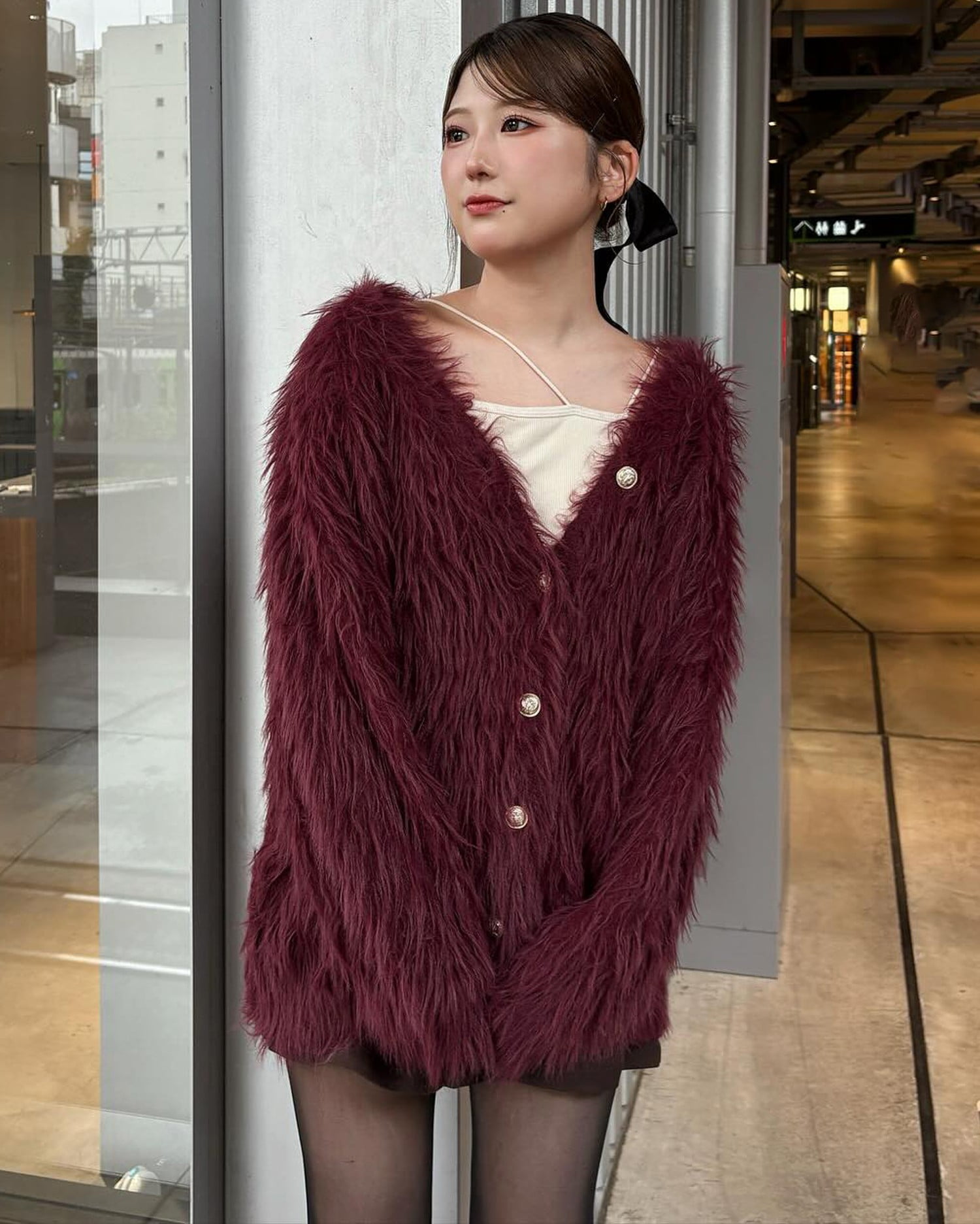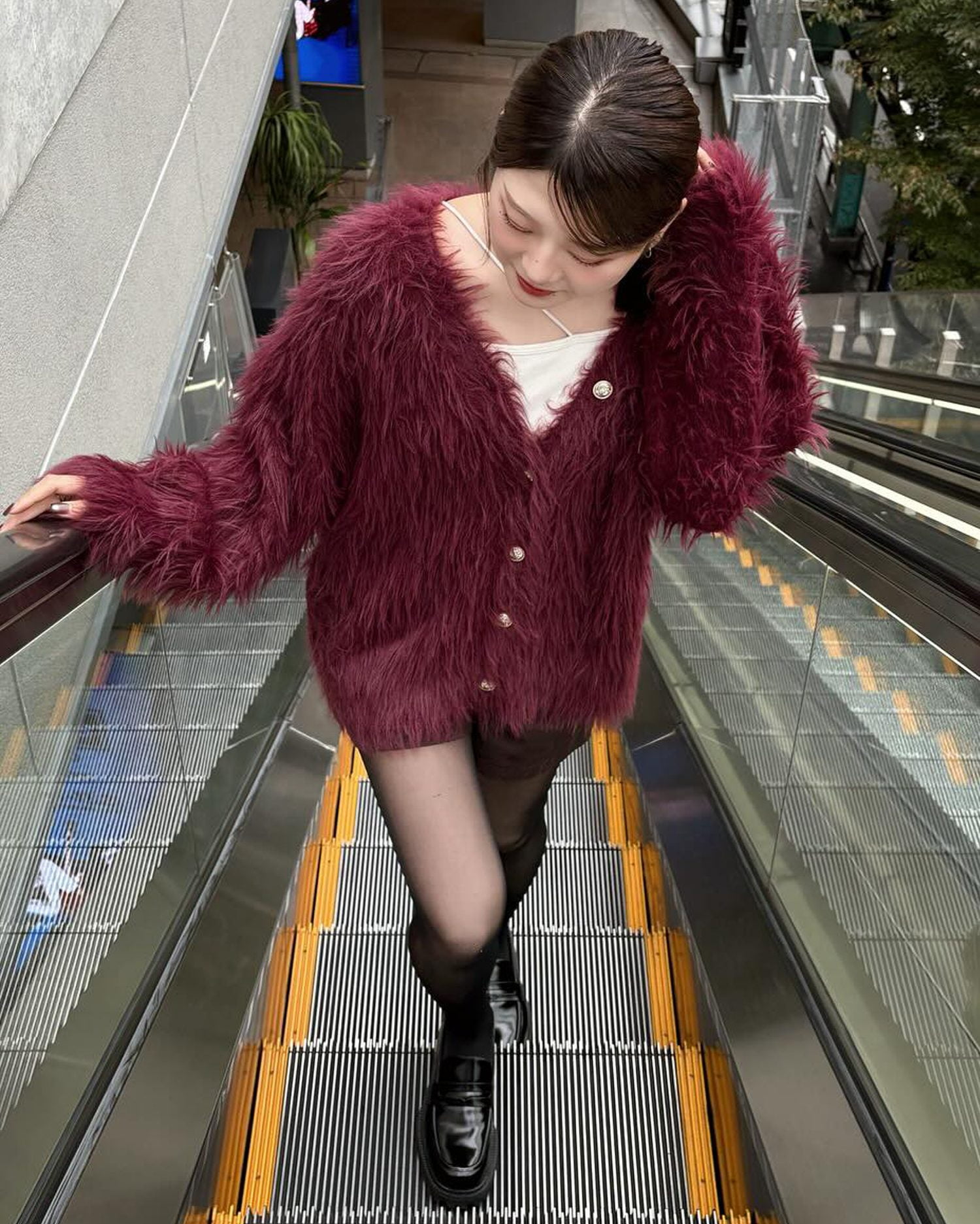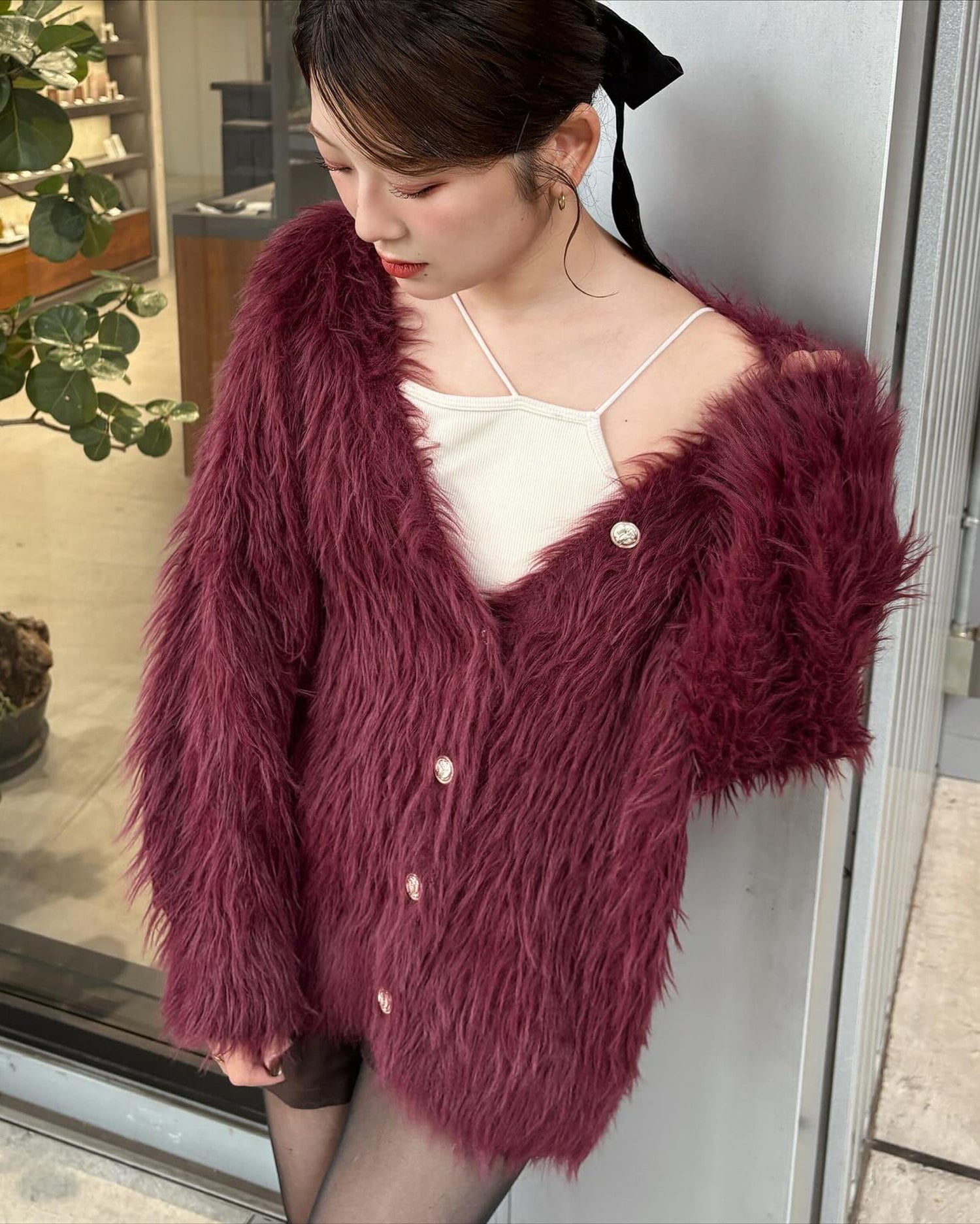 毛足の長いフェザーニットがインパクト抜群のロング丈カーディガンです。