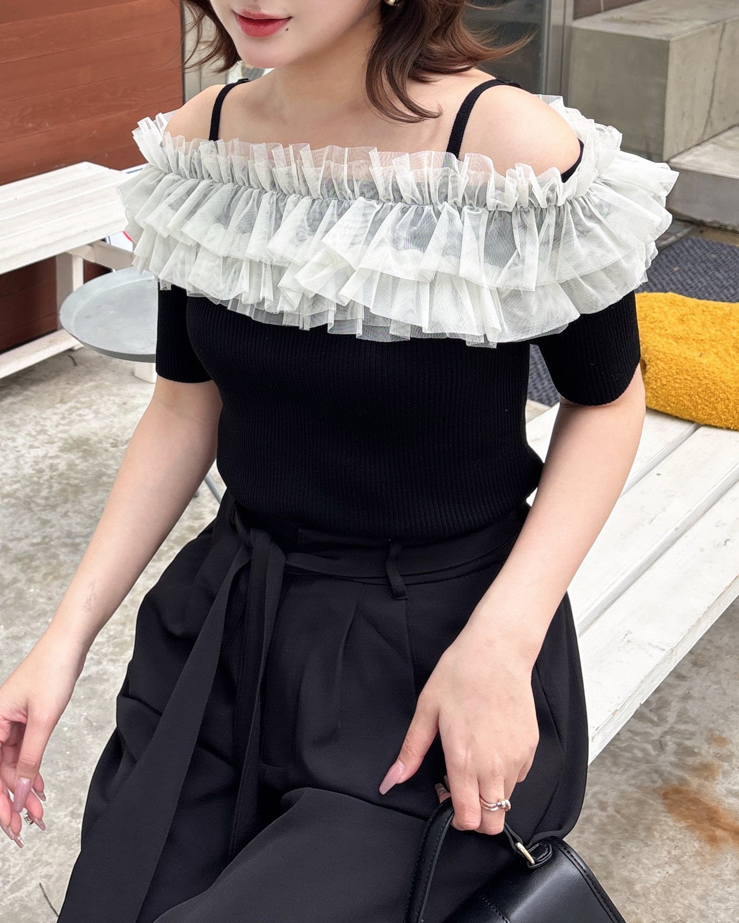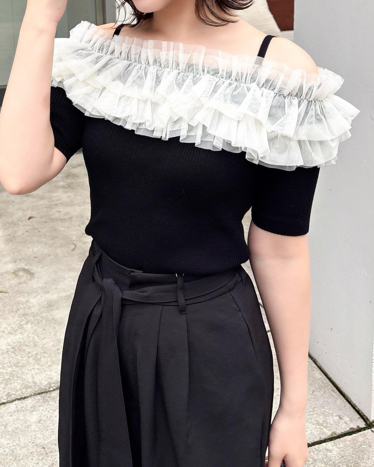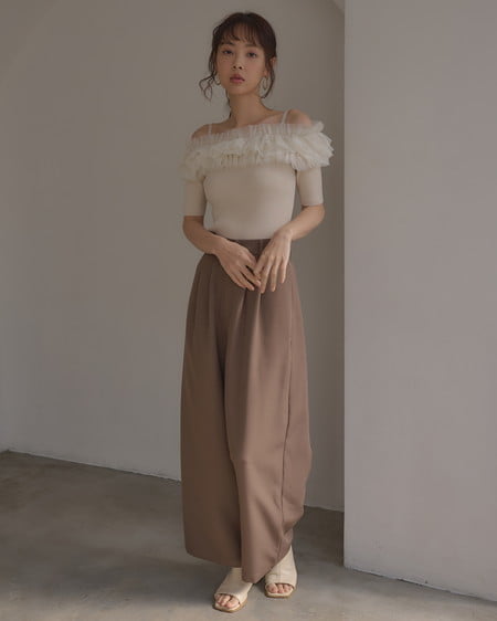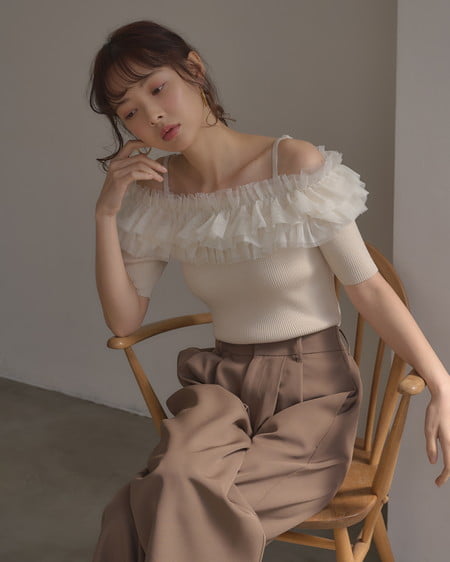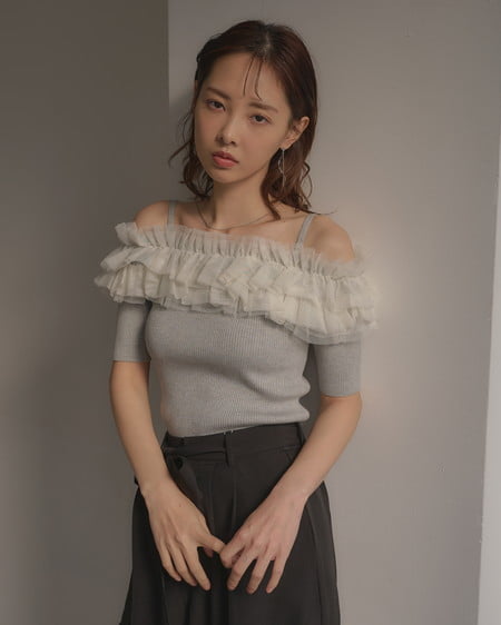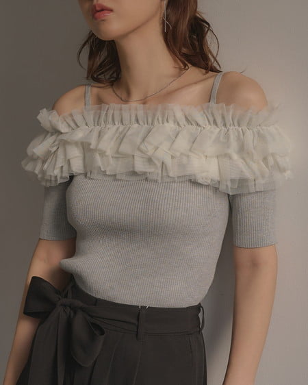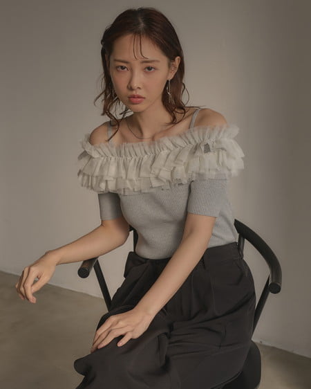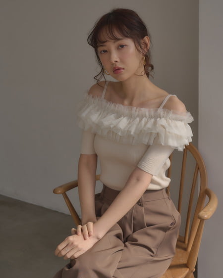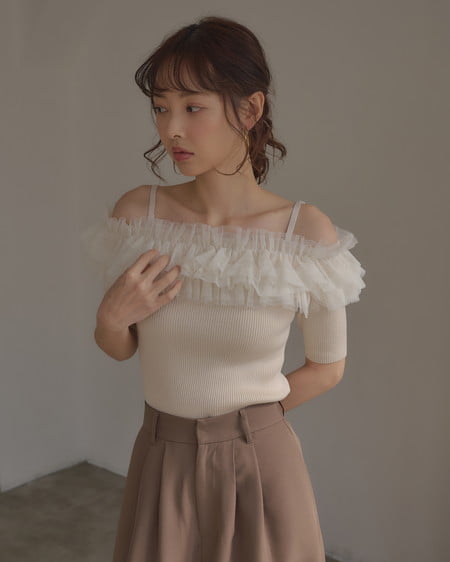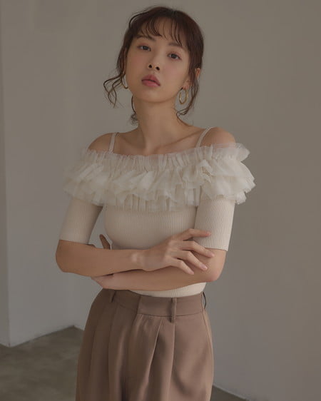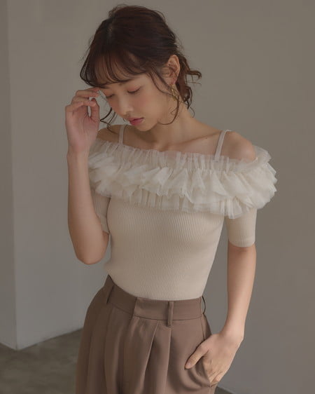 胸元のチュールが華やかなアクセントになったニットトップス。