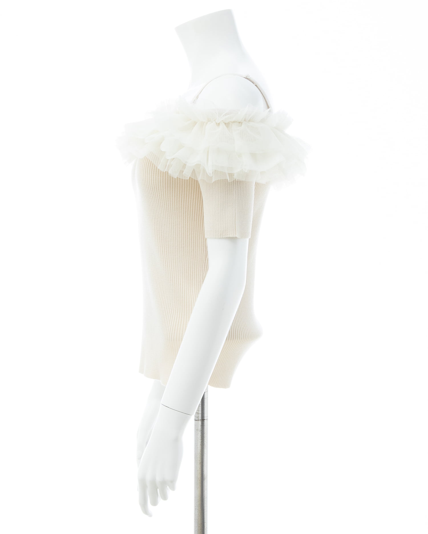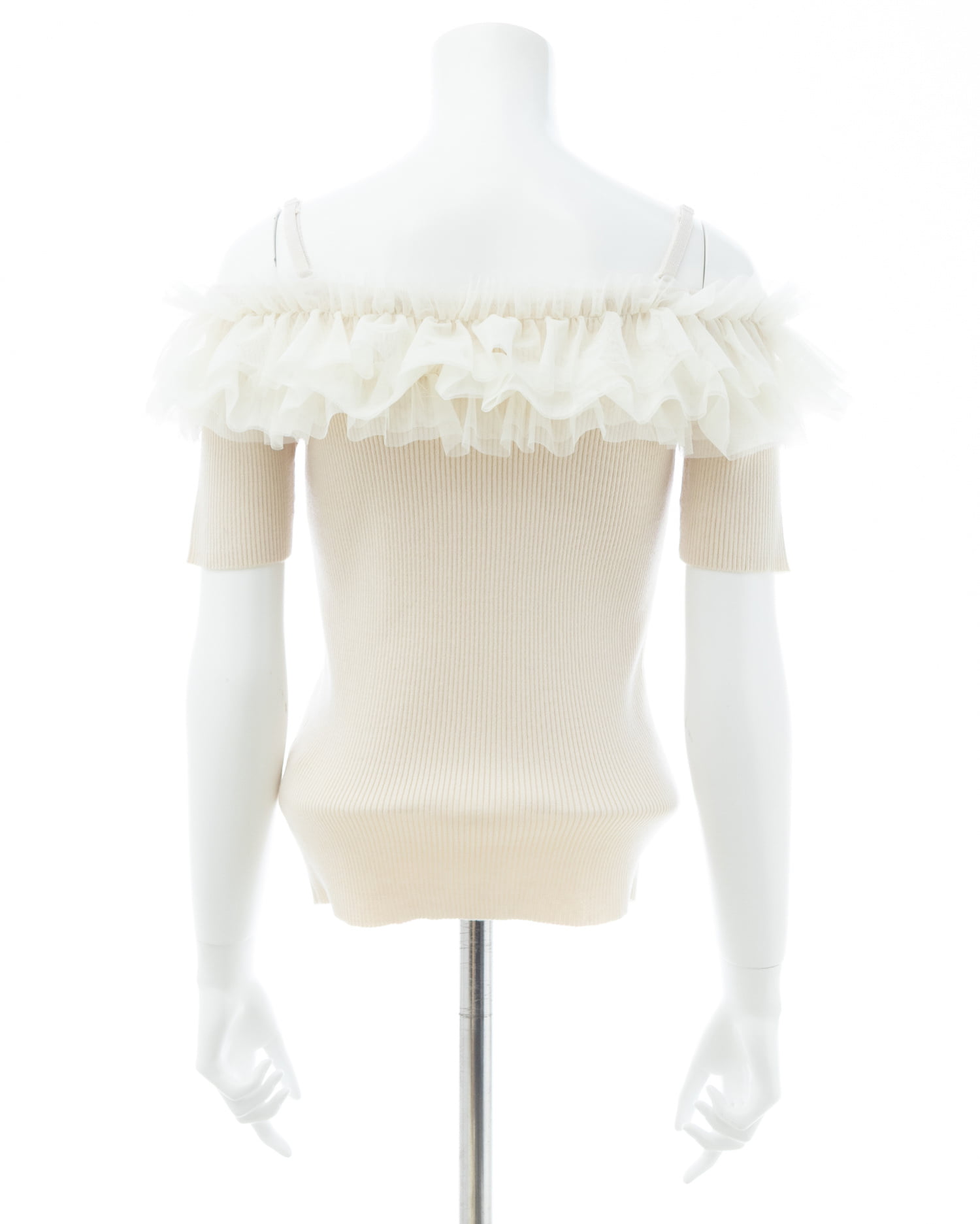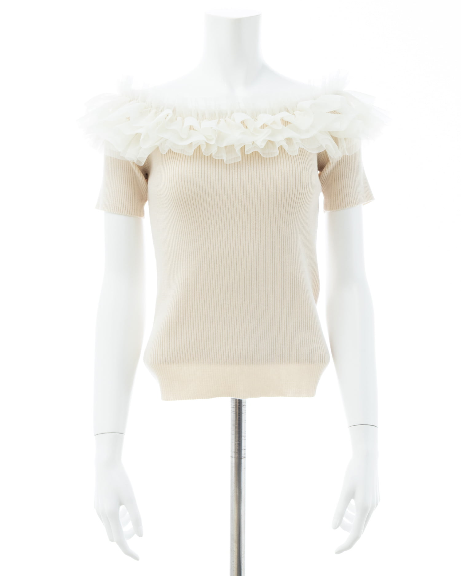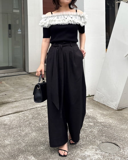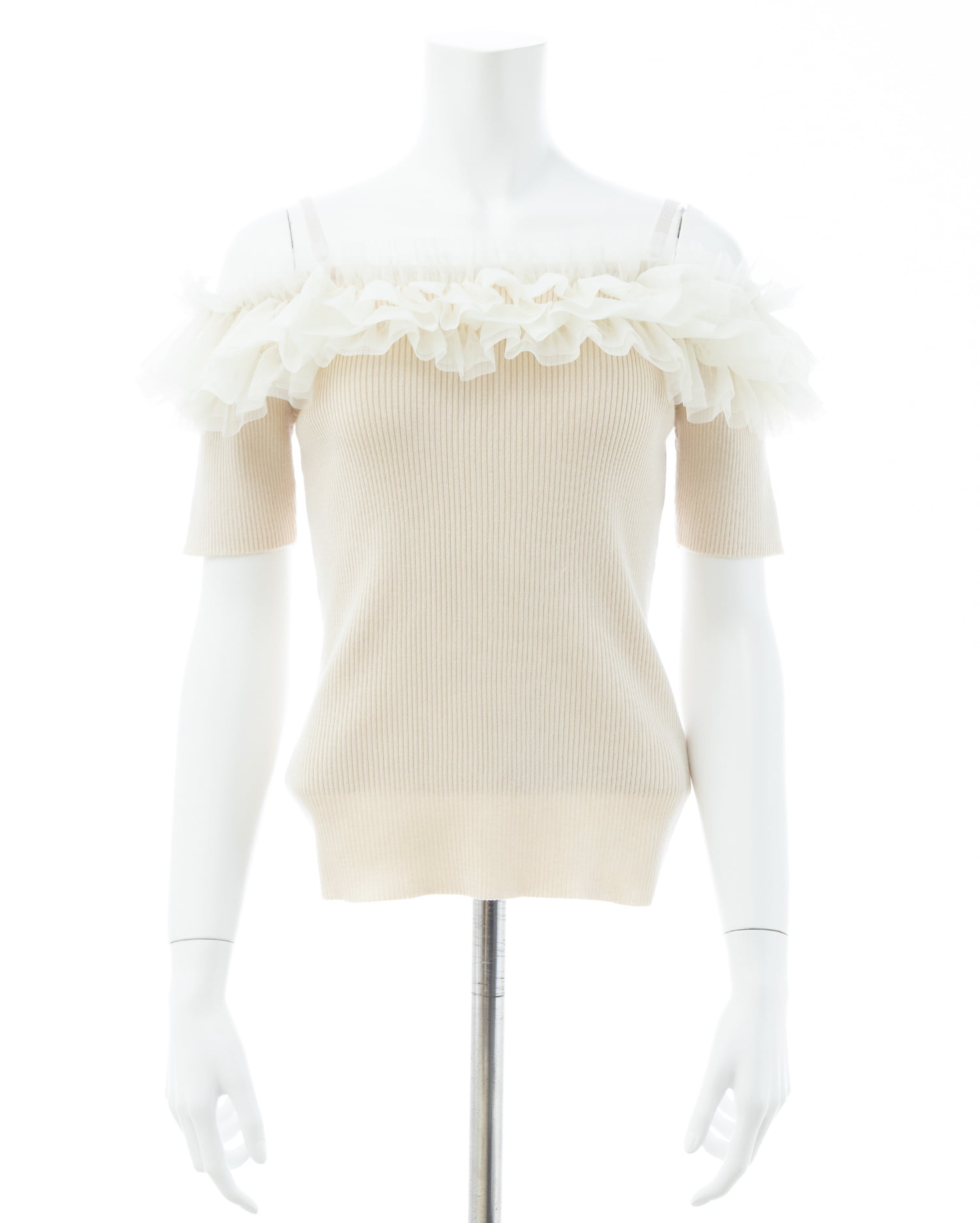 胸元のチュールが華やかなアクセントになったニットトップス。