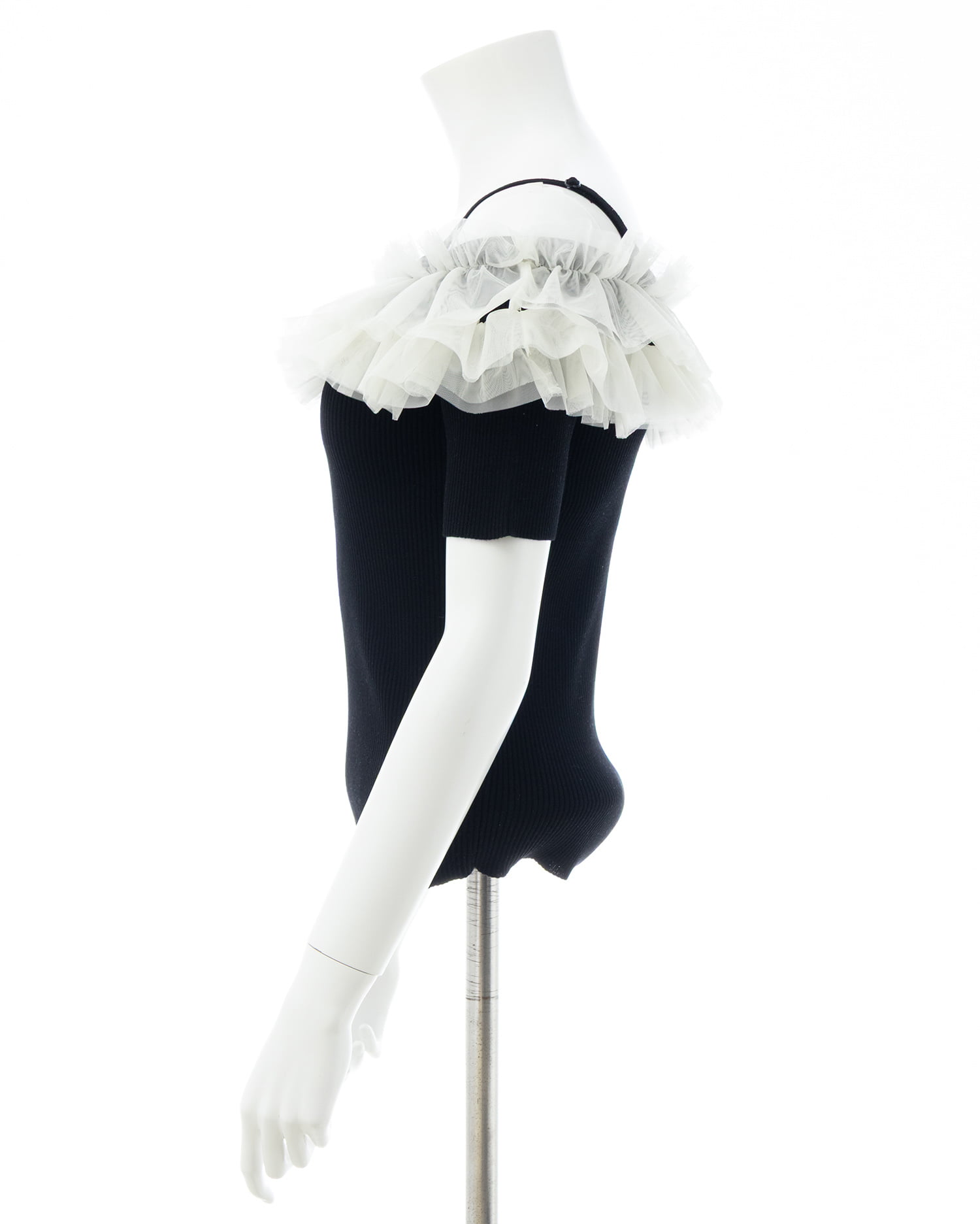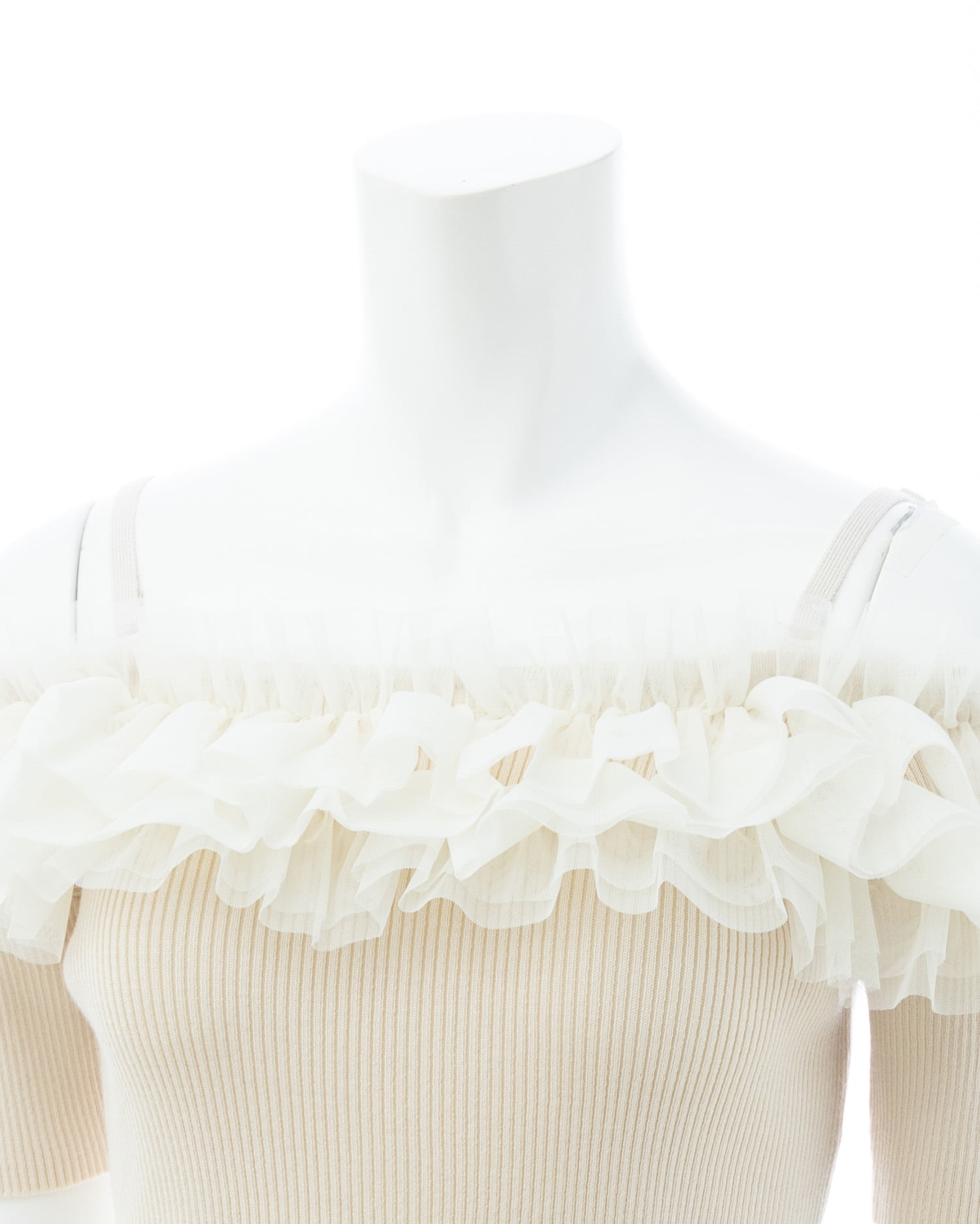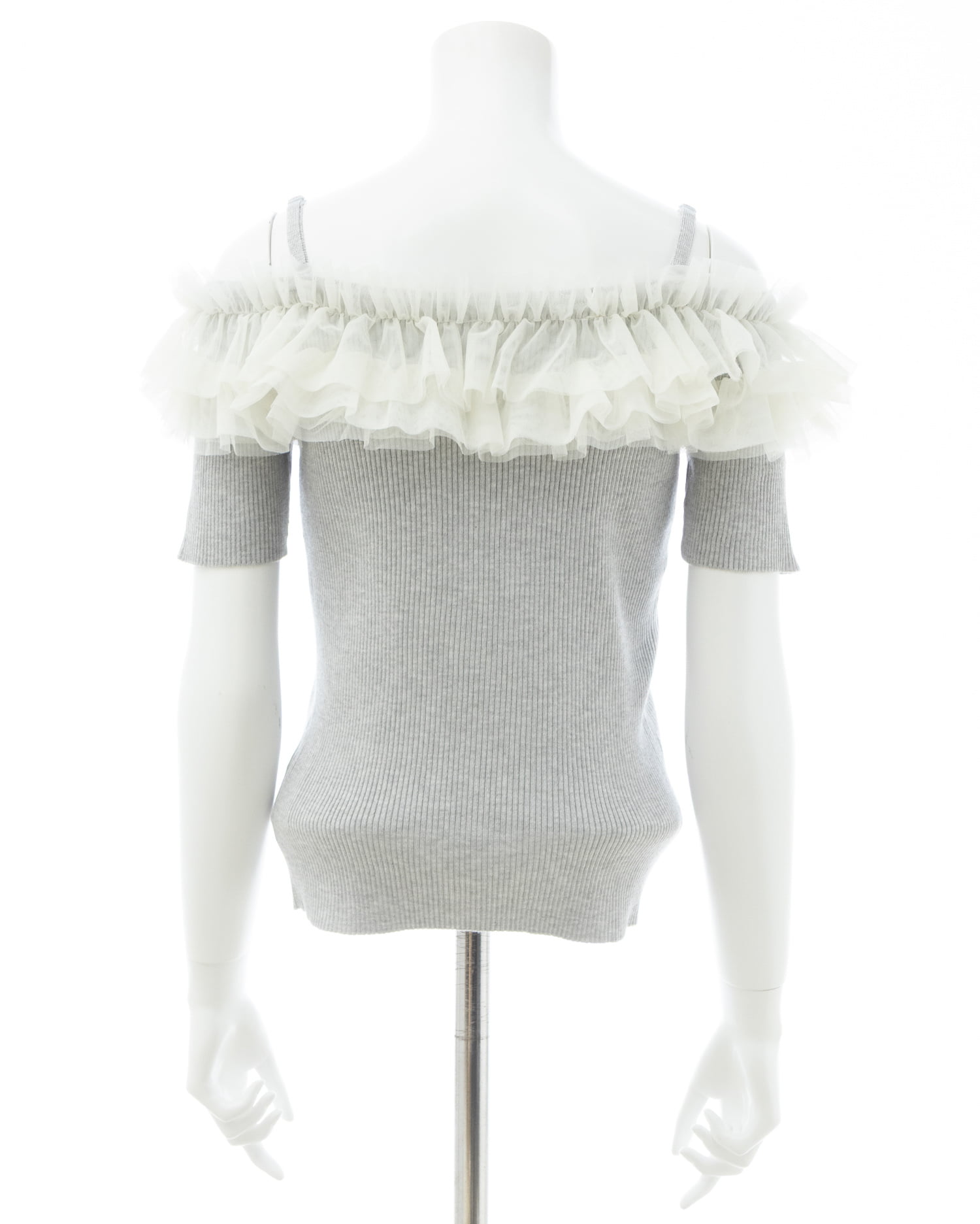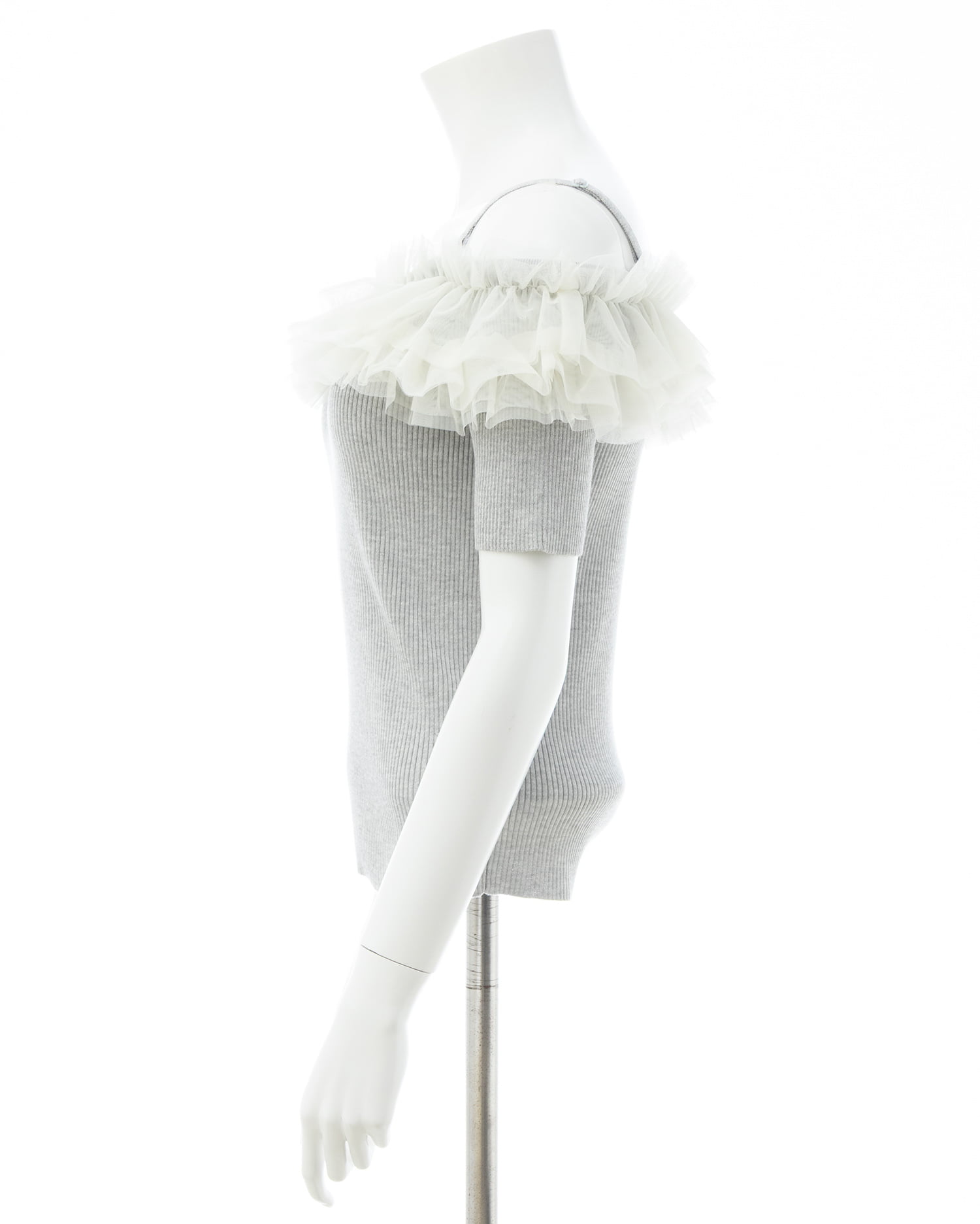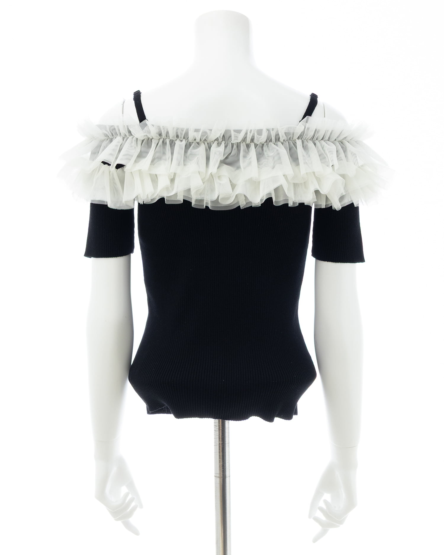 胸元のチュールが華やかなアクセントになったニットトップス。