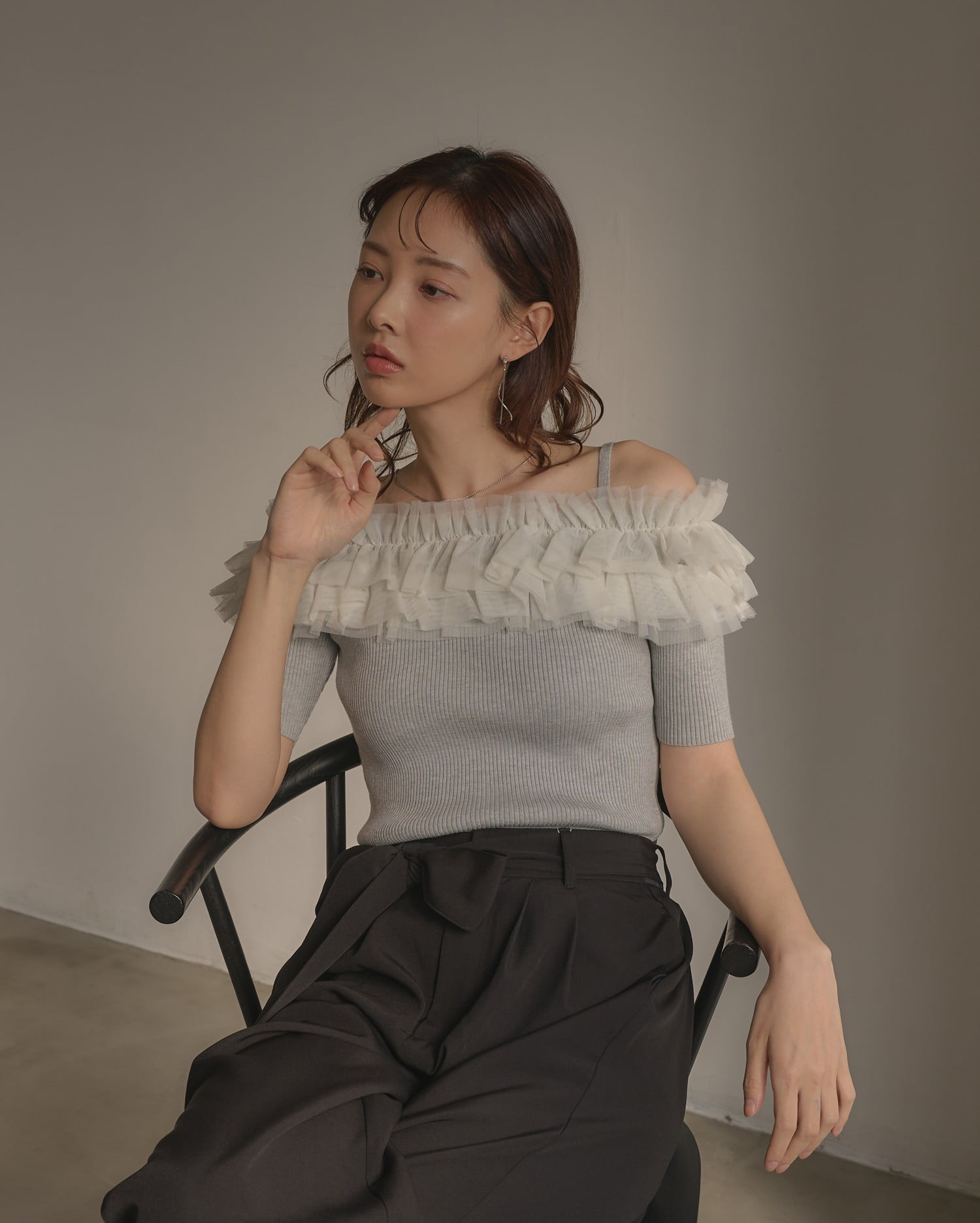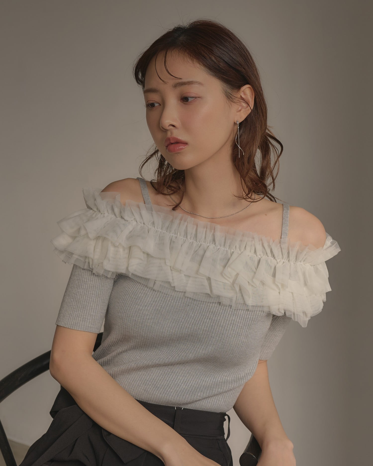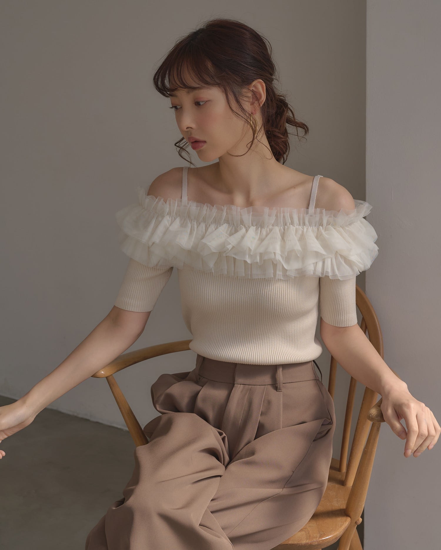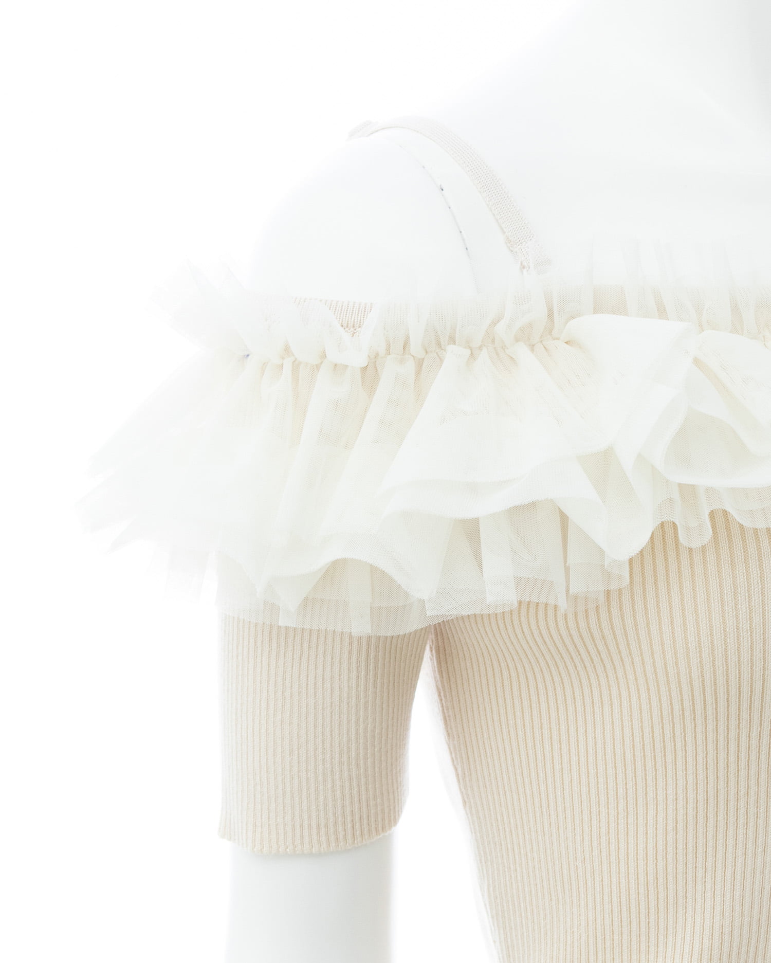 胸元のチュールが華やかなアクセントになったニットトップス。
