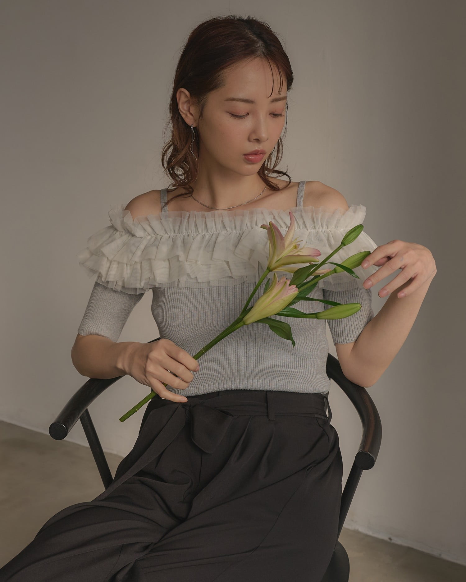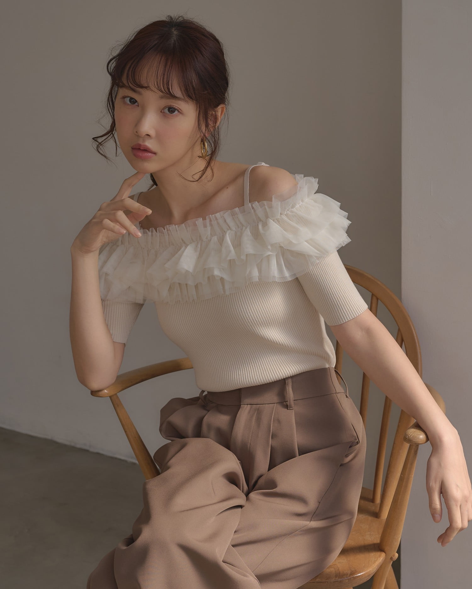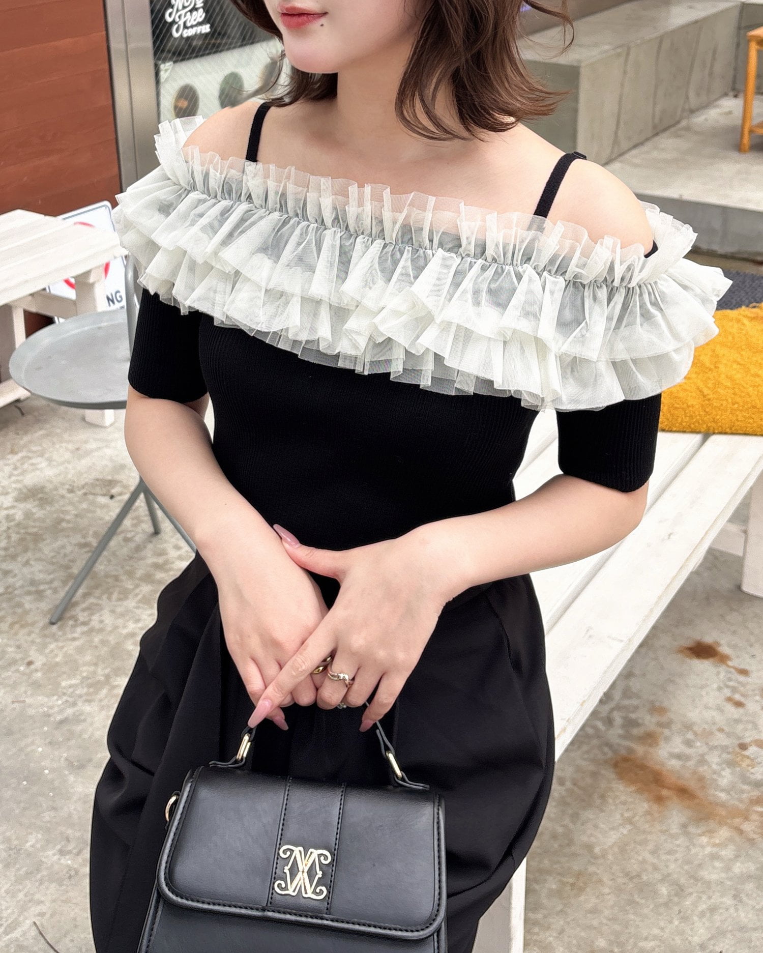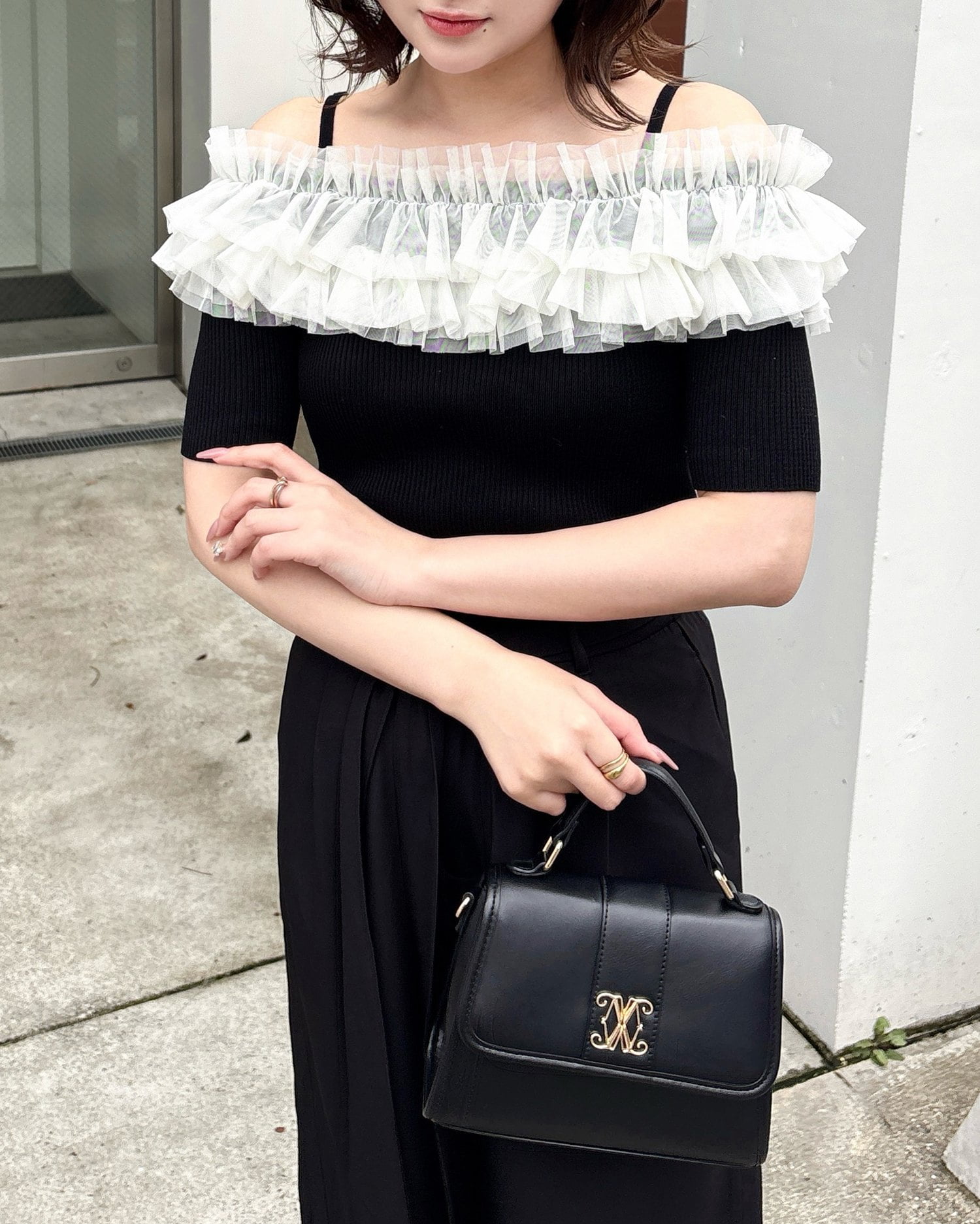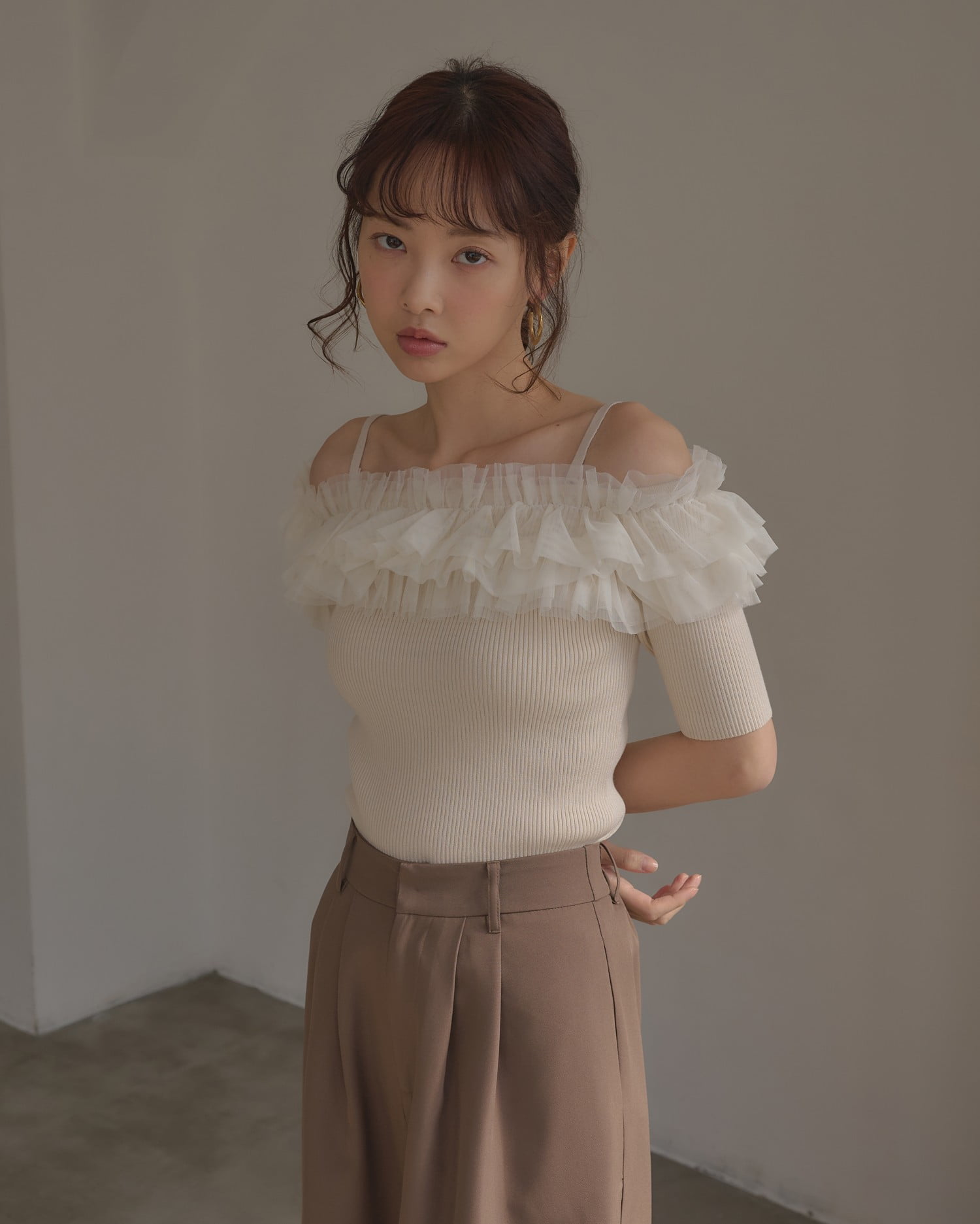 胸元のチュールが華やかなアクセントになったニットトップス。