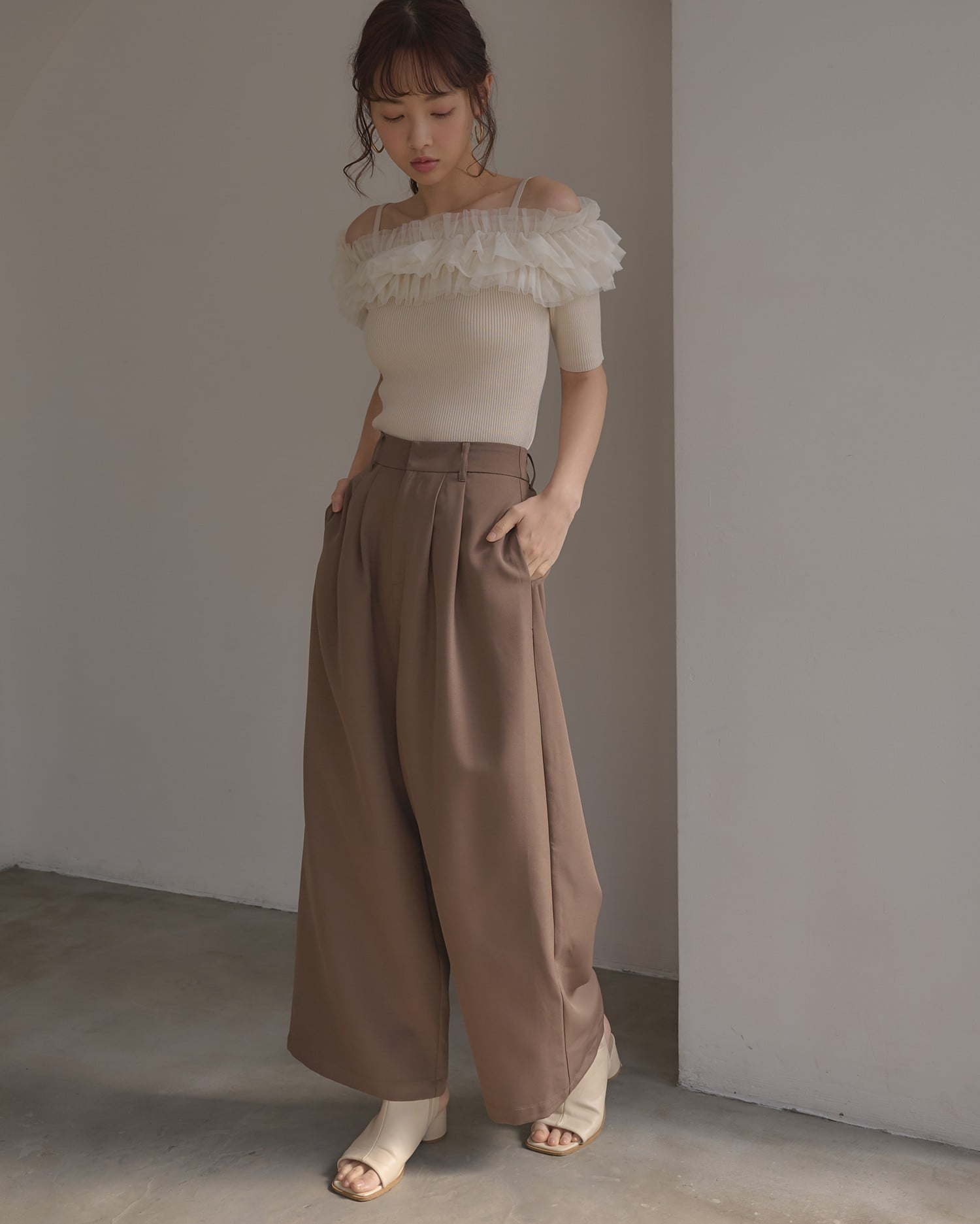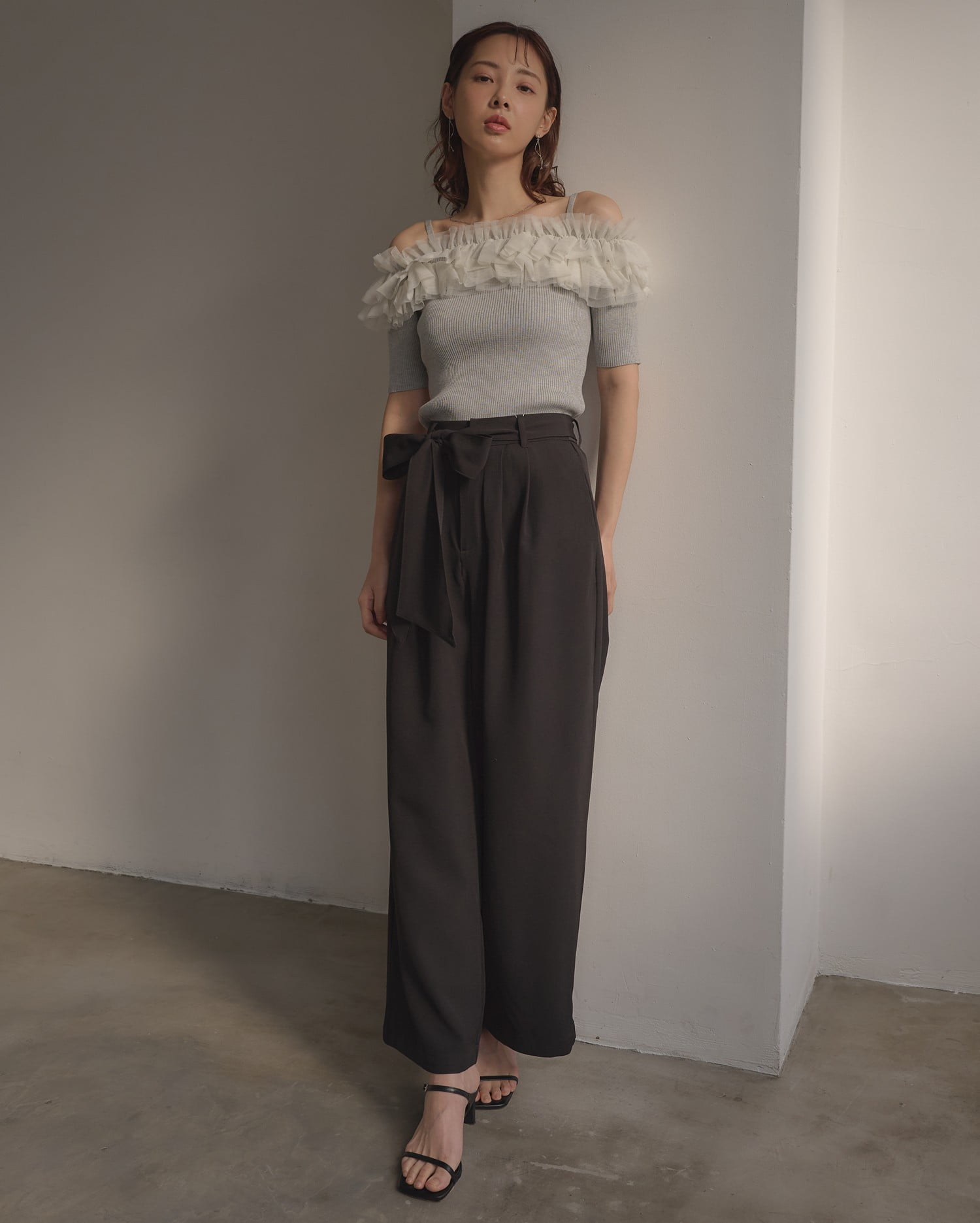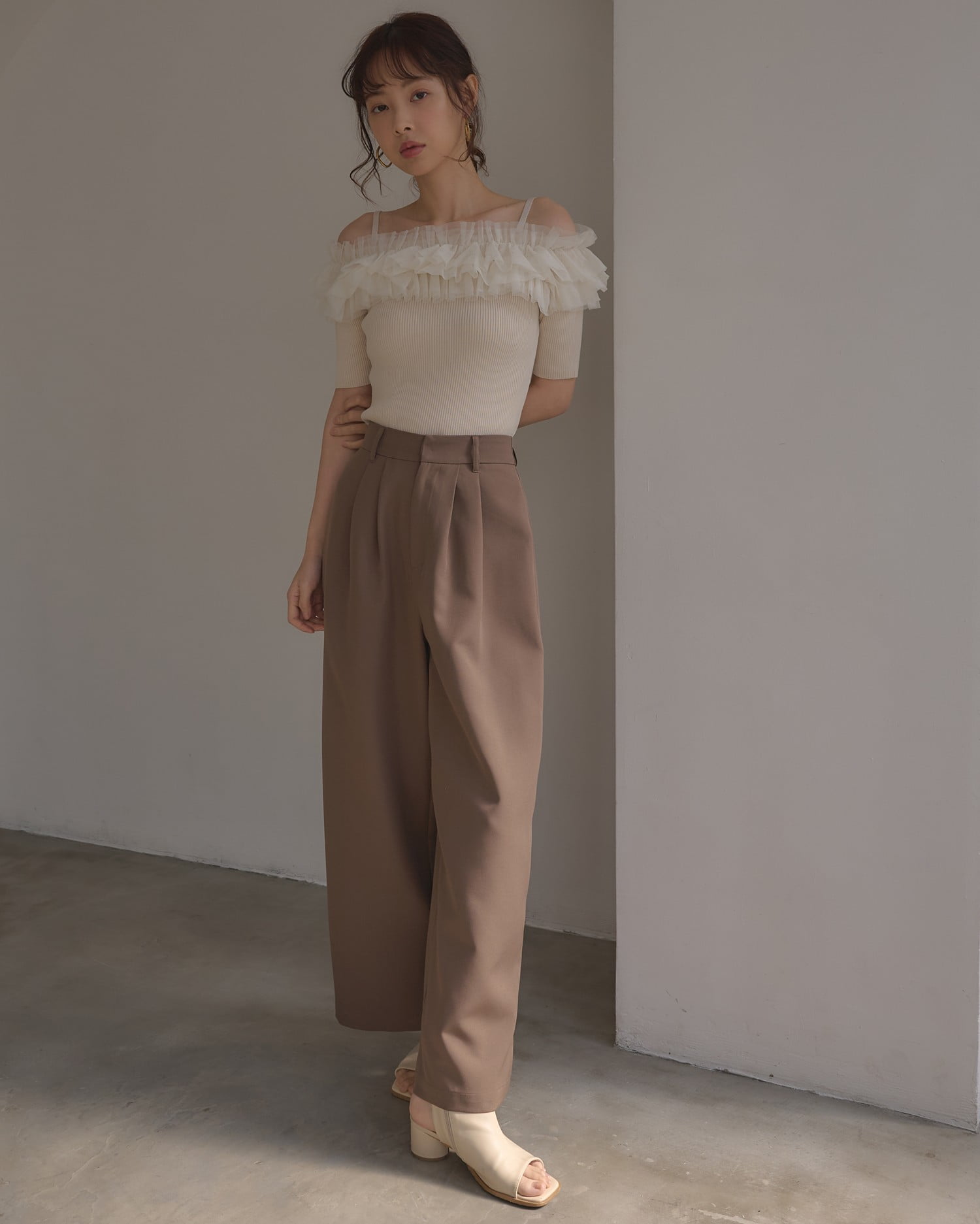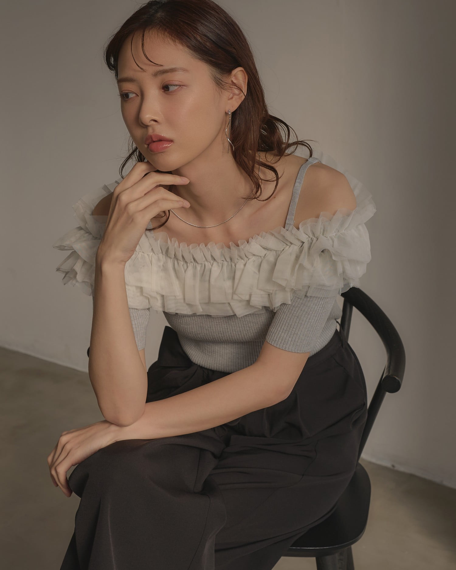 胸元のチュールが華やかなアクセントになったニットトップス。