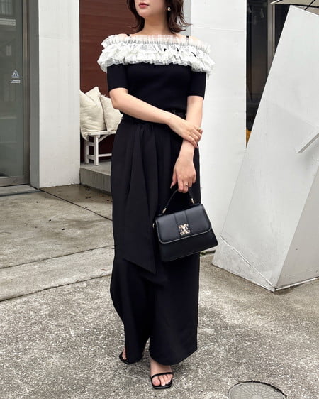 デコルテラインをすっきりキレイに見せてくれるオフショルダーデザインで、