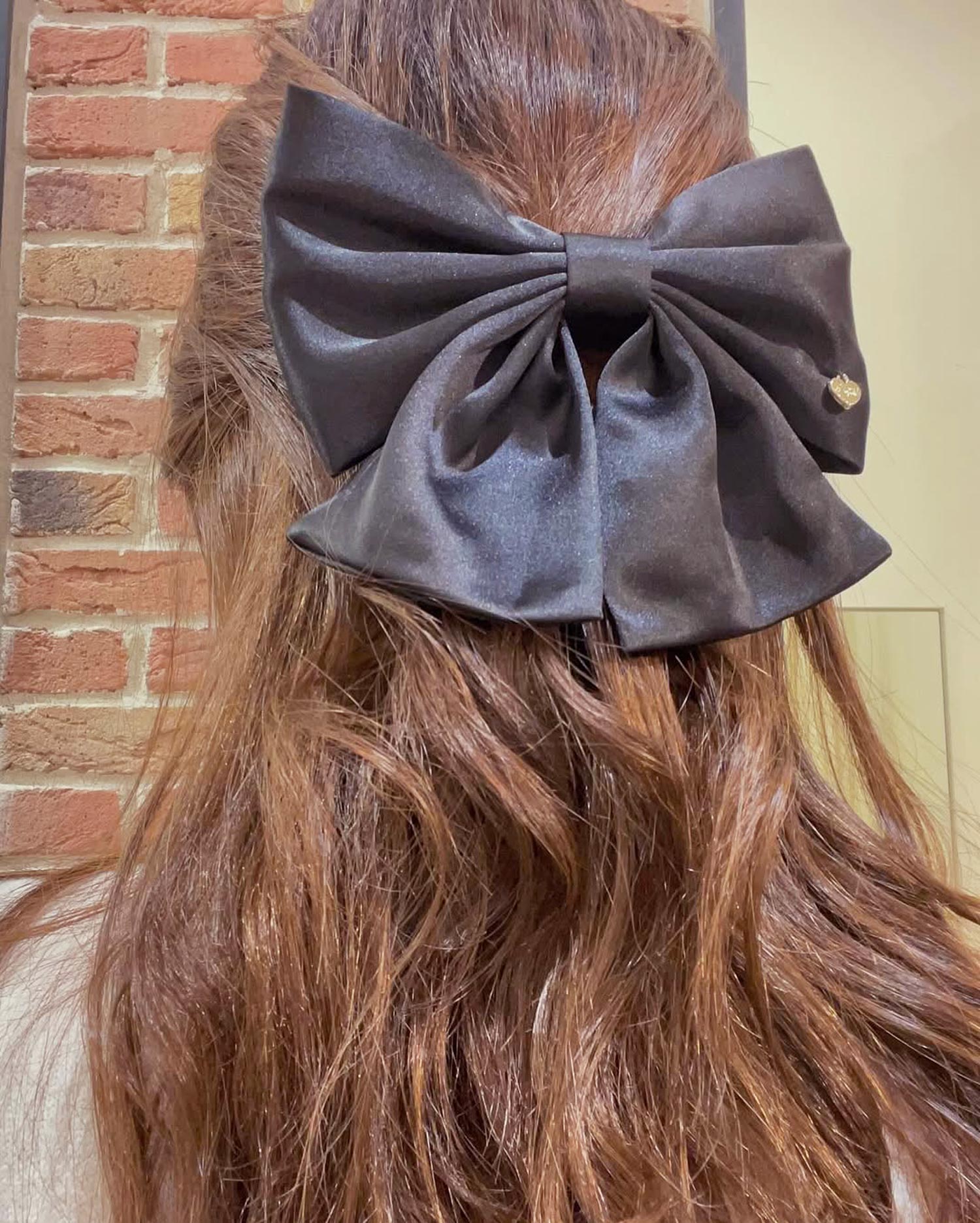 光沢のあるサテン生地で仕立てたリボンバレッタ。