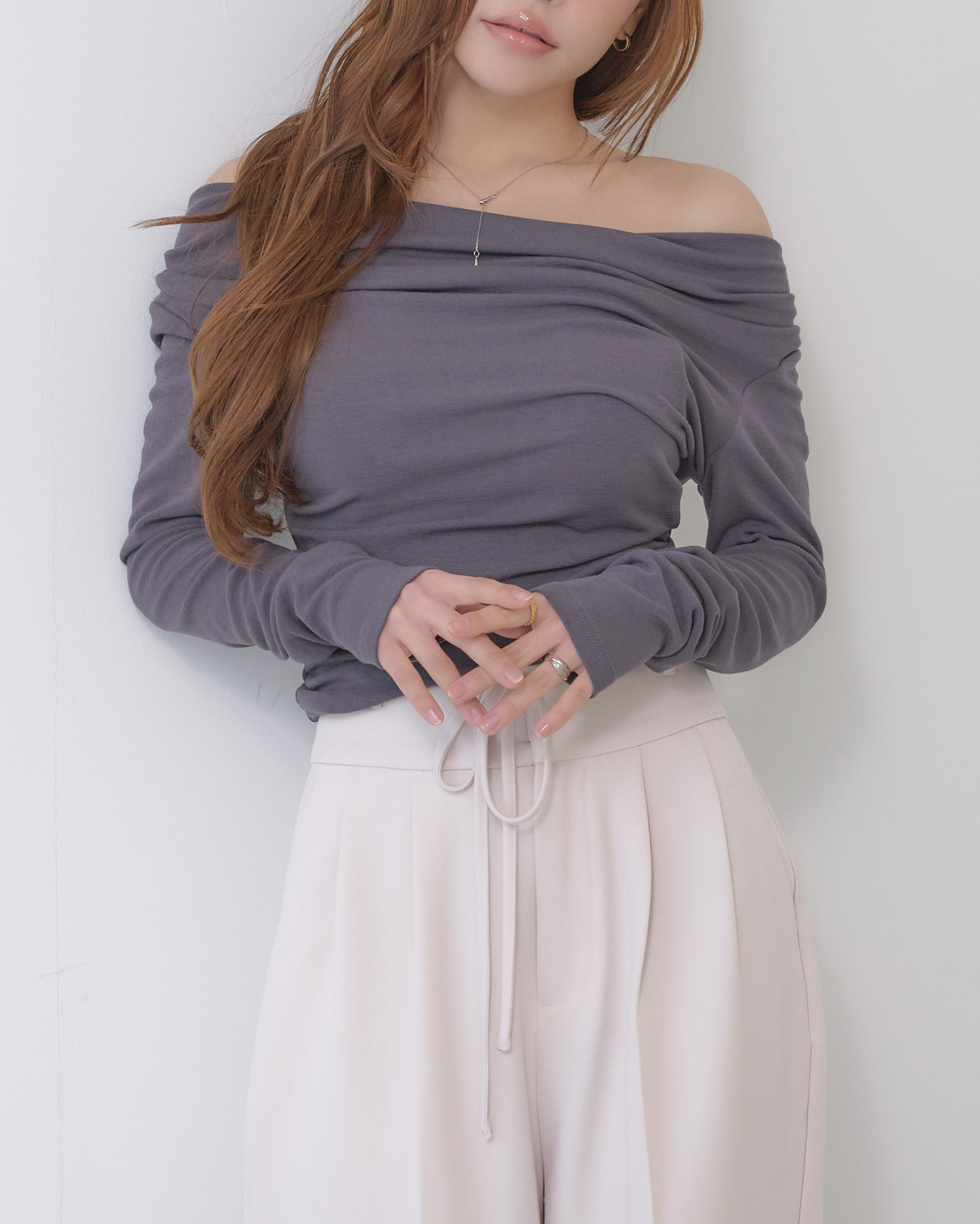 広めに開いたネックラインが顔周りをすっきり明るく彩ります。
