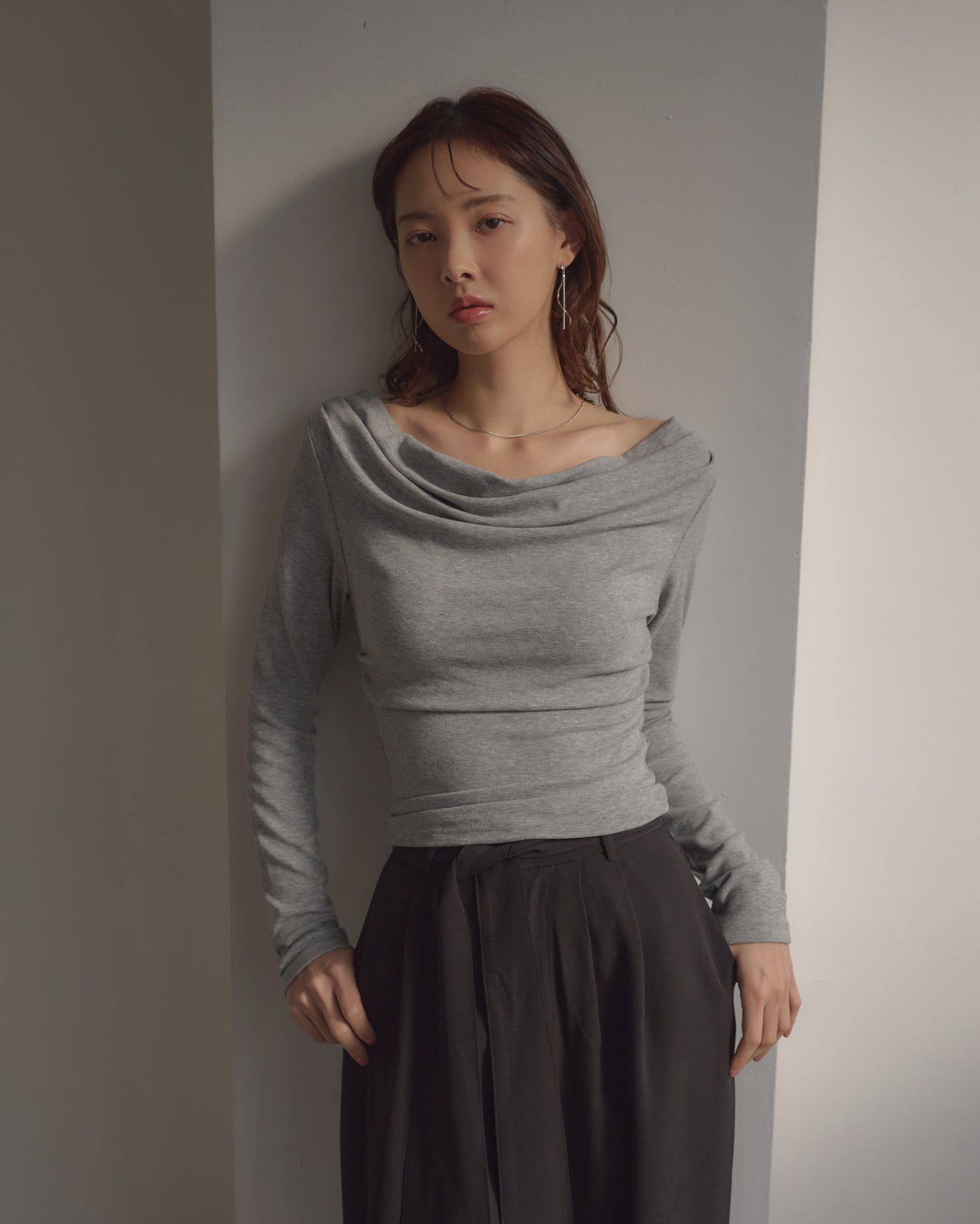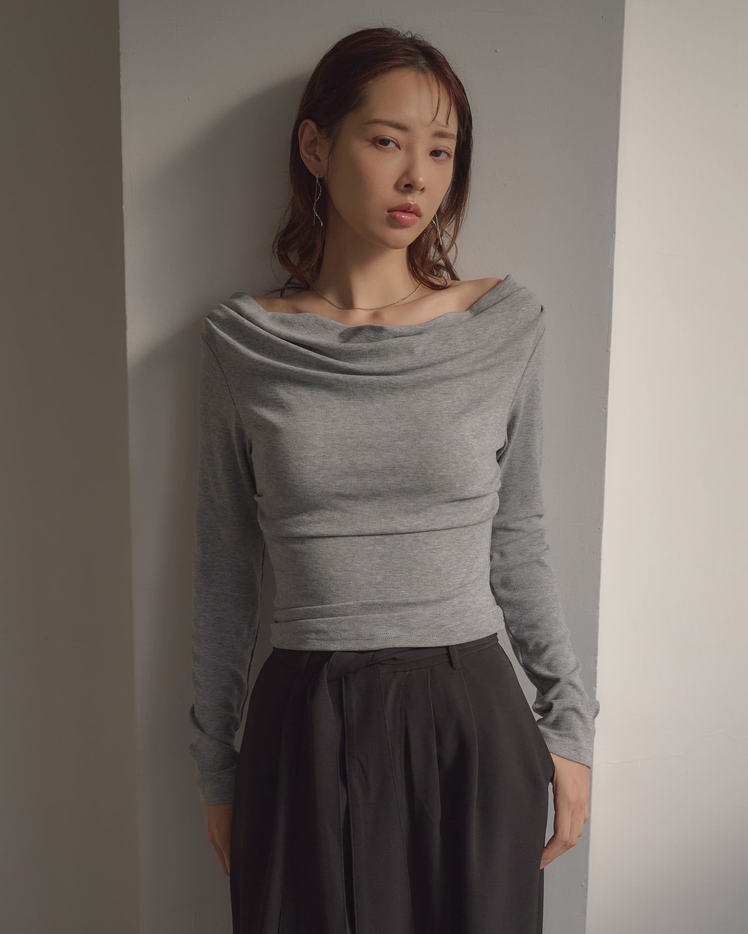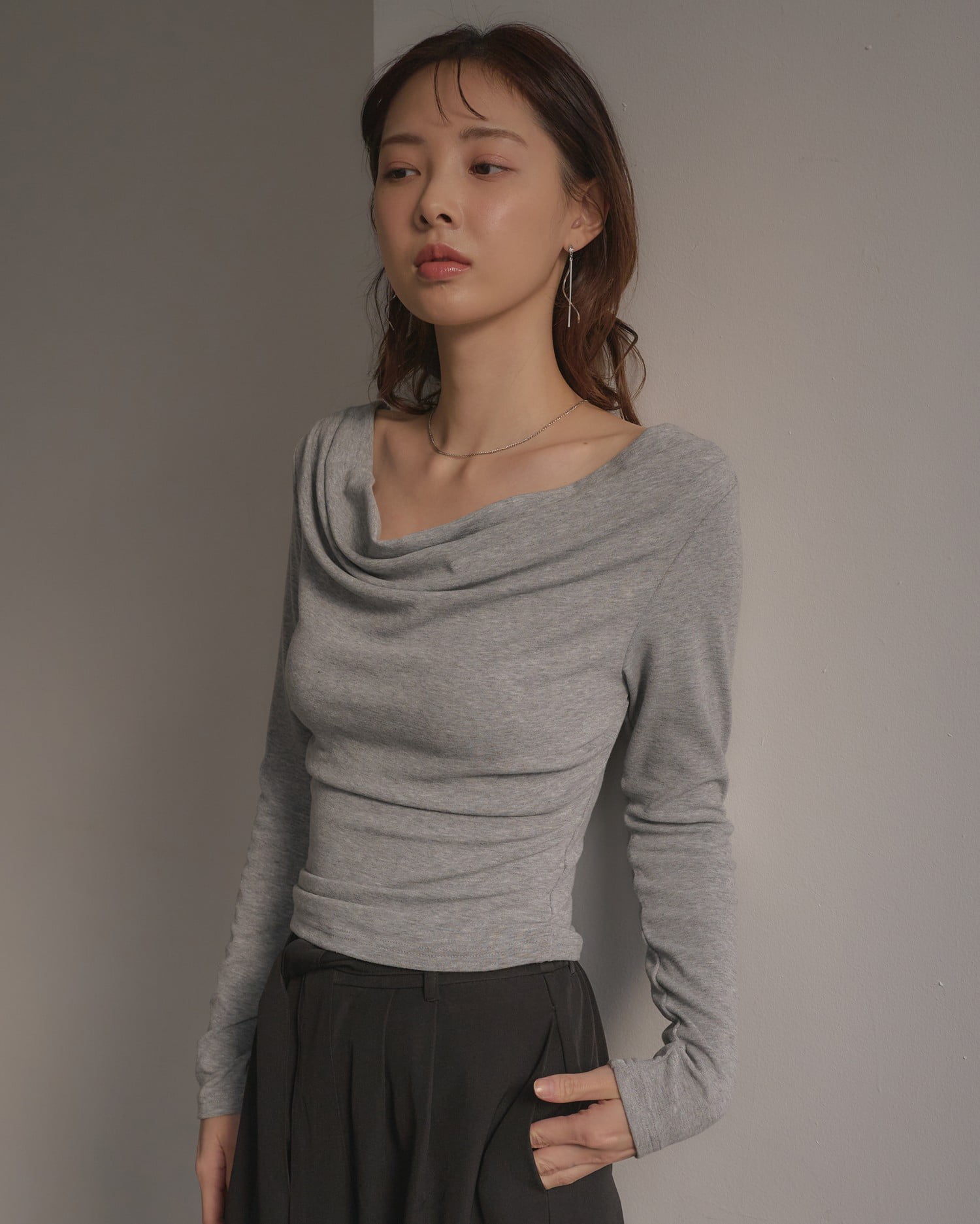 デコルテラインを美しく見せるドレープネック。
