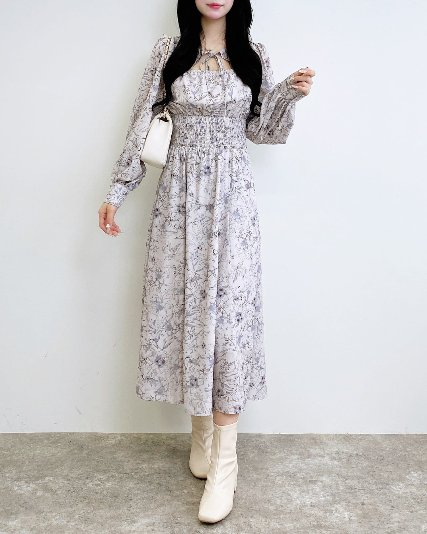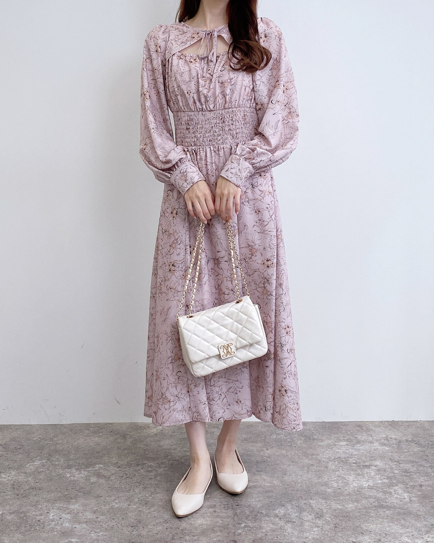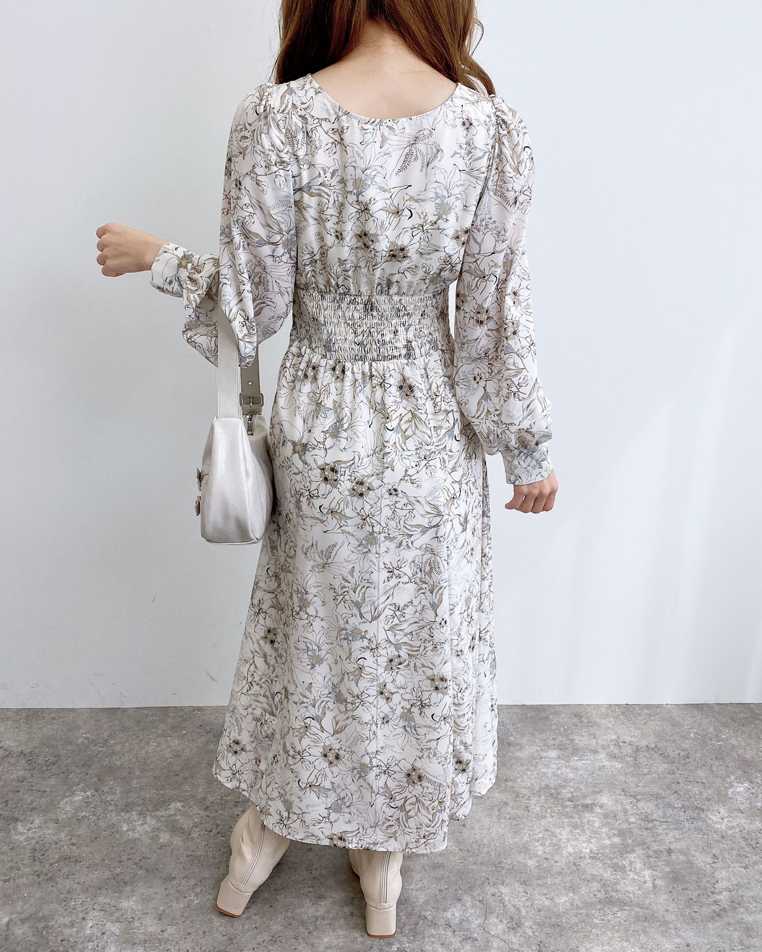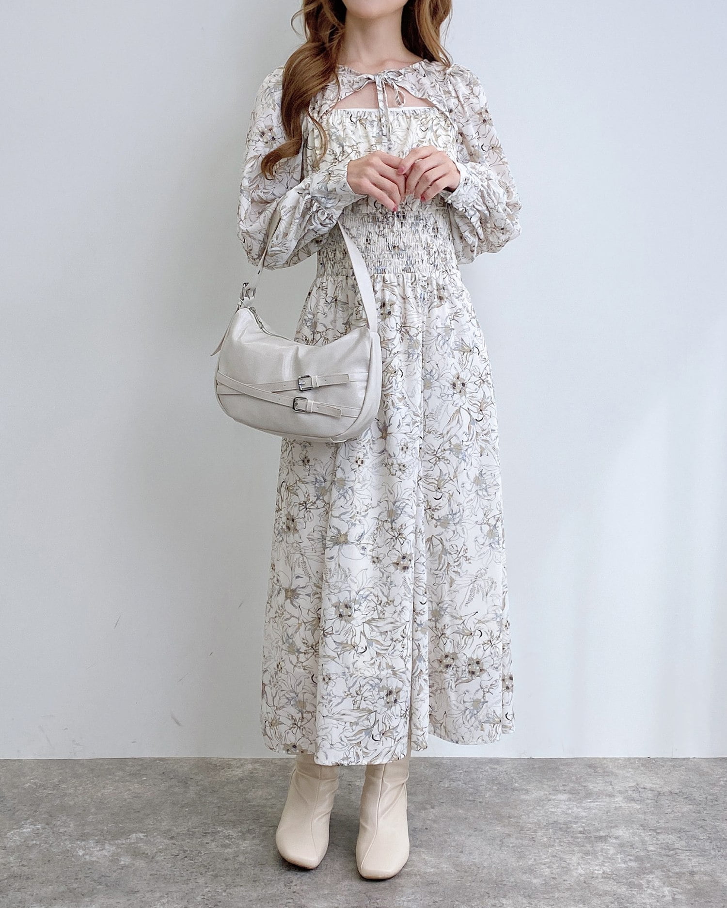 人気のデコルテオープンデザイン×フェミニンな花柄が大人かわいい雰囲気を演出。