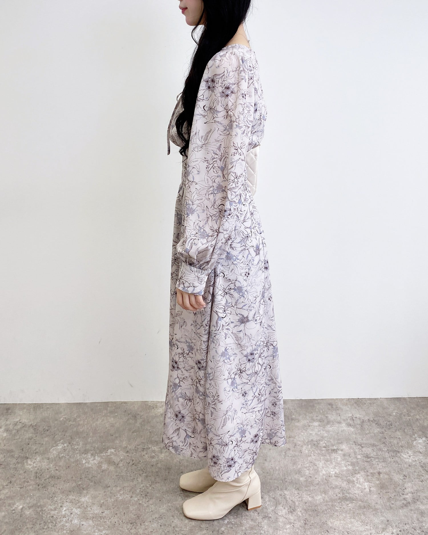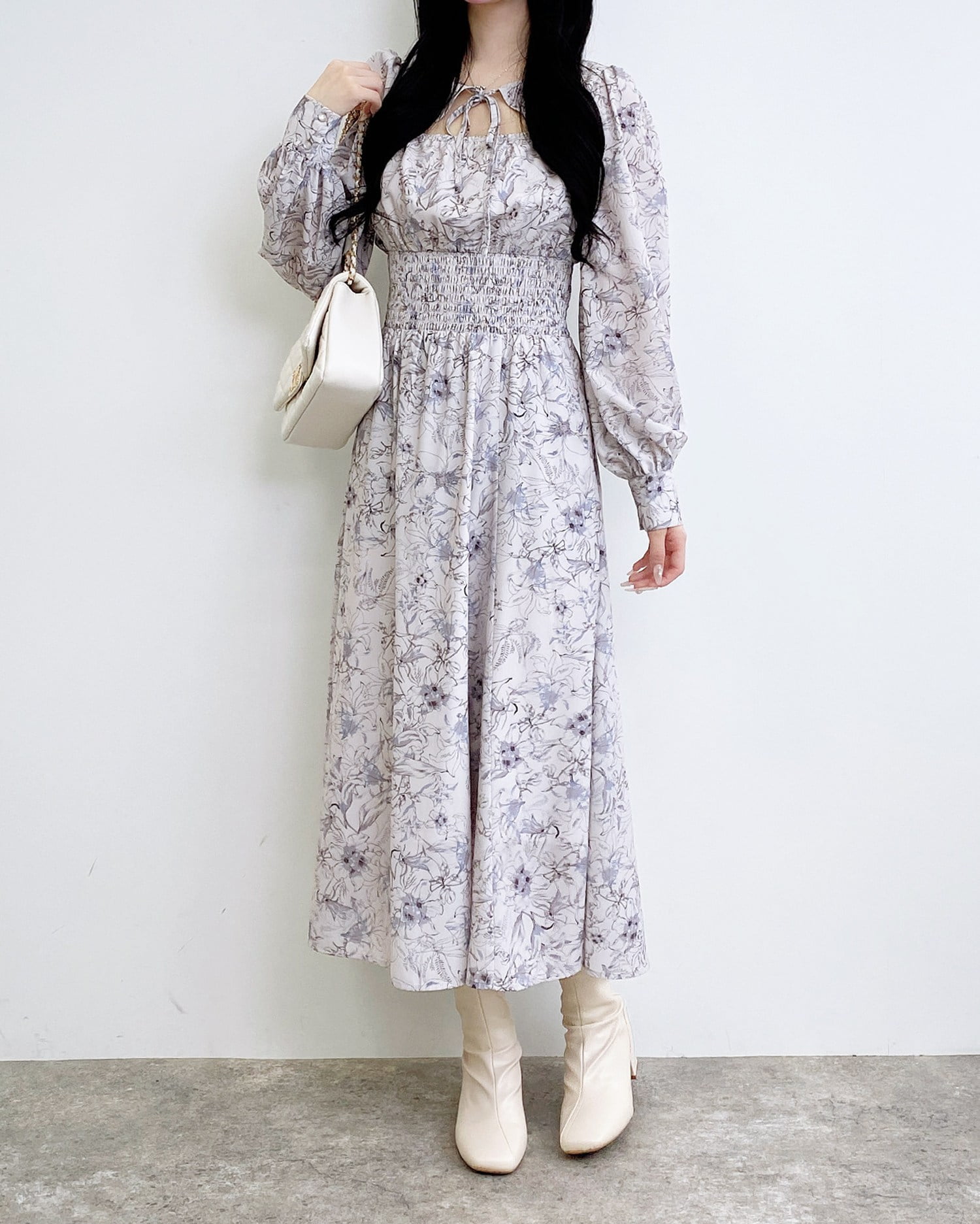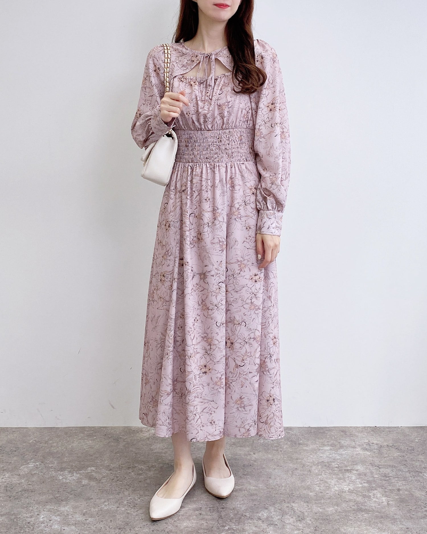 人気のデコルテオープンデザイン×フェミニンな花柄が大人かわいい雰囲気を演出。