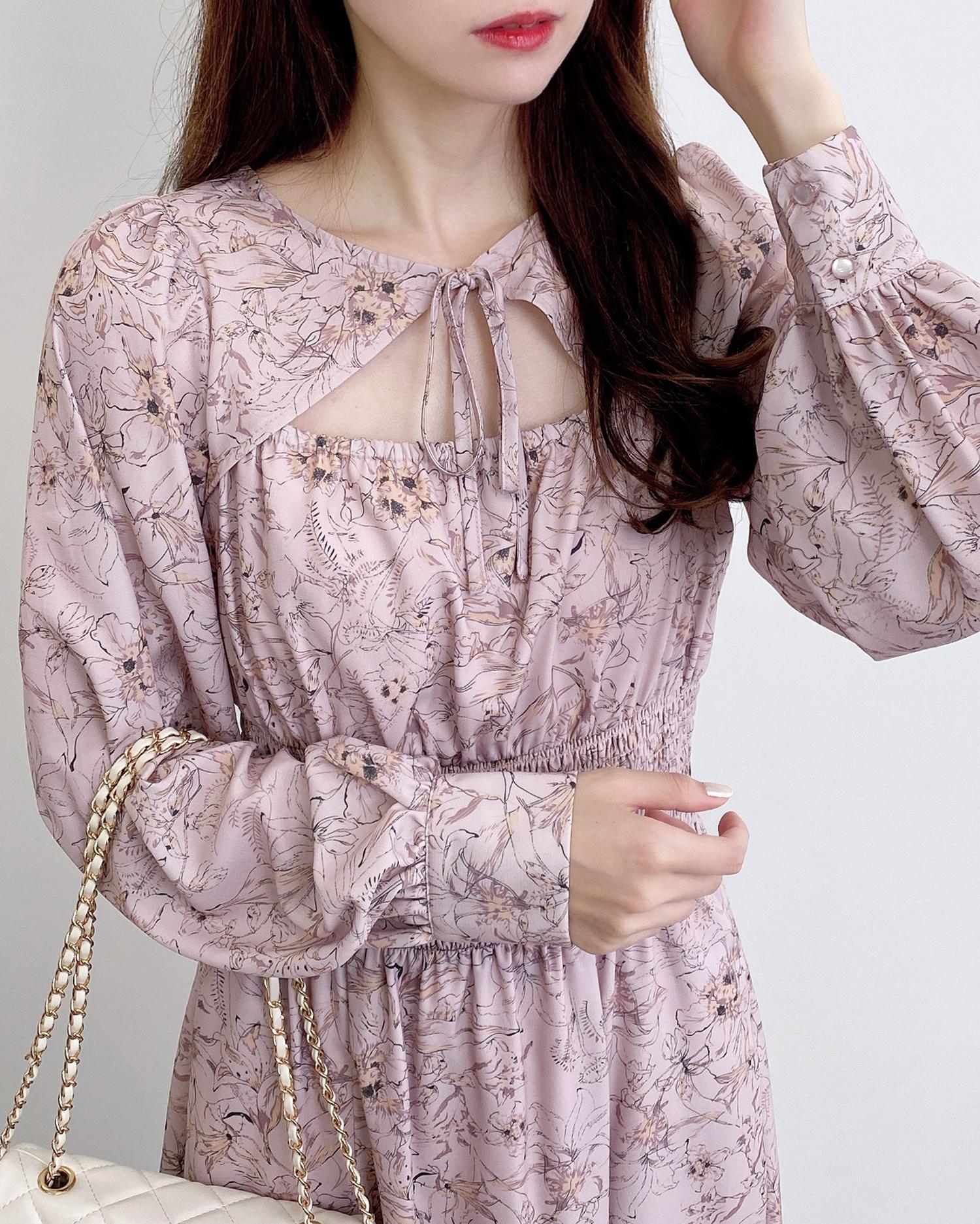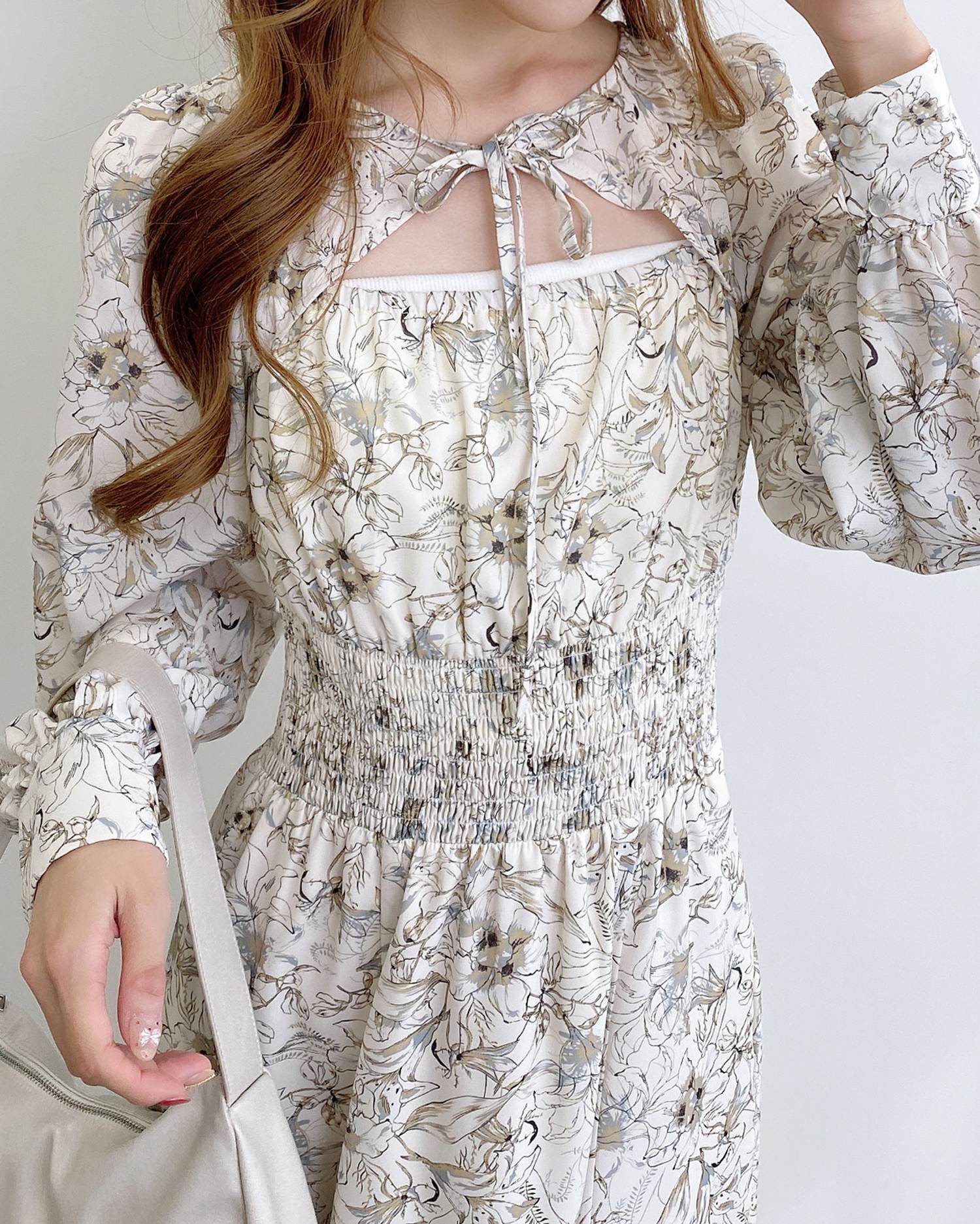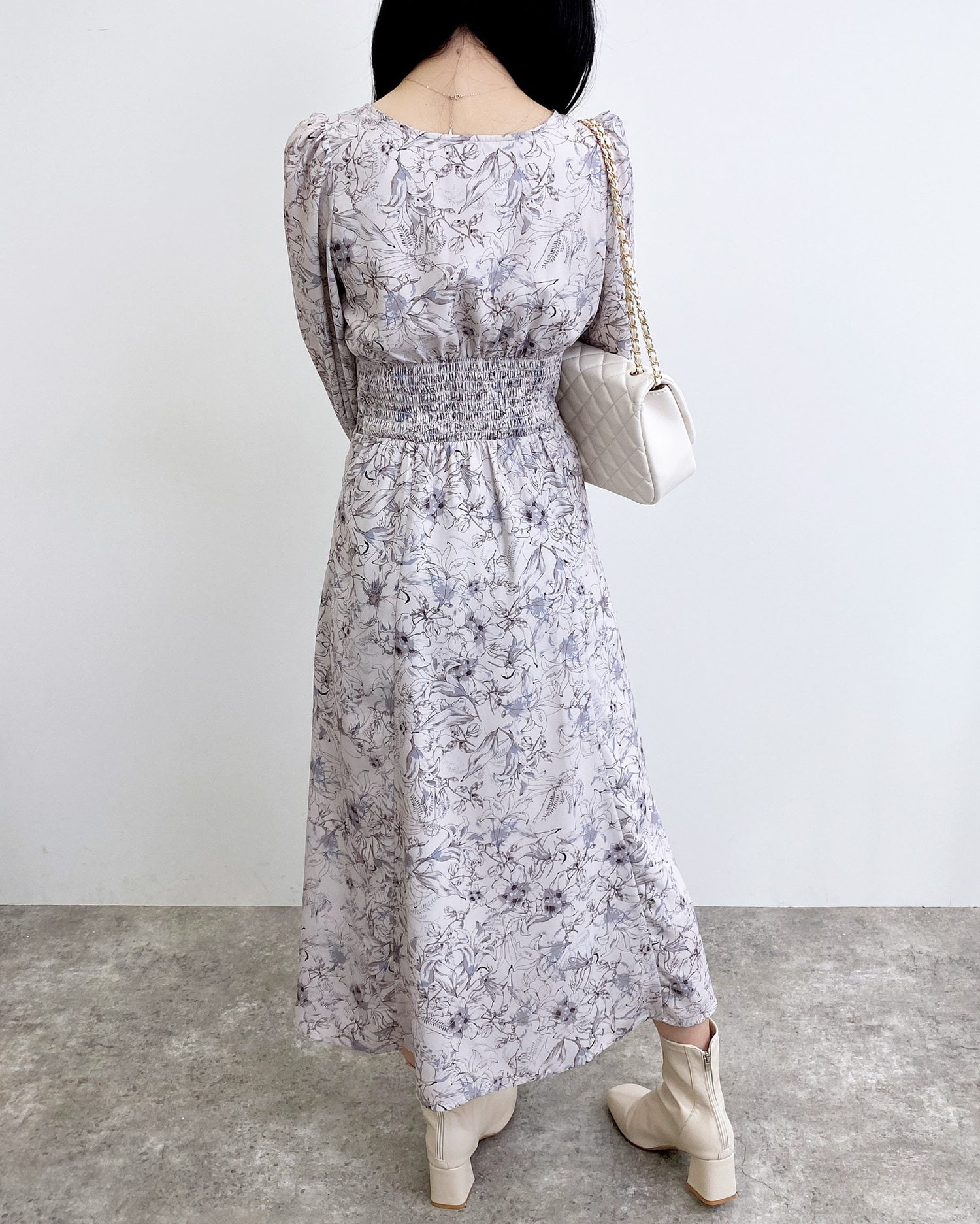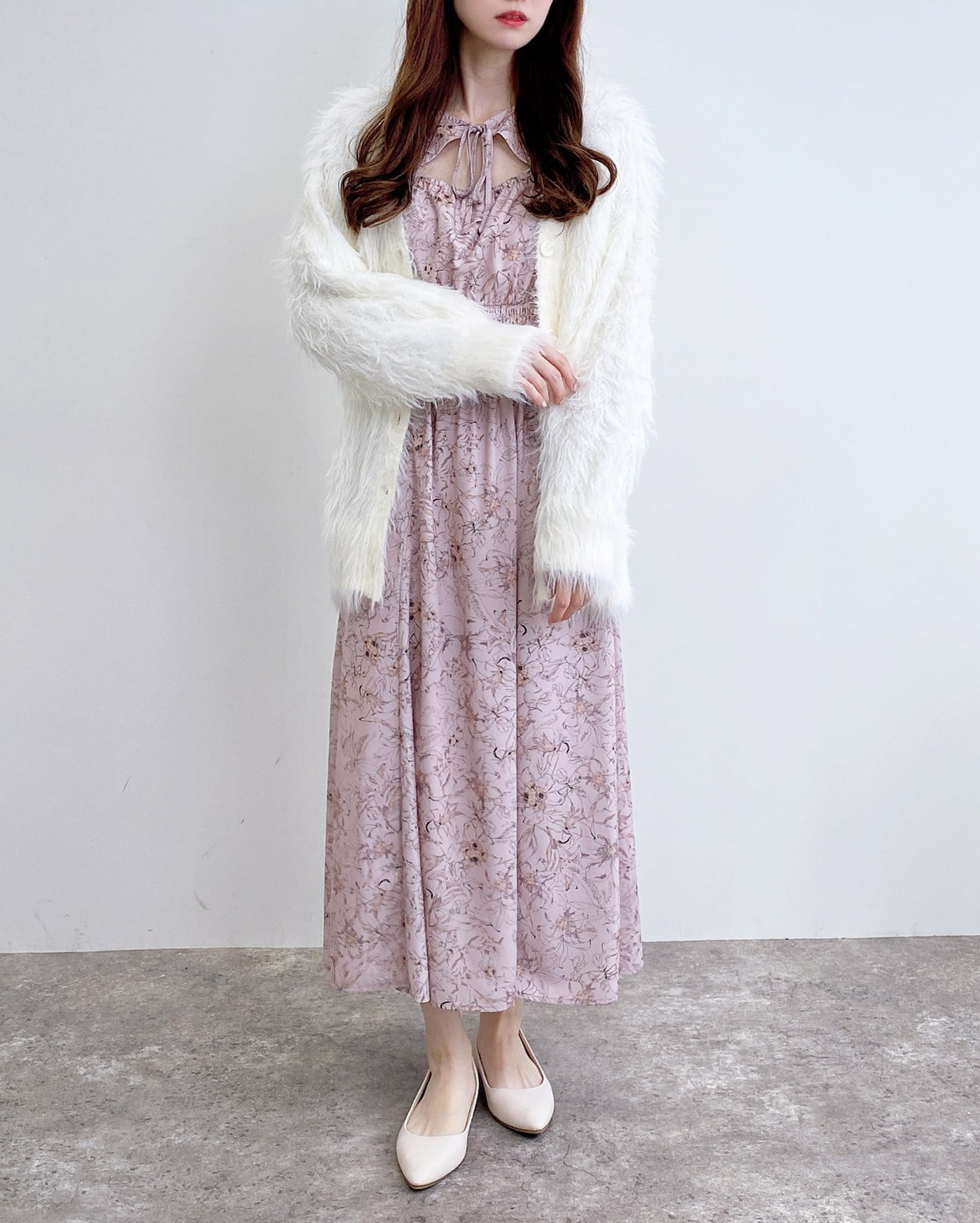人気のデコルテオープンデザイン×フェミニンな花柄が大人かわいい雰囲気を演出。