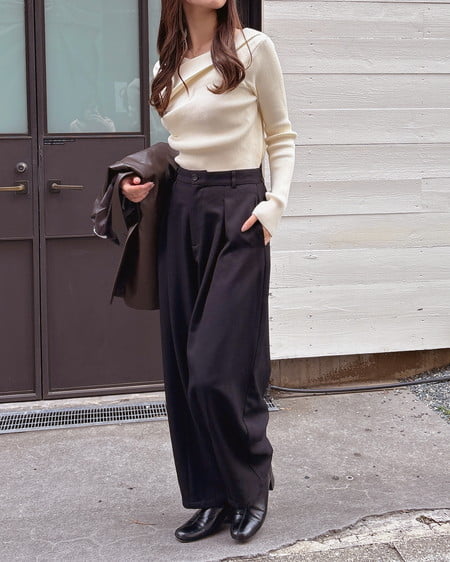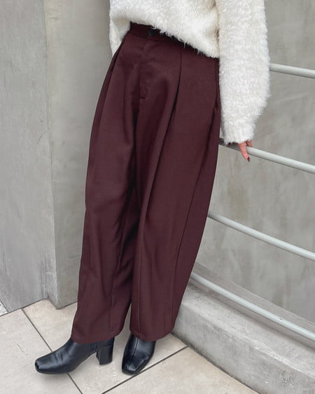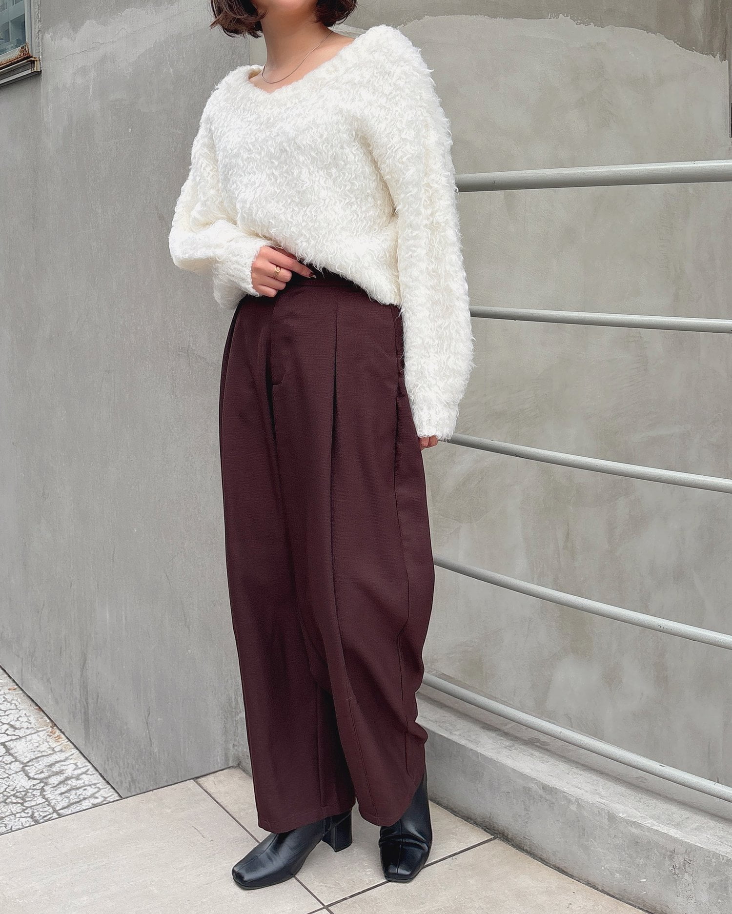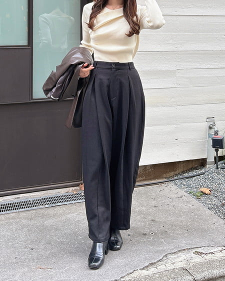 ボリュームのあるコクーンシルエットのキレイめパンツ。