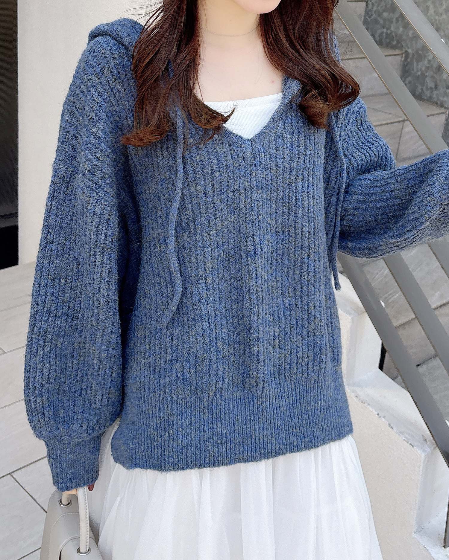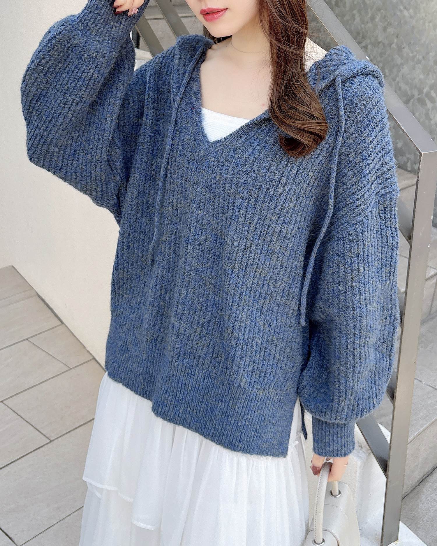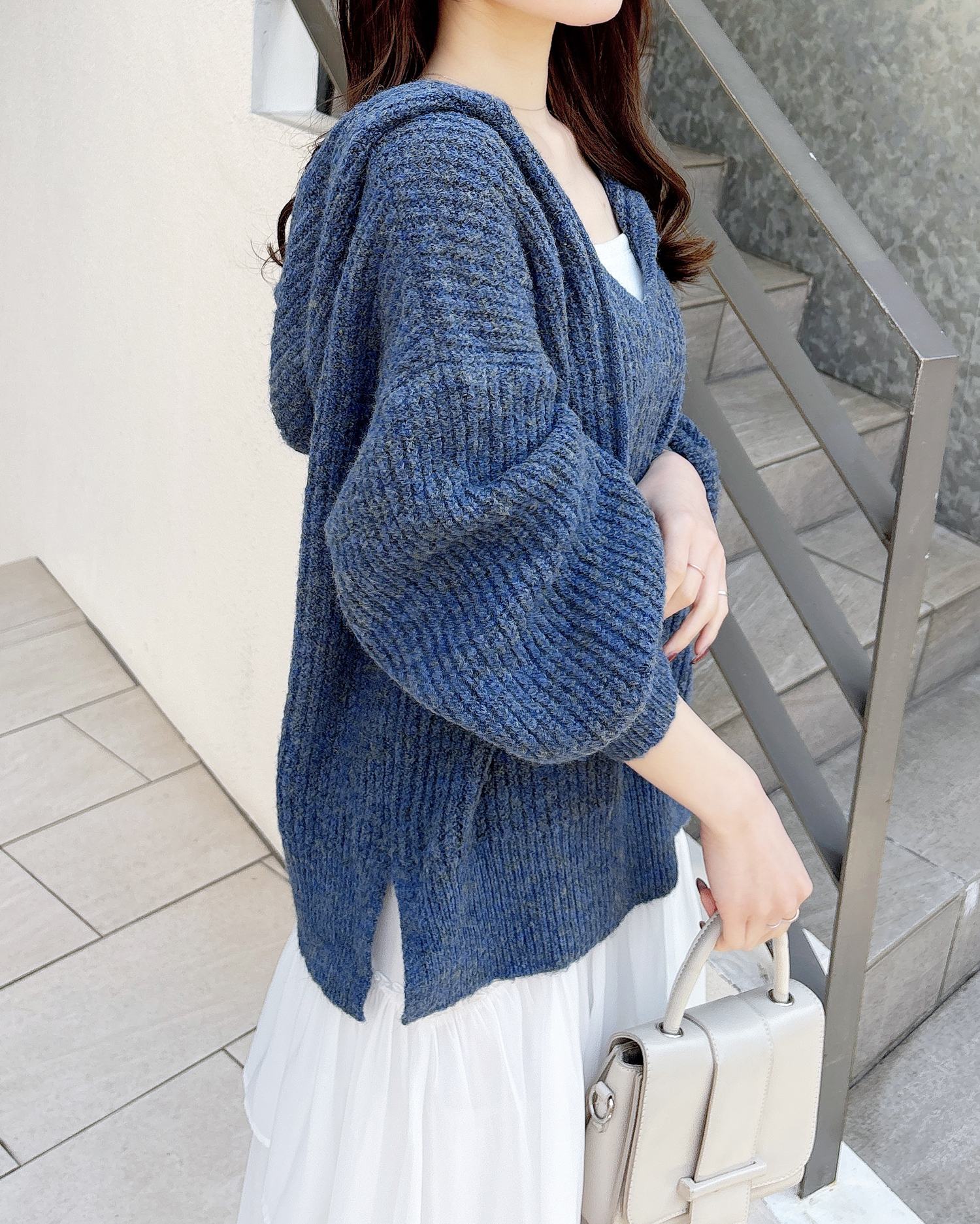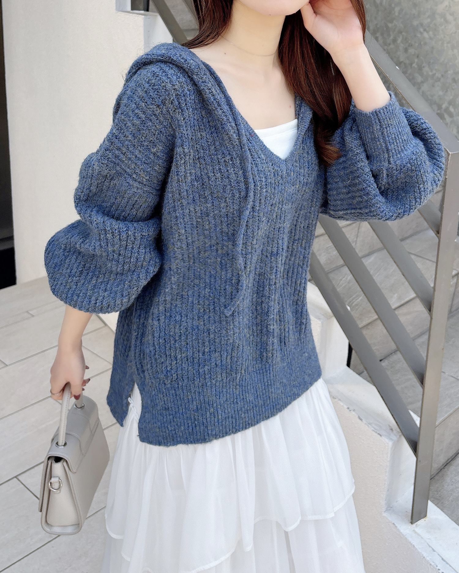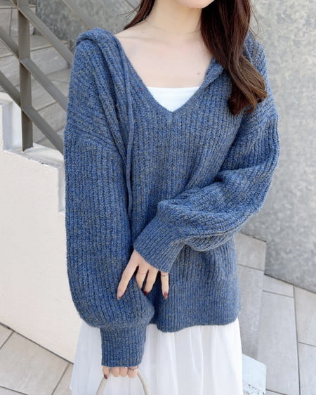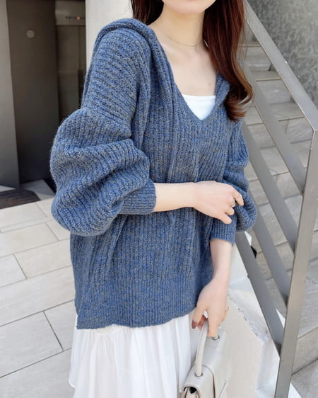 大きなフードがポイントの大人カジュアルなニットパーカーです。
