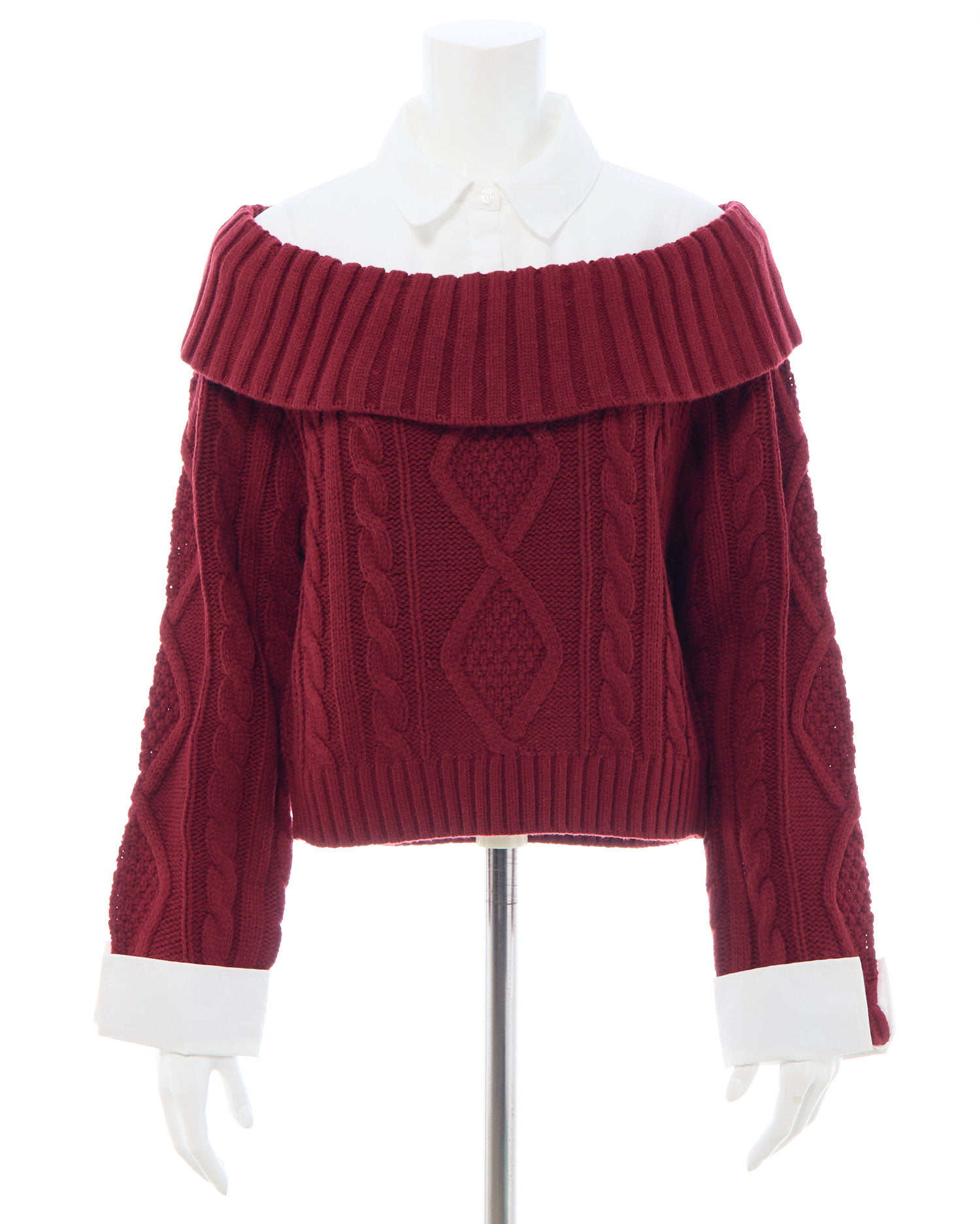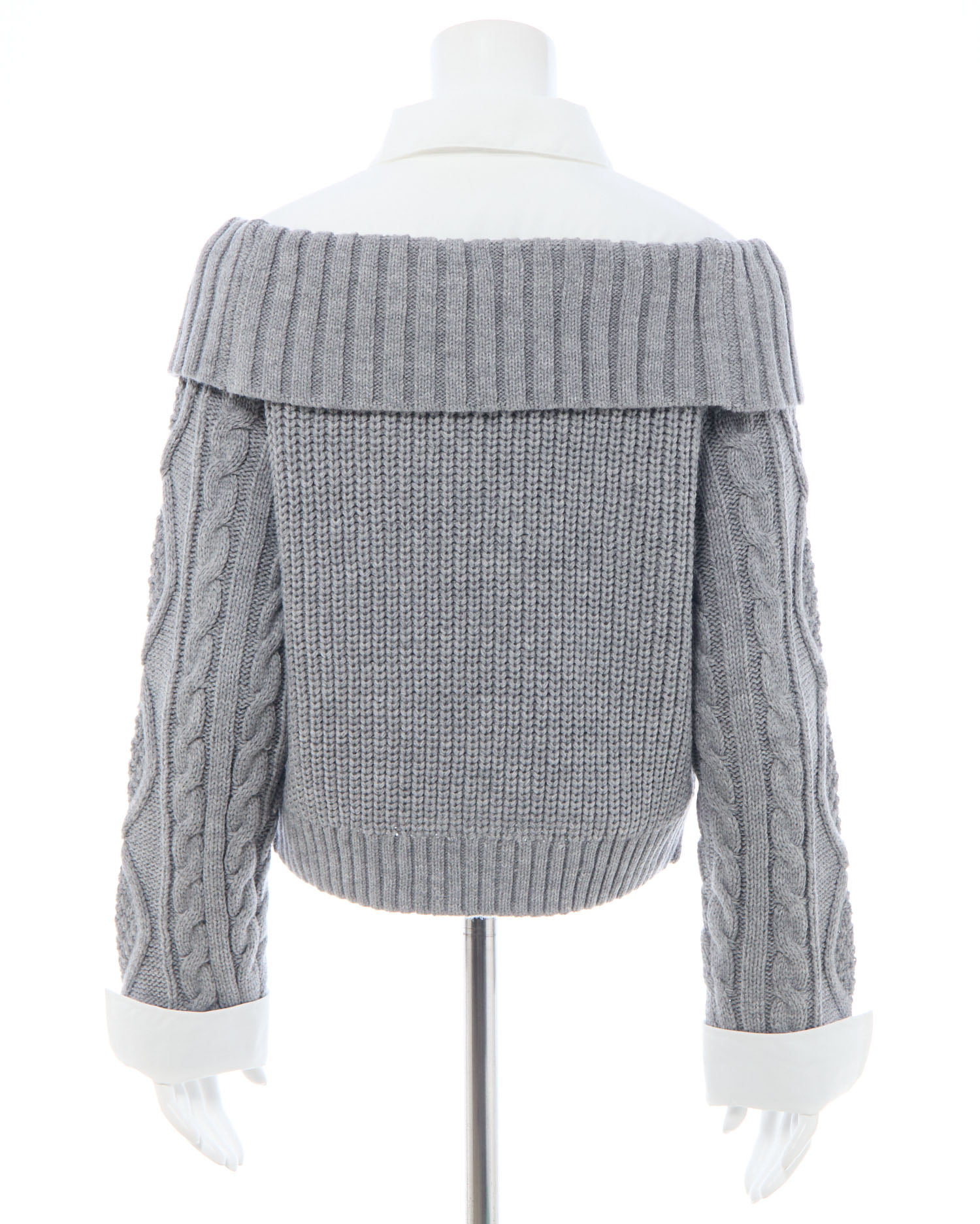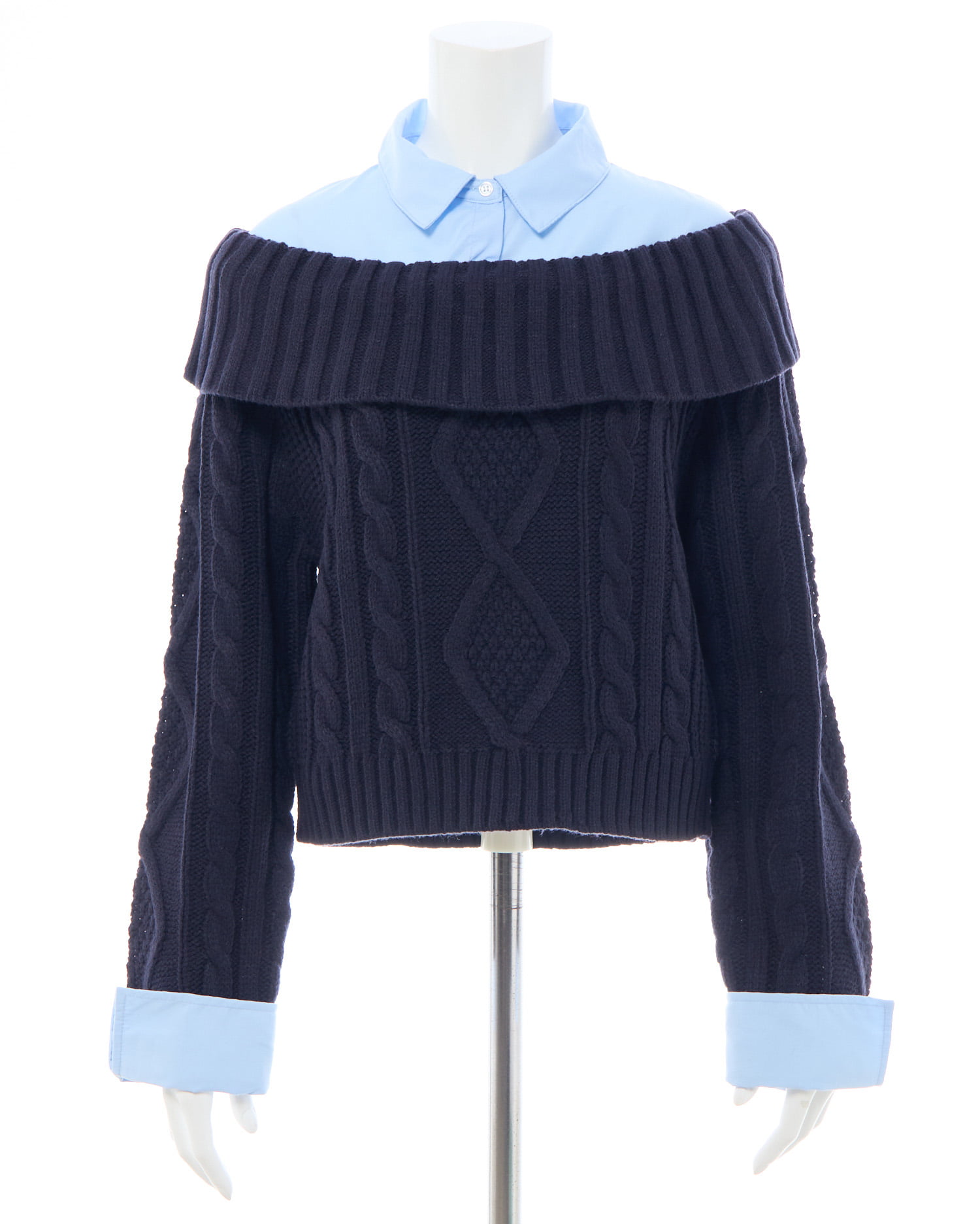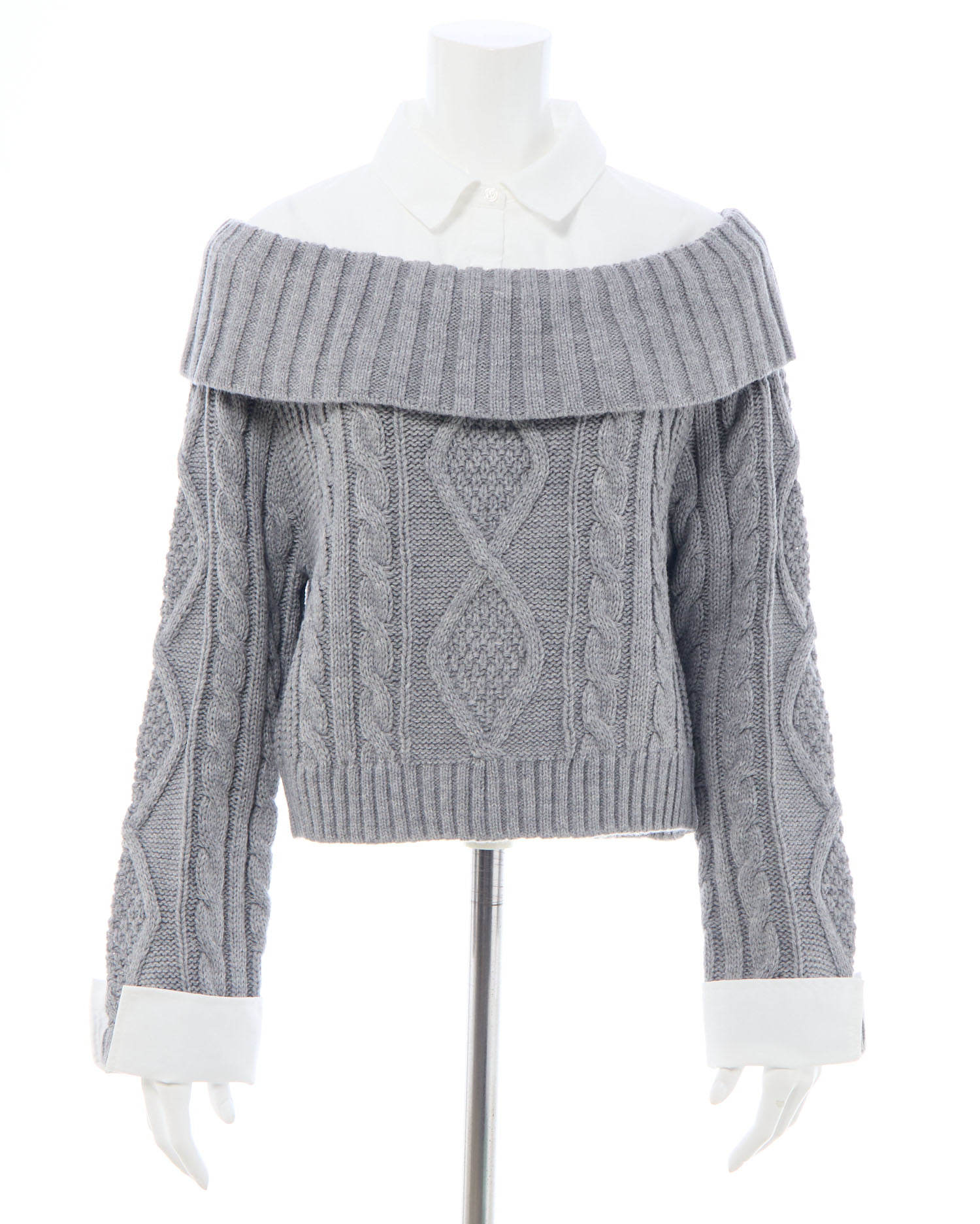 ケーブル編みオフショルニットの首元と袖部分にシャツがレイヤードされたデザインです。