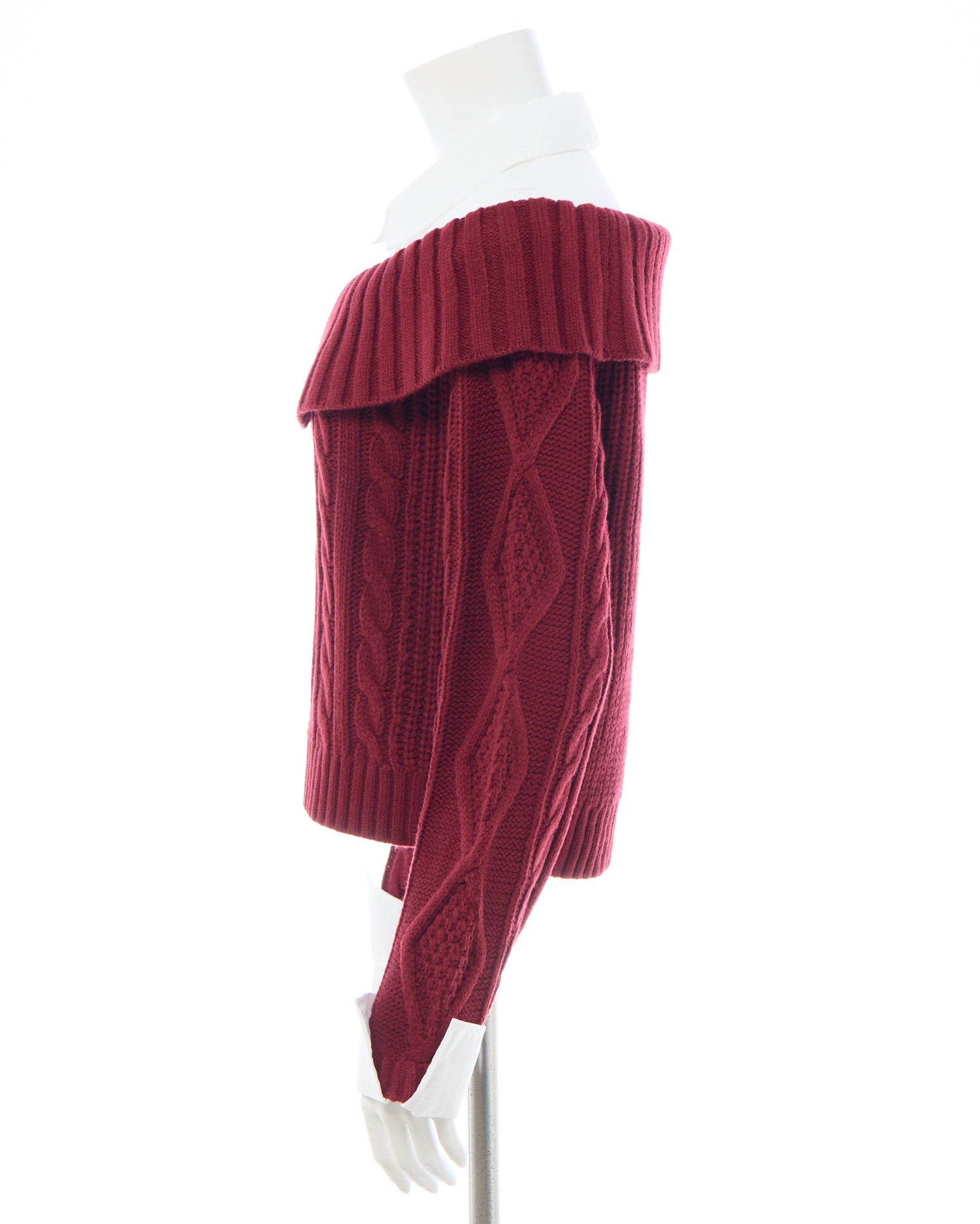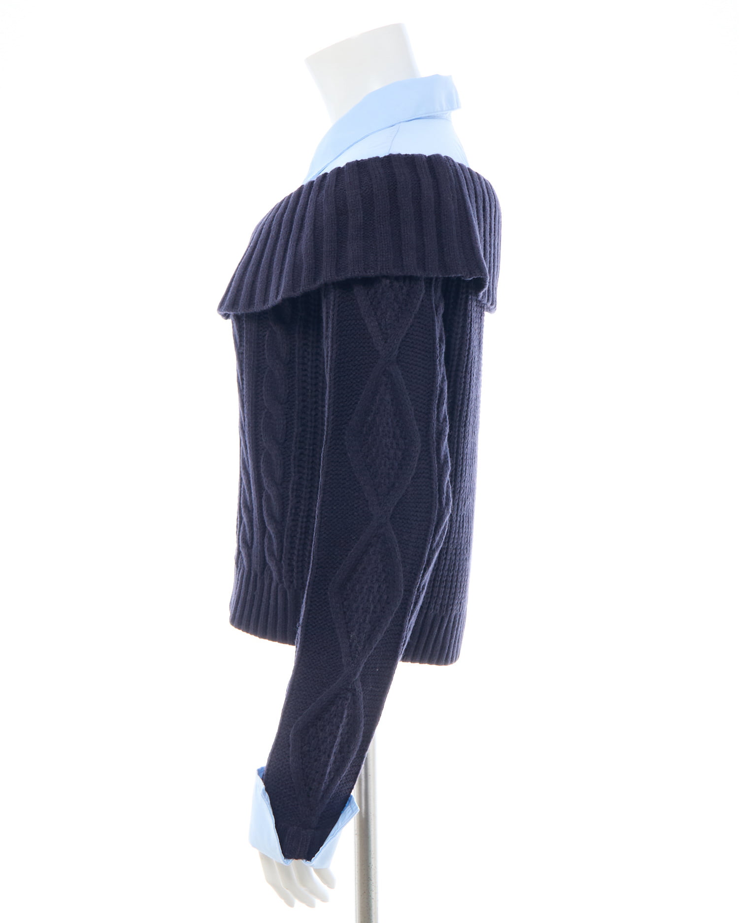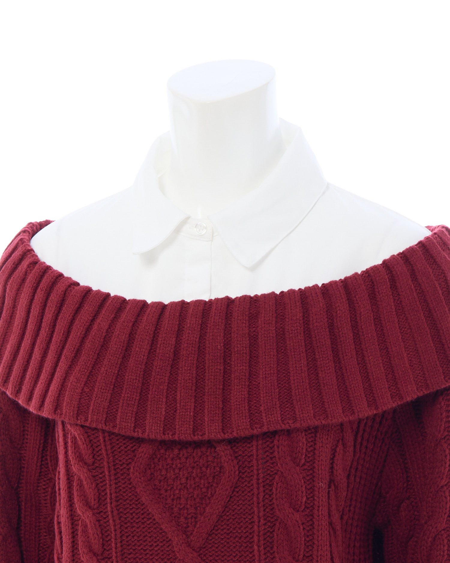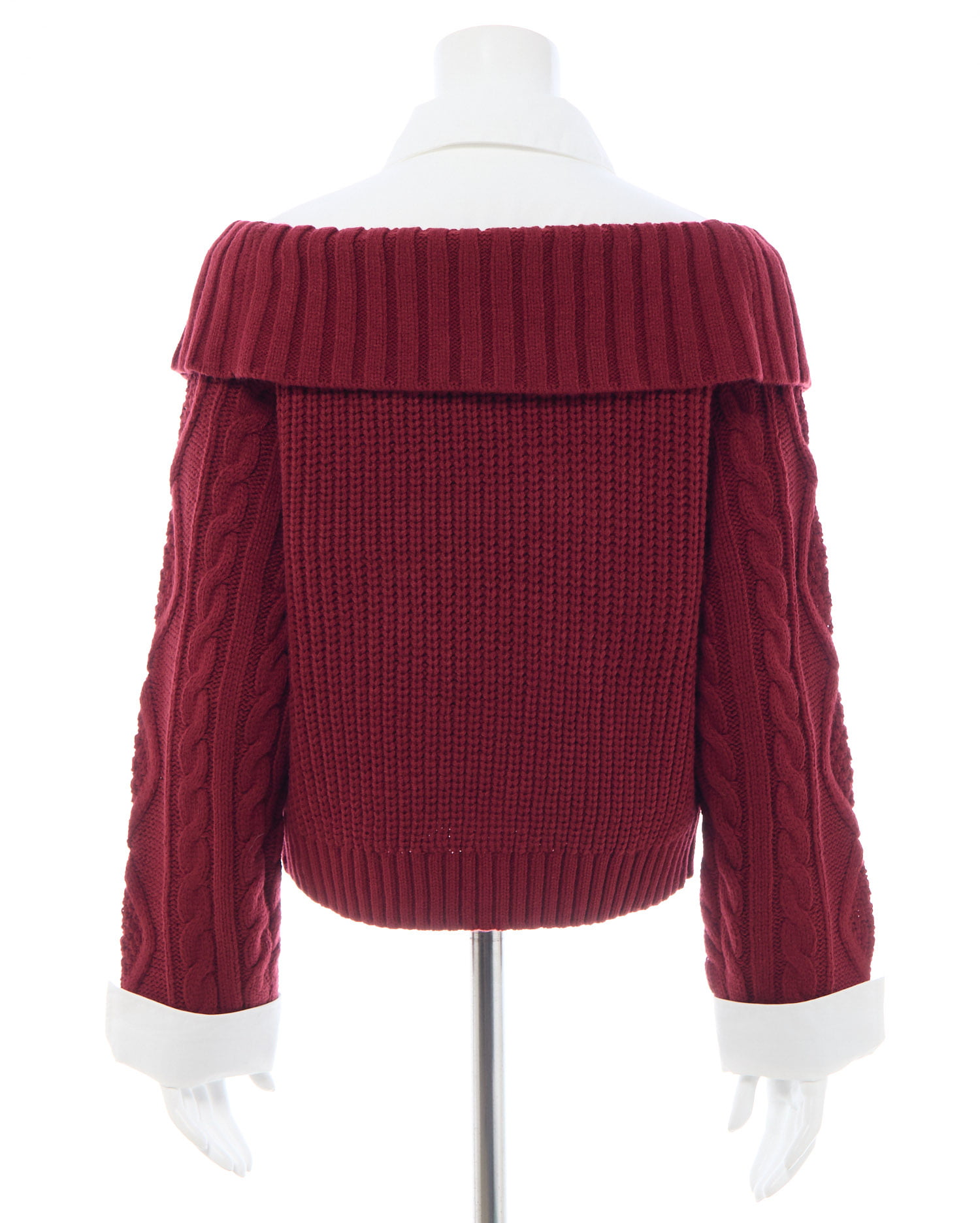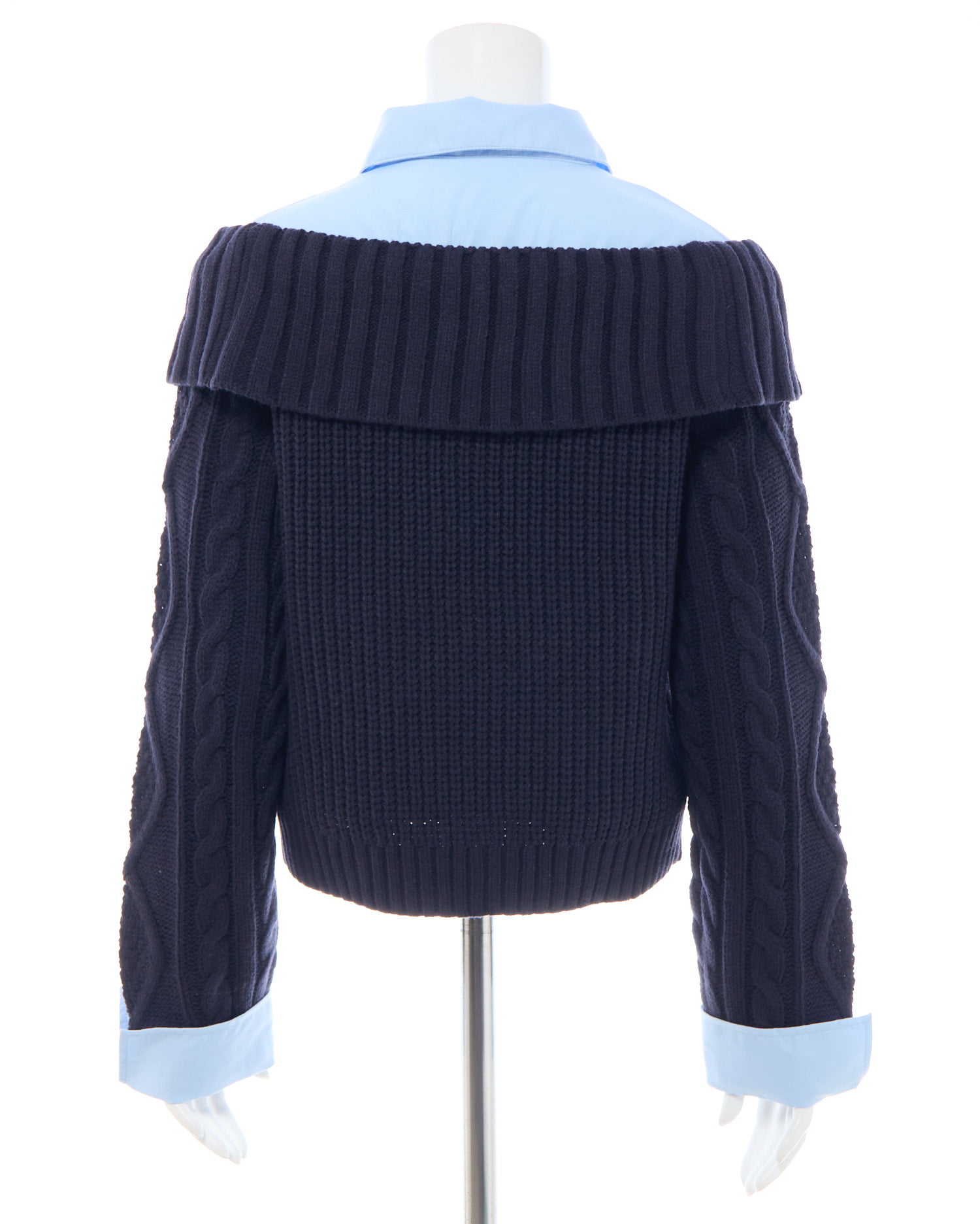 ケーブル編みオフショルニットの首元と袖部分にシャツがレイヤードされたデザインです。