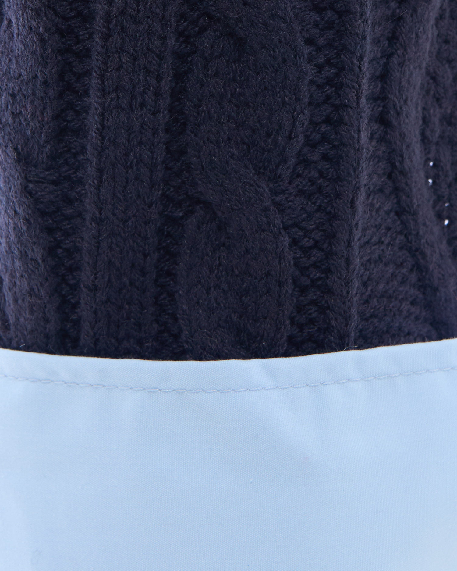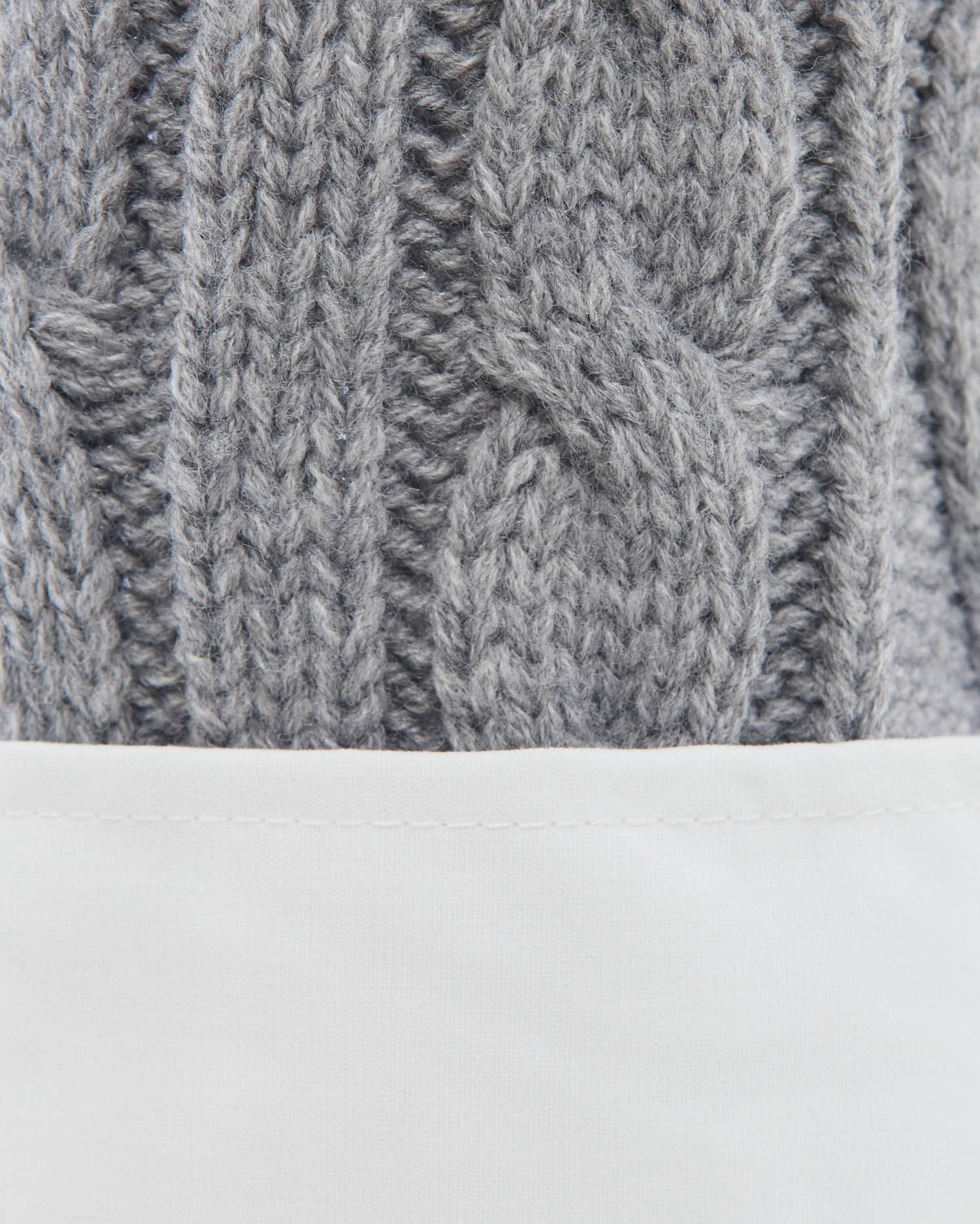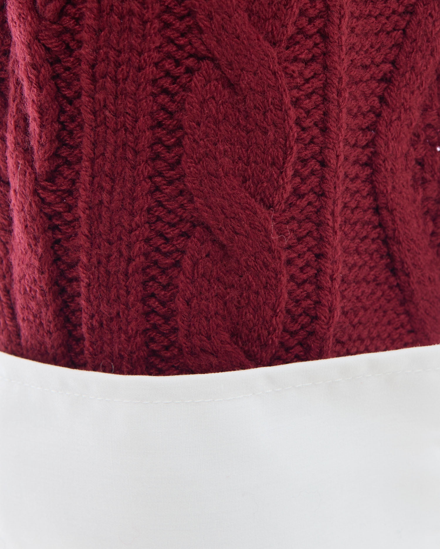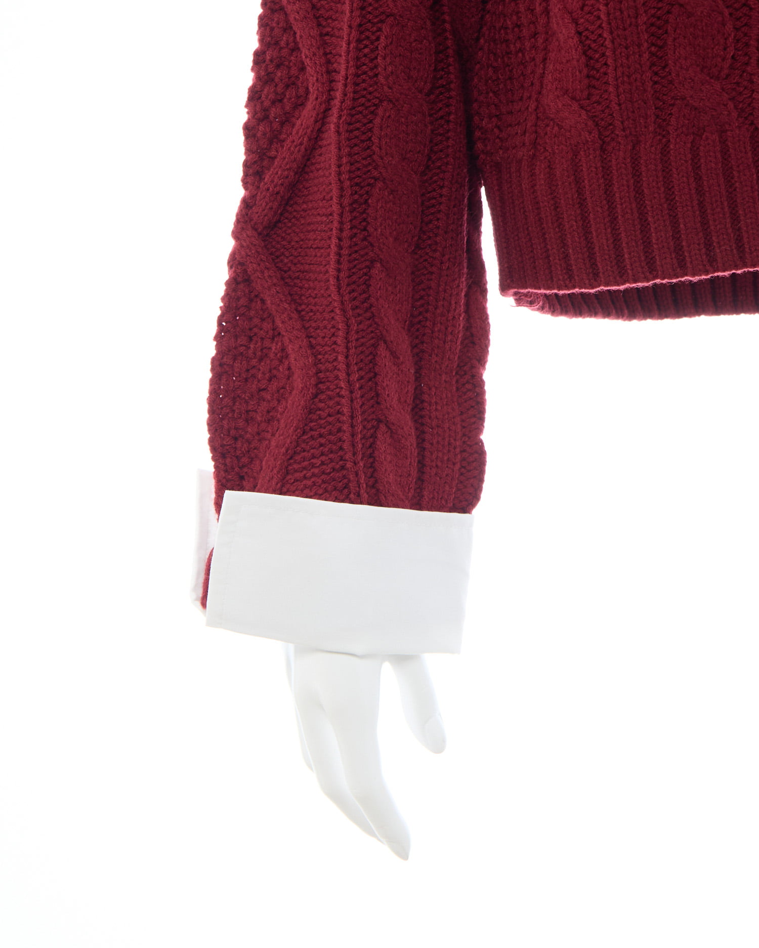 ケーブル編みオフショルニットの首元と袖部分にシャツがレイヤードされたデザインです。