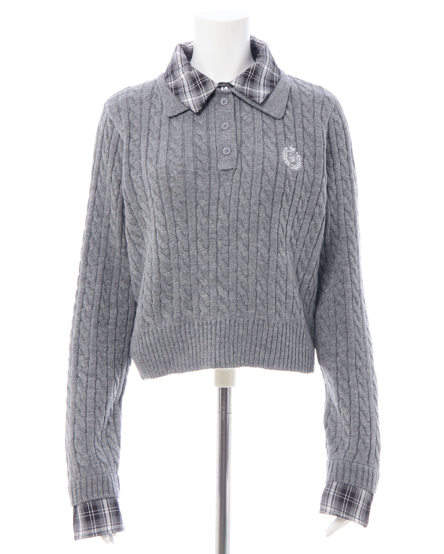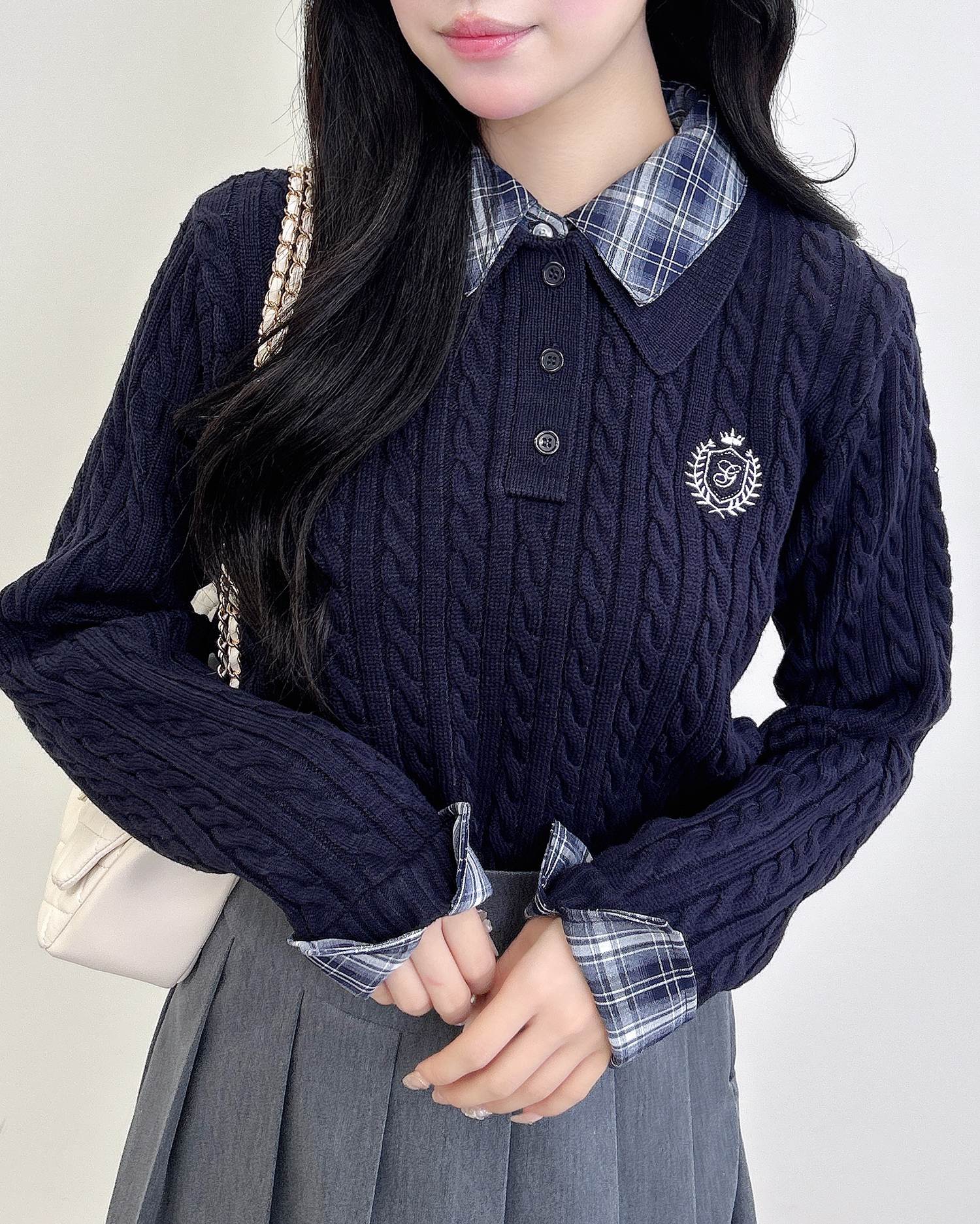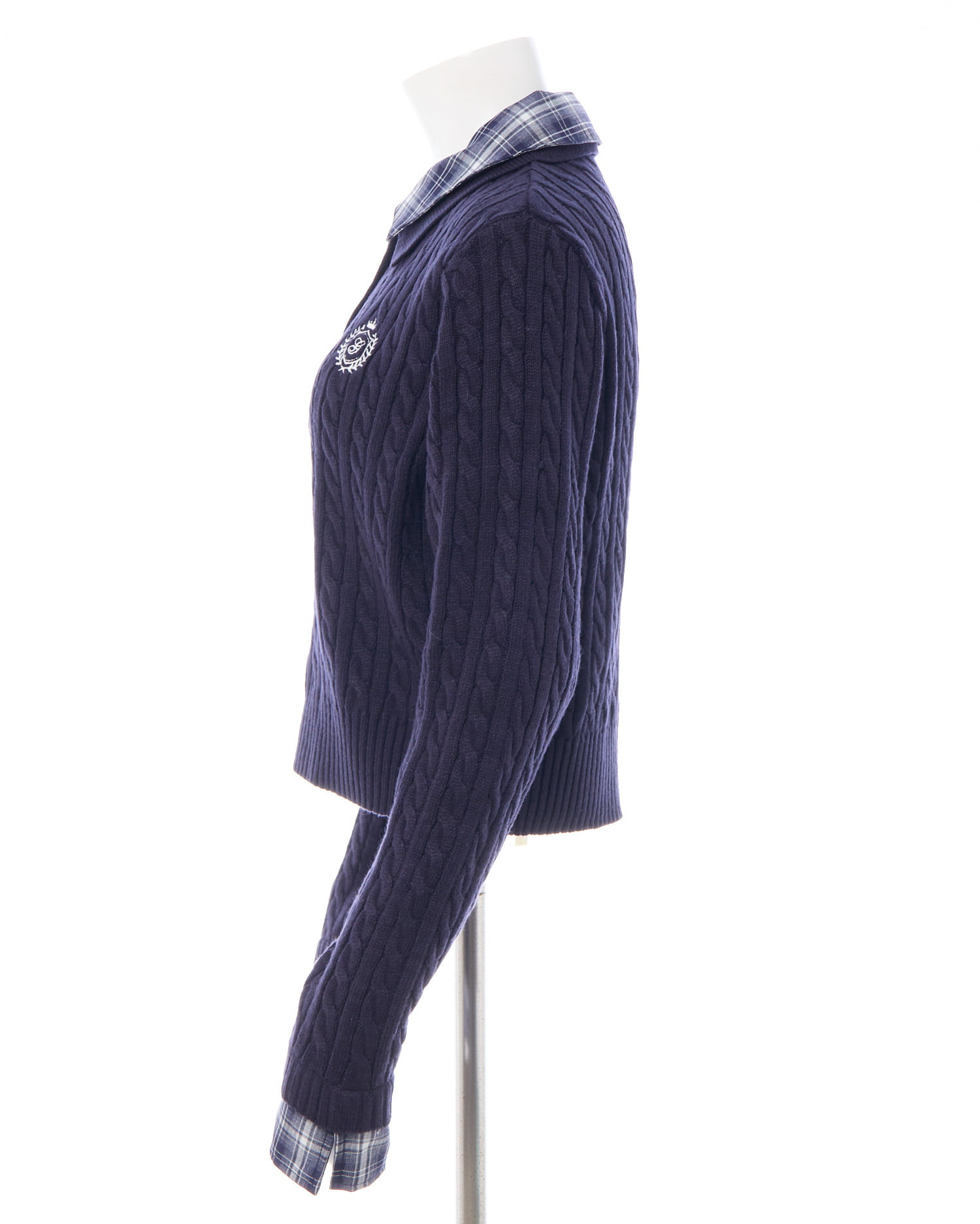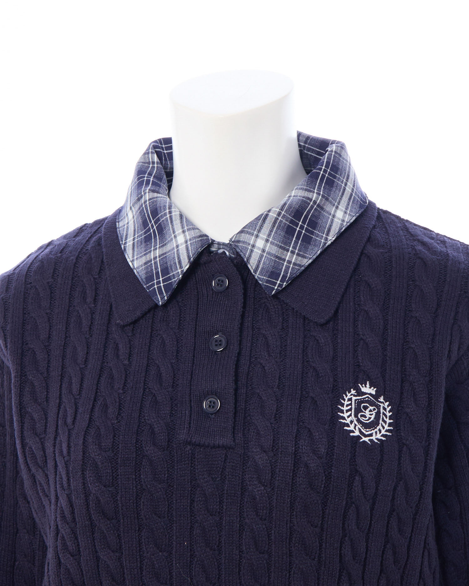 細めのケーブル編みと胸元のエンブレム刺繍がスクールライクな1枚です。