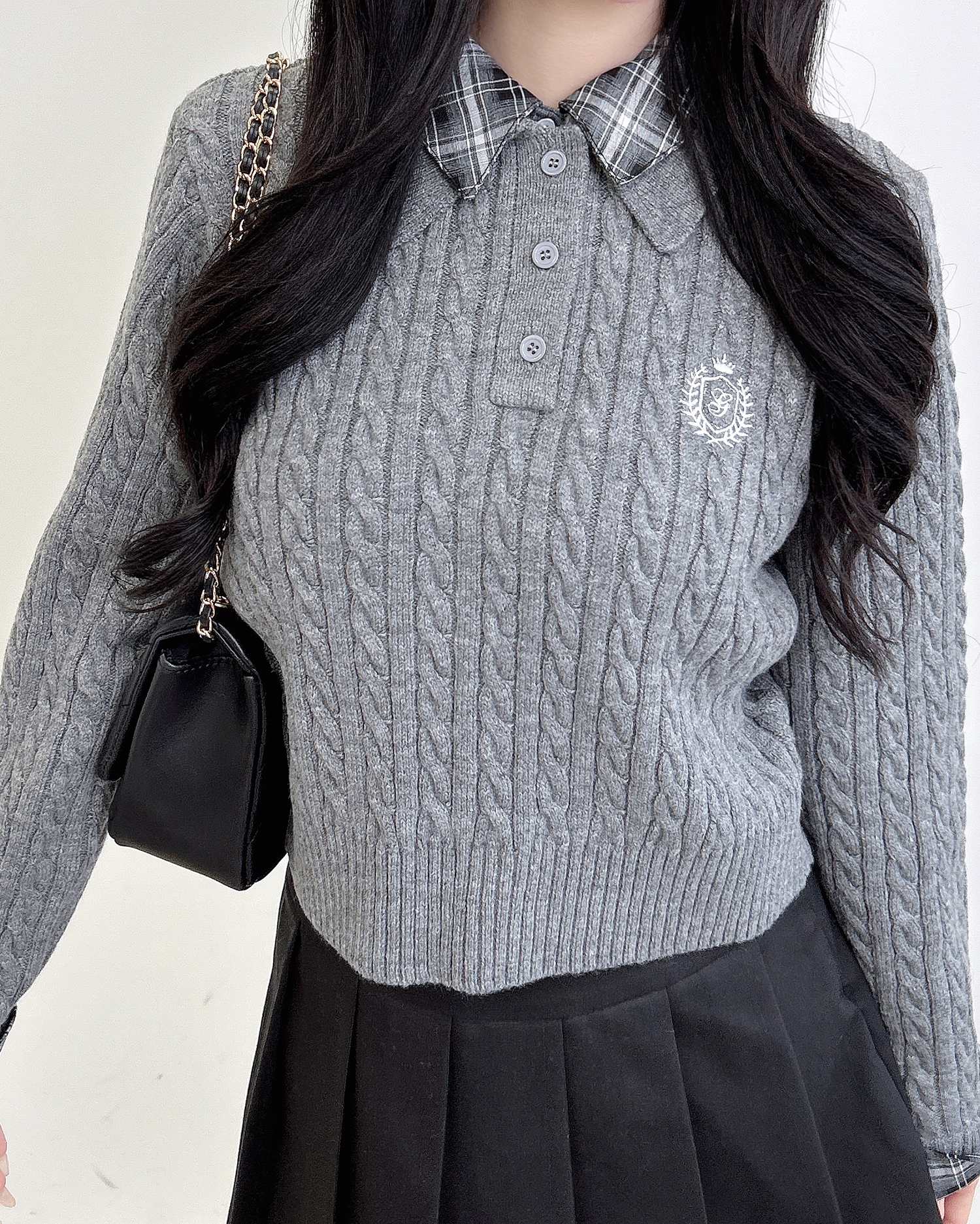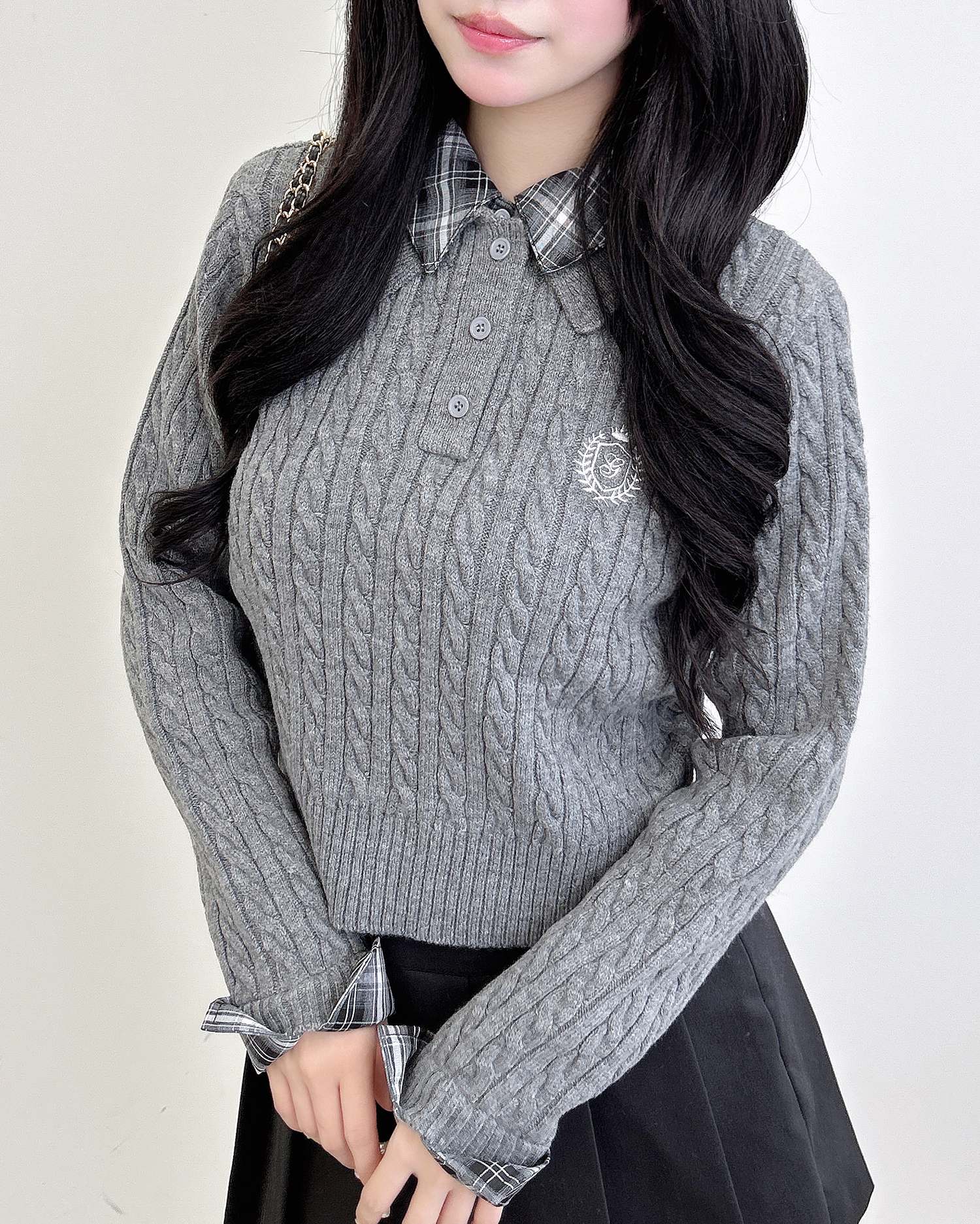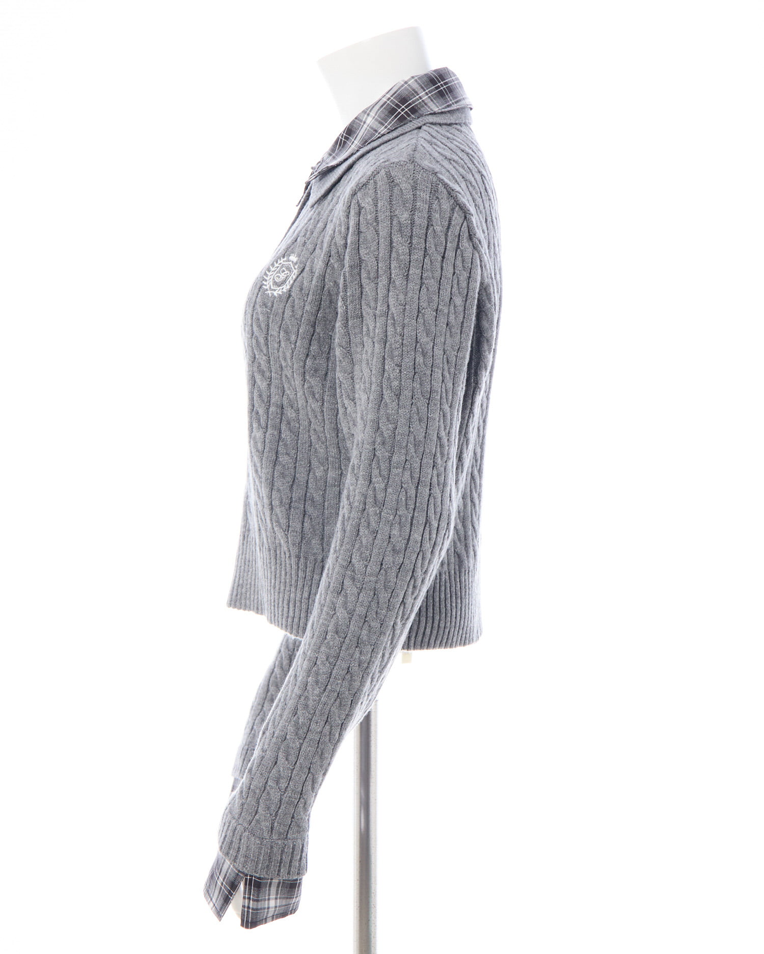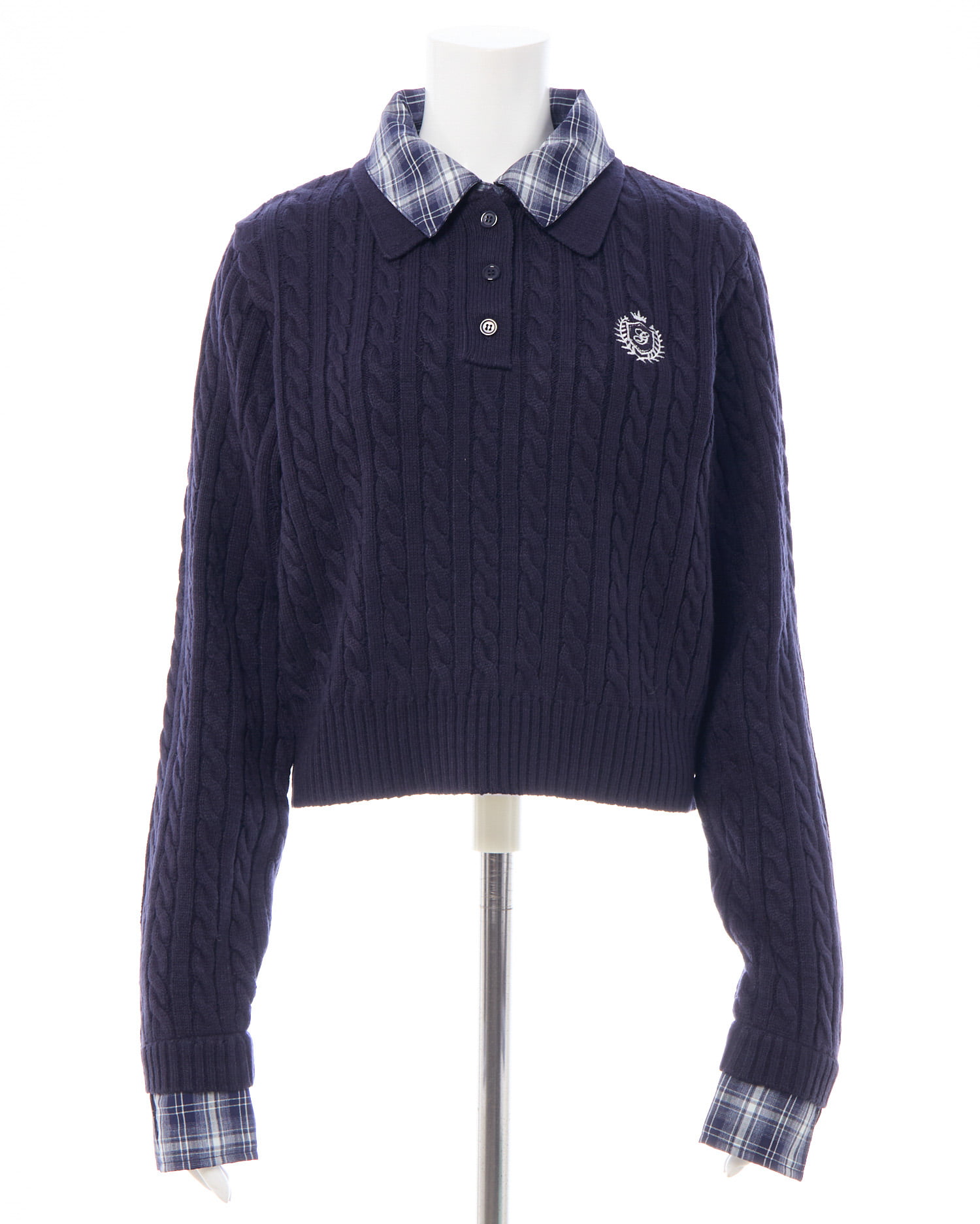 細めのケーブル編みと胸元のエンブレム刺繍がスクールライクな1枚です。