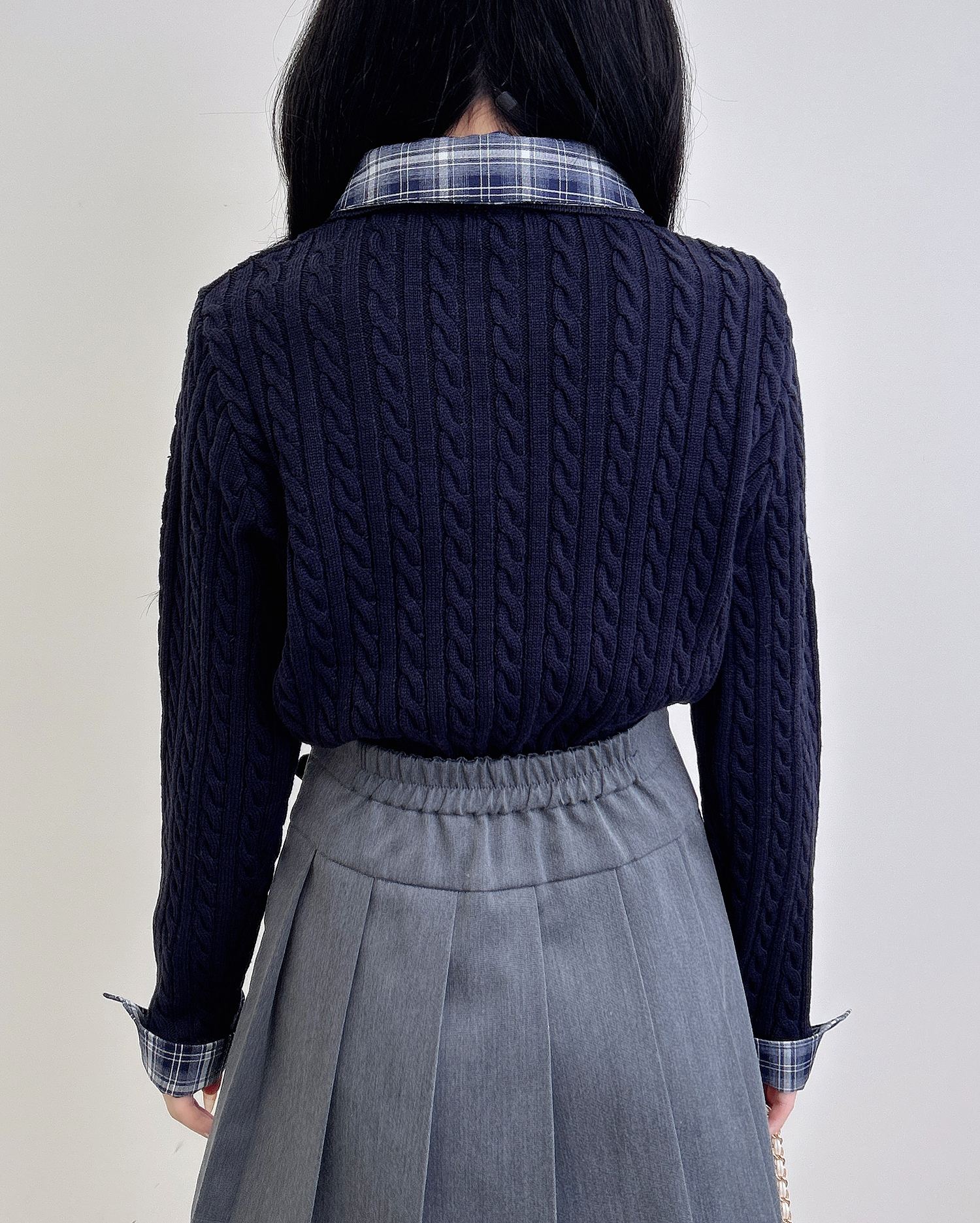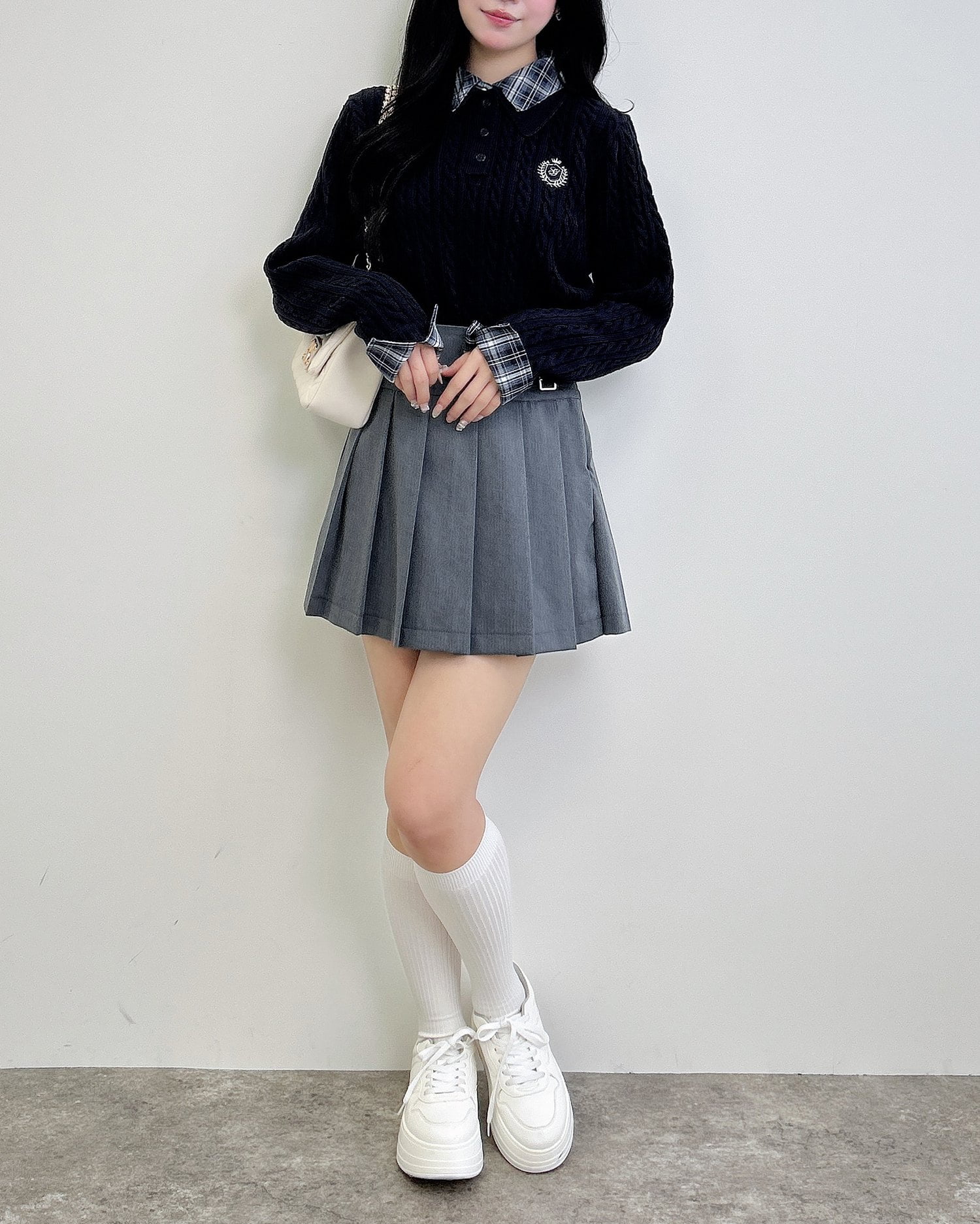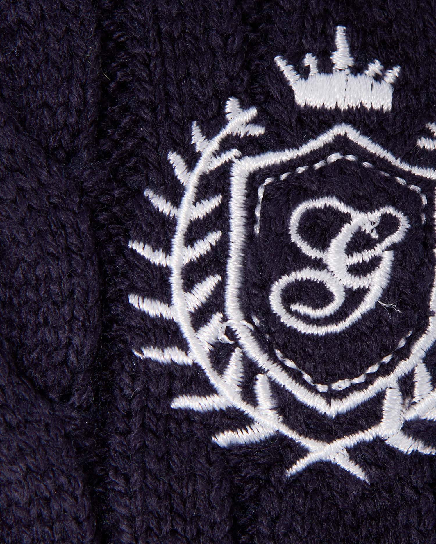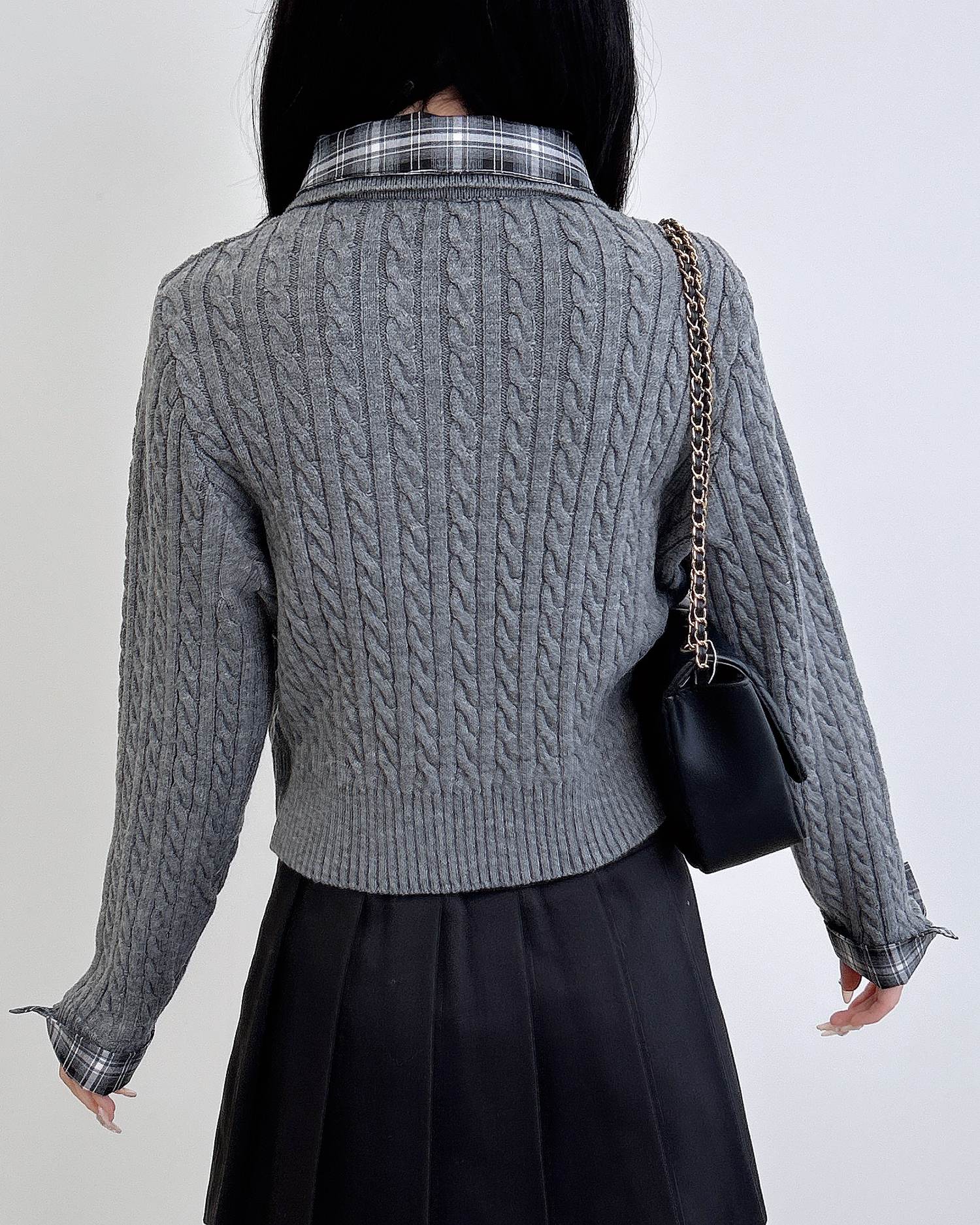 細めのケーブル編みと胸元のエンブレム刺繍がスクールライクな1枚です。