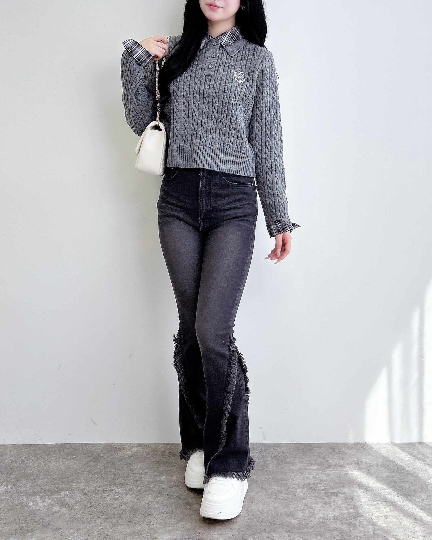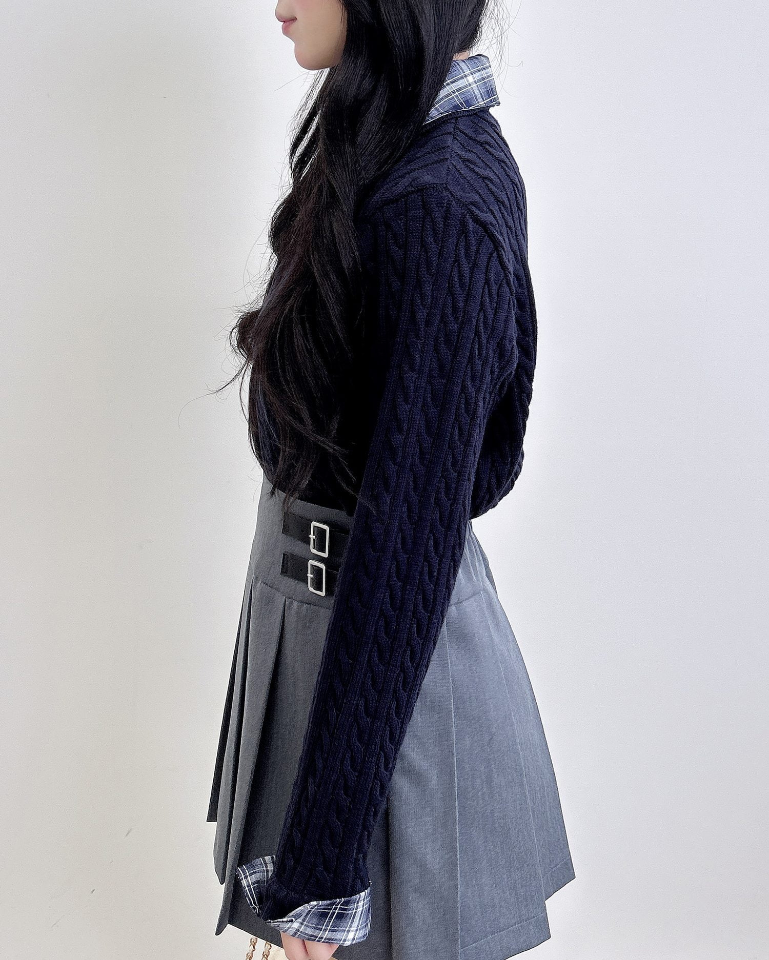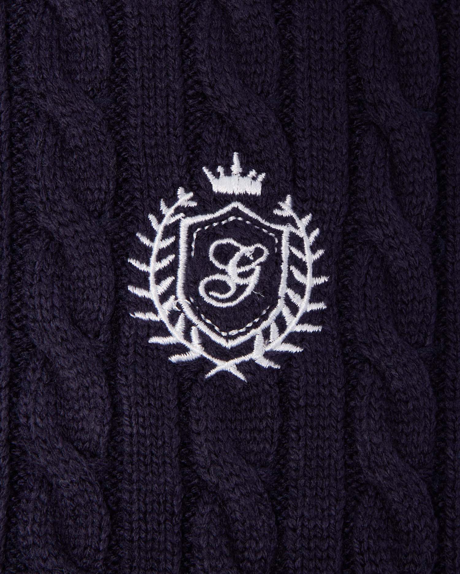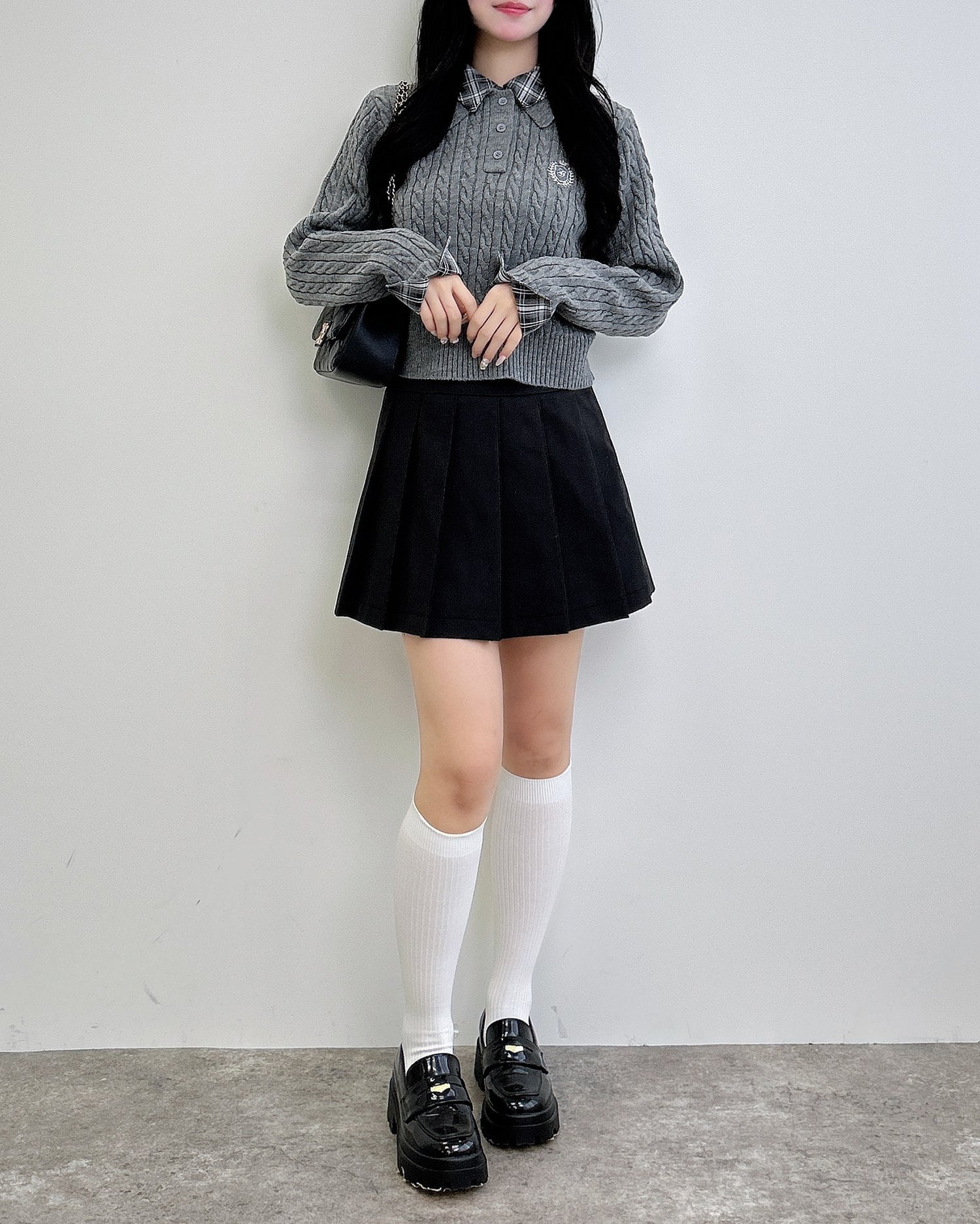 細めのケーブル編みと胸元のエンブレム刺繍がスクールライクな1枚です。